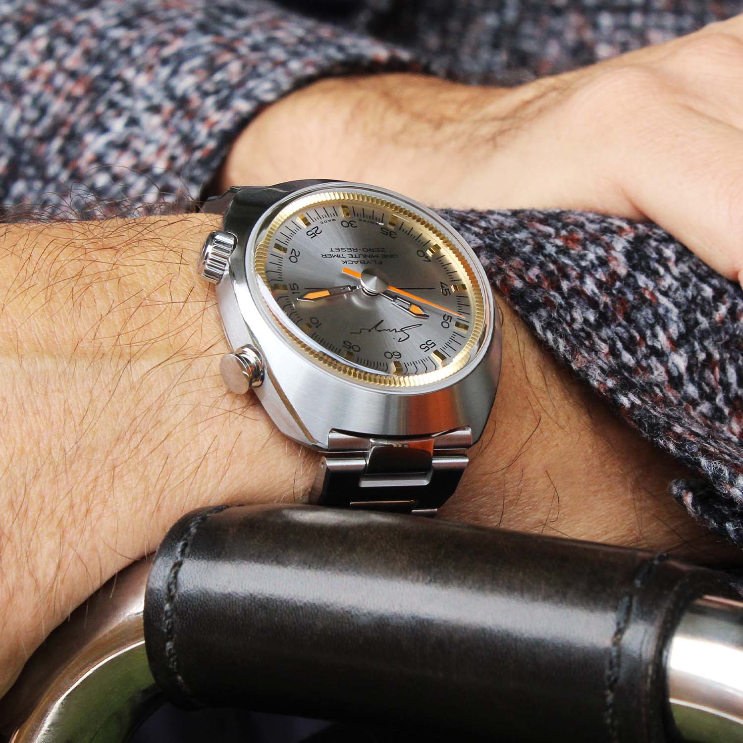 The 1969 Timer with a flyback device is a lesson in complexity distilled to its purest form. A deceptively simple-looking, traditional three-hand watch, the 1969 Timer is a zero-reset timer with flyback function. By activating the pusher at 2 o’clock, the central sweeping seconds hand can be used as a flyback chronograph hand to time one-minute events without going through the start-stop-reset sequence. Available with a matte green dial and bronze case or silvery dial and steel case, the golden mirror-polished indices match the tone of the internal bezel.