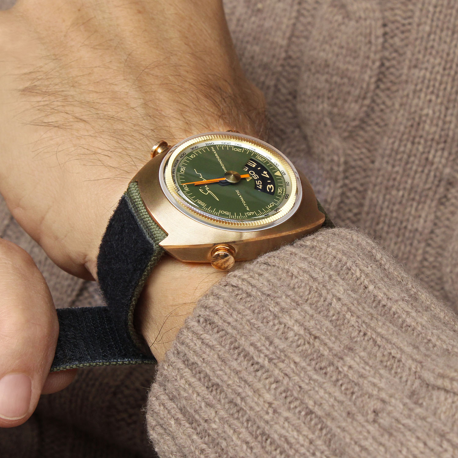 The dial, in matte green for the bronze case and sunray-grey for the steel case, relays the chronograph indications with orange hands.
