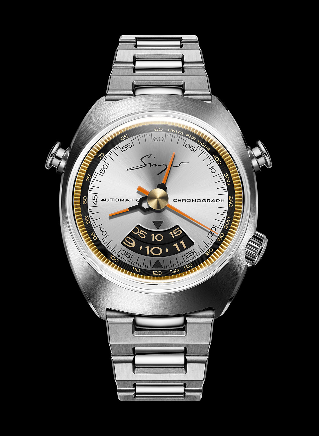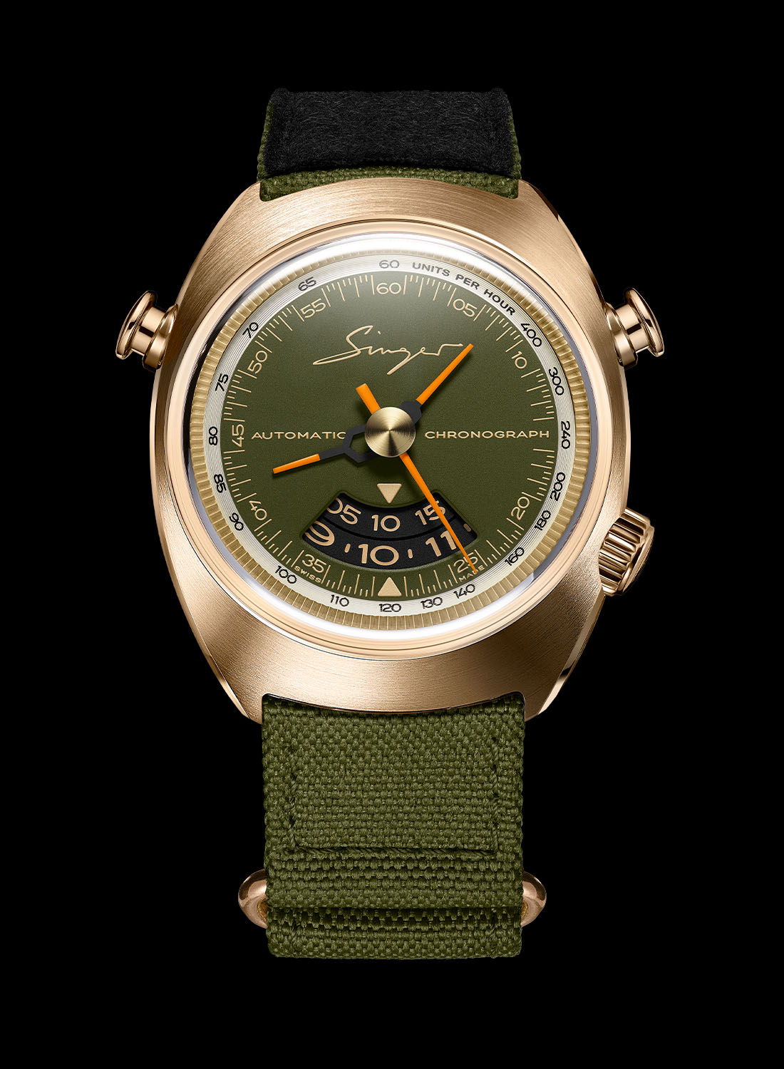 Joining the inaugural black dial versions, the latest 1969 Chronograph and 1969 Timer are revisited in bronze cases (a first for Singer) with matte green dials or steel cases with sunray-grey dials. The 100m water-resistant cases alternate circular and straight brushed surfaces with polished bevels.