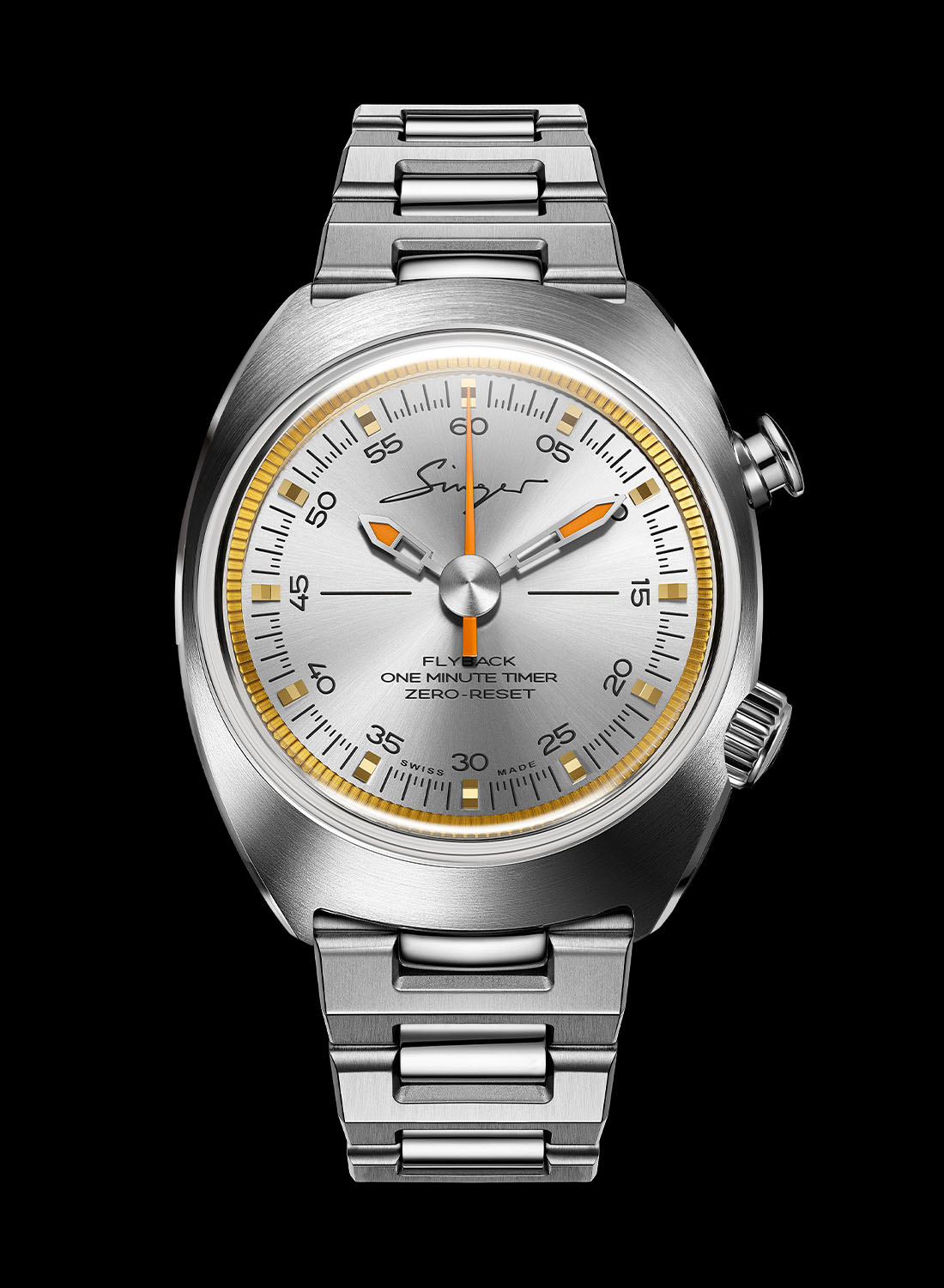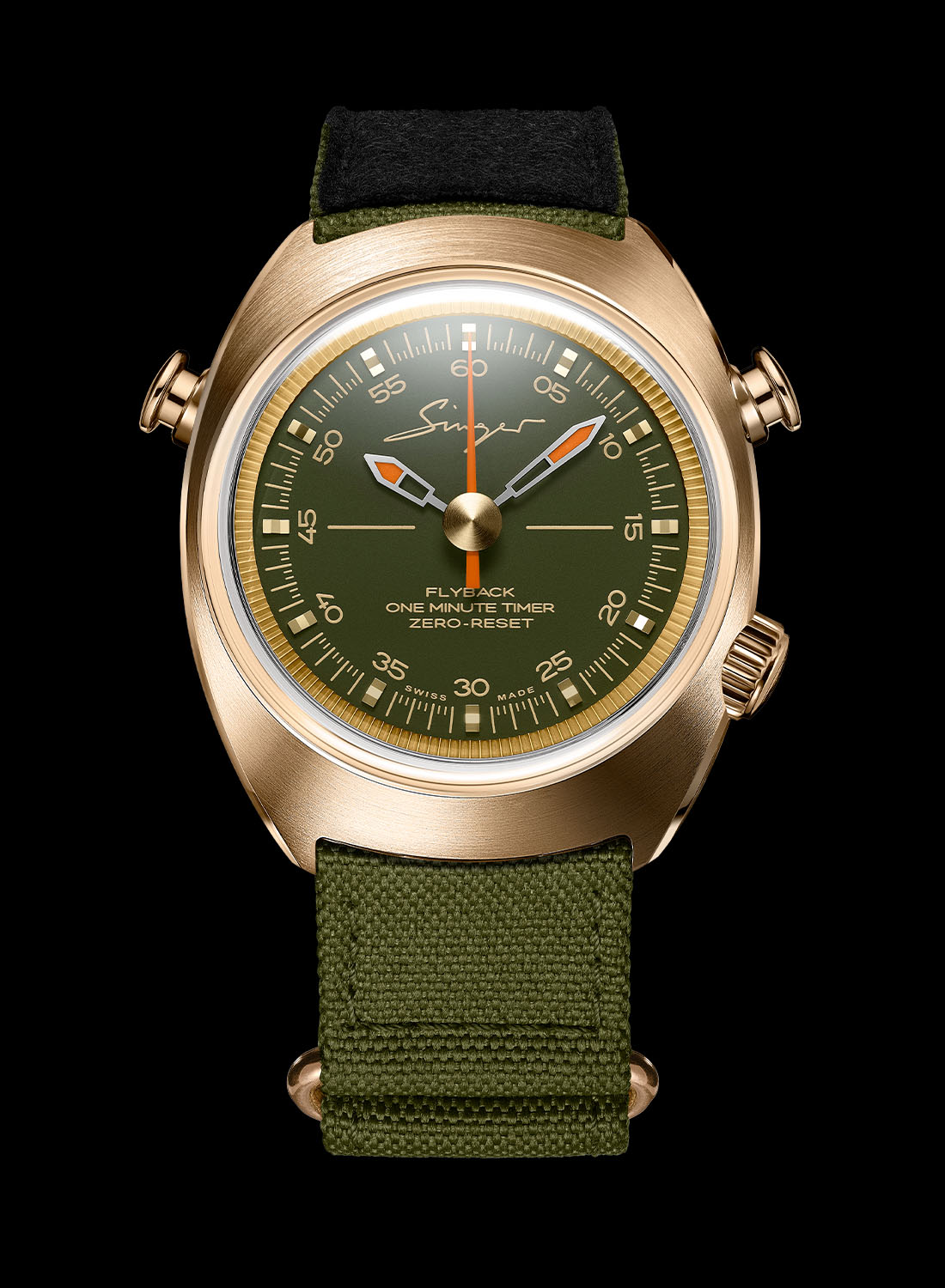 Quick facts: 40mm x 13.8mm – stainless steel or bronze – 100m water-resistant – silver sunray or matte green dial – central seconds hand with zero-reset flyback mechanism – Singer calibre 6363, manual-winding, 3Hz, 72h power reserve – steel CHF 31,500 (excl. tax) bronze CHF 32,500 (excl. tax)