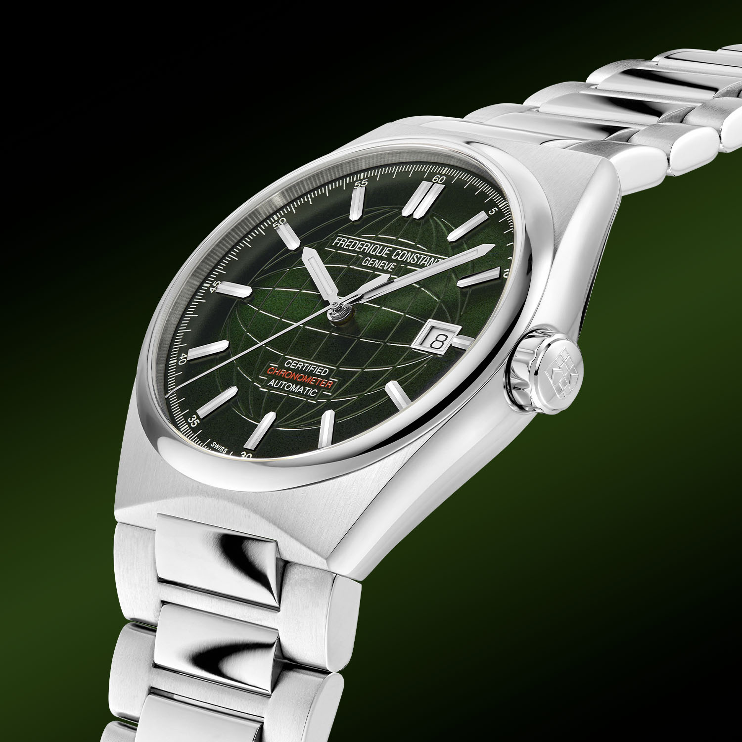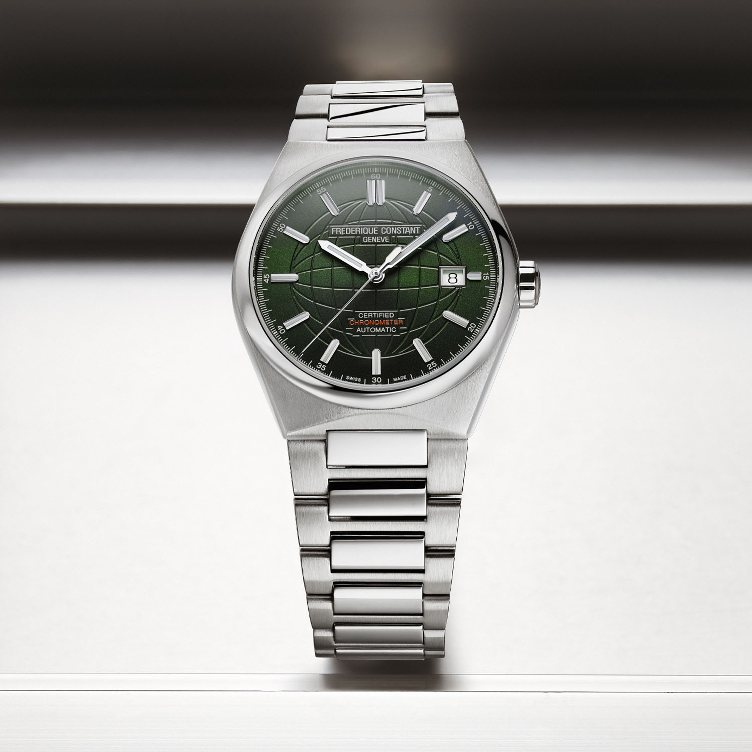 This is not the first blue dial to join the Automatic COSC collection, but it has a different tone. Less saturated, verging on an almost blue-black shade, the details on the dial stand out clearly. The green model follows suit and features a dark forest green tone for the dial. Decorated with the signature engraved globe of the Highlife collection, the tips of the applied and elongated hour indices alight on the perimeter of the globe. The baton hour and minute hands and the hour markers are treated with Super-LumiNova; the index at 3 o’clock is shortened to accommodate the framed date window with a white background. A white minutes track, indicated by the central seconds hand, completes the functionality.