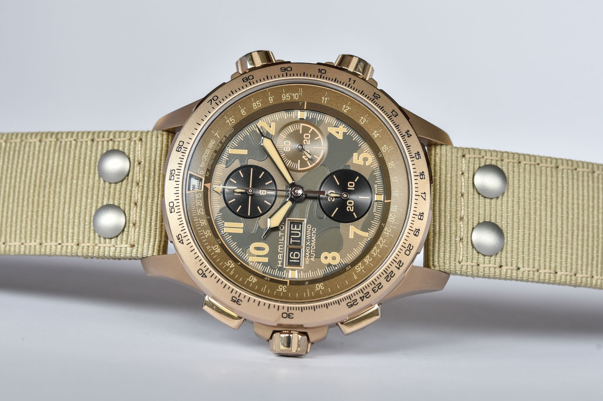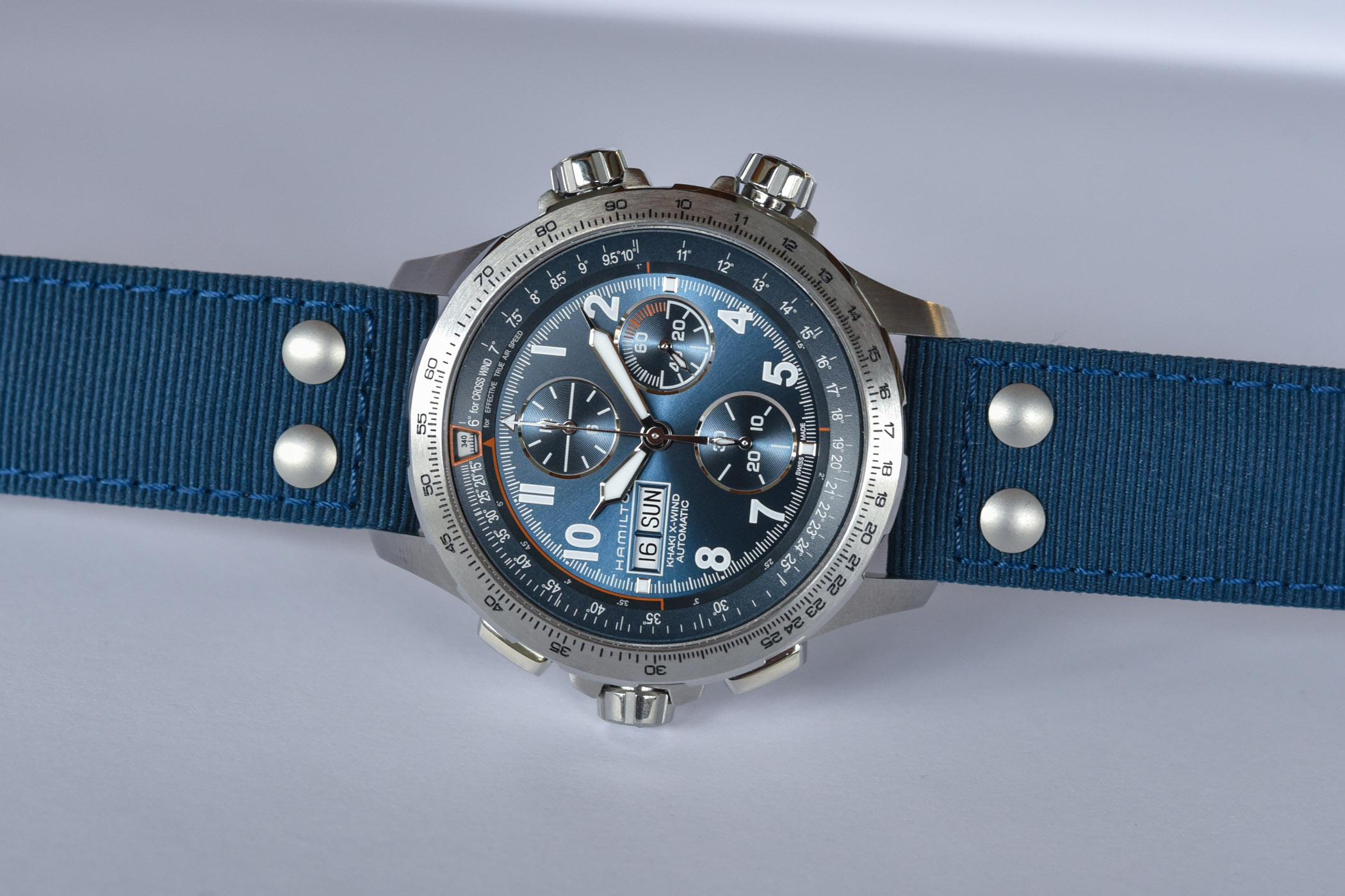 The inner and outer bezels work together to perform the required calculations. The crown 4 o’clock operates the upper internal bezel, while the crown at 2 o’clock operated the lower internal bezel. A window in the upper emphasizes the indication that is displayed by the lower bezel. The external bezel needs to be aligned properly to make the necessary calculations. You need information like wind speed and direction, as well as an understanding of geographical versus magnetic bearings to make full use of this. To help in this task, Hamilton provides a proper explanation on how to do that in the manual that comes with the watch.