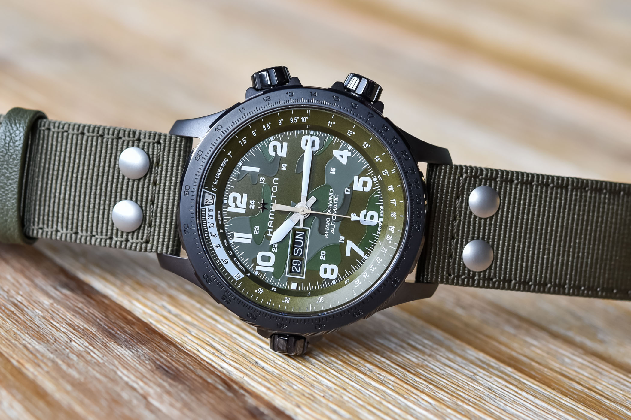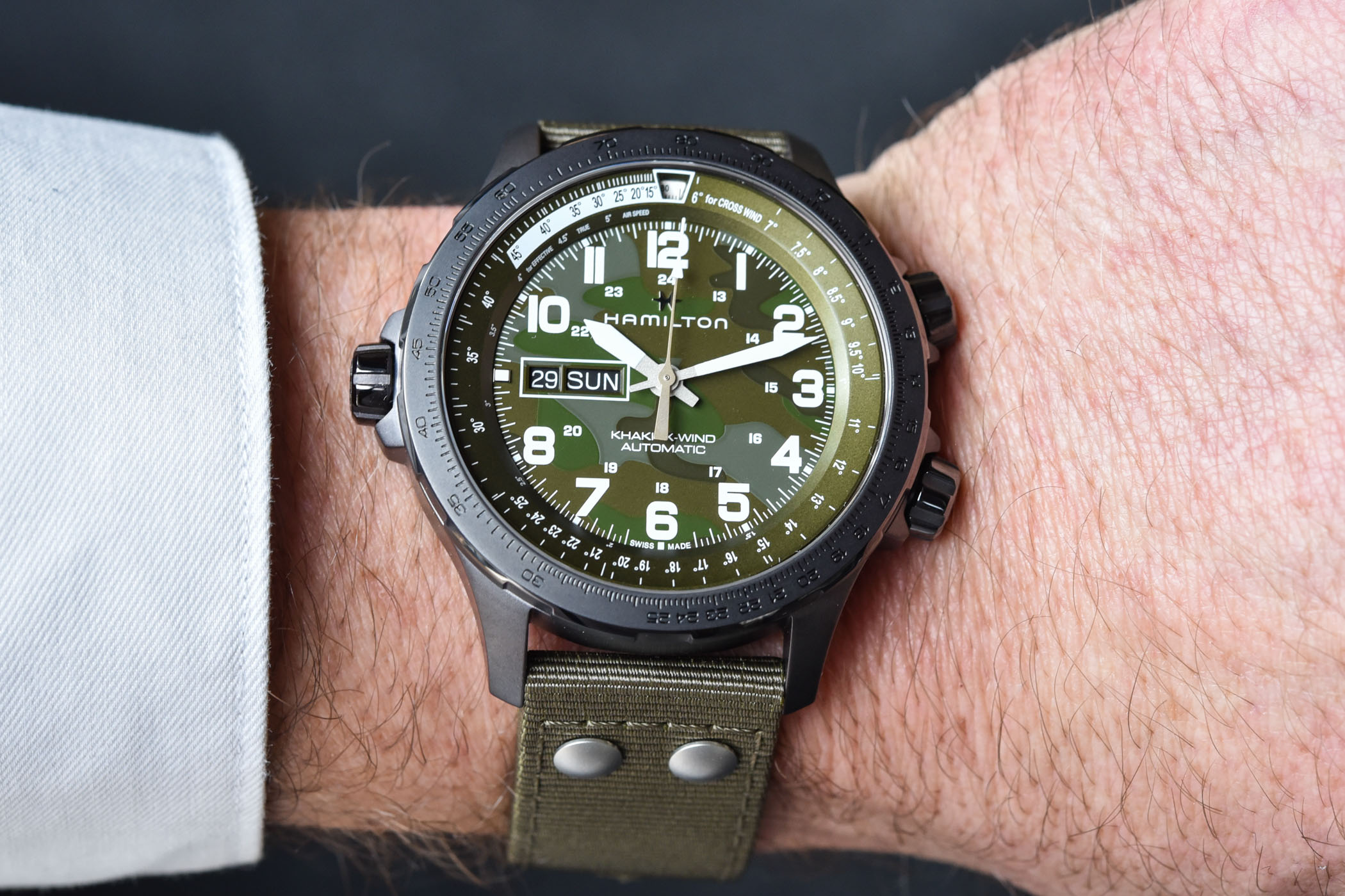 The green camouflage edition of the Hamilton Khaki Aviation X-Wind Day-Date (ref. H77775960) is now available and priced at EUR 1,145.
