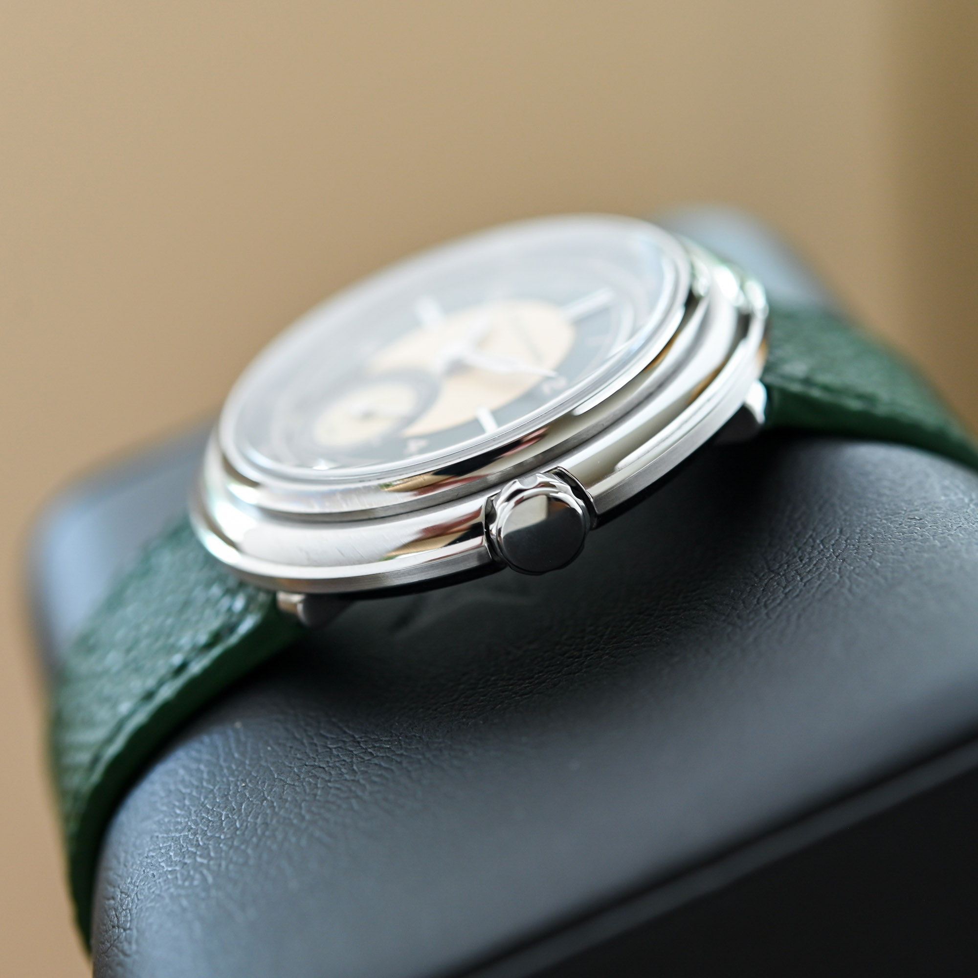 The layout of the indications also heightens the rotundity of the case with a peripheral ring for the minutes, a thicker chapter ring for the hours with applied markers at 12, 3 and 9 o’clock and a round small seconds counter at 6 o’clock. The Disco Volante models come with two-tone sector dials and a fun contemporary touch of Super-LumiNova circling the indented area around the chapter ring and the small seconds counter. The hour and minute hands are also treated with SLN. The Havana Disco model plays with salmon and brown tones and Old Radium SLN; the Disco Celeste pairs blue and white colours on the dial and is illuminated by sky blue SLN; and the Disco Verde that you can see illustrating this hands-on article opts for a green and cream dial with Old Radium SLN.