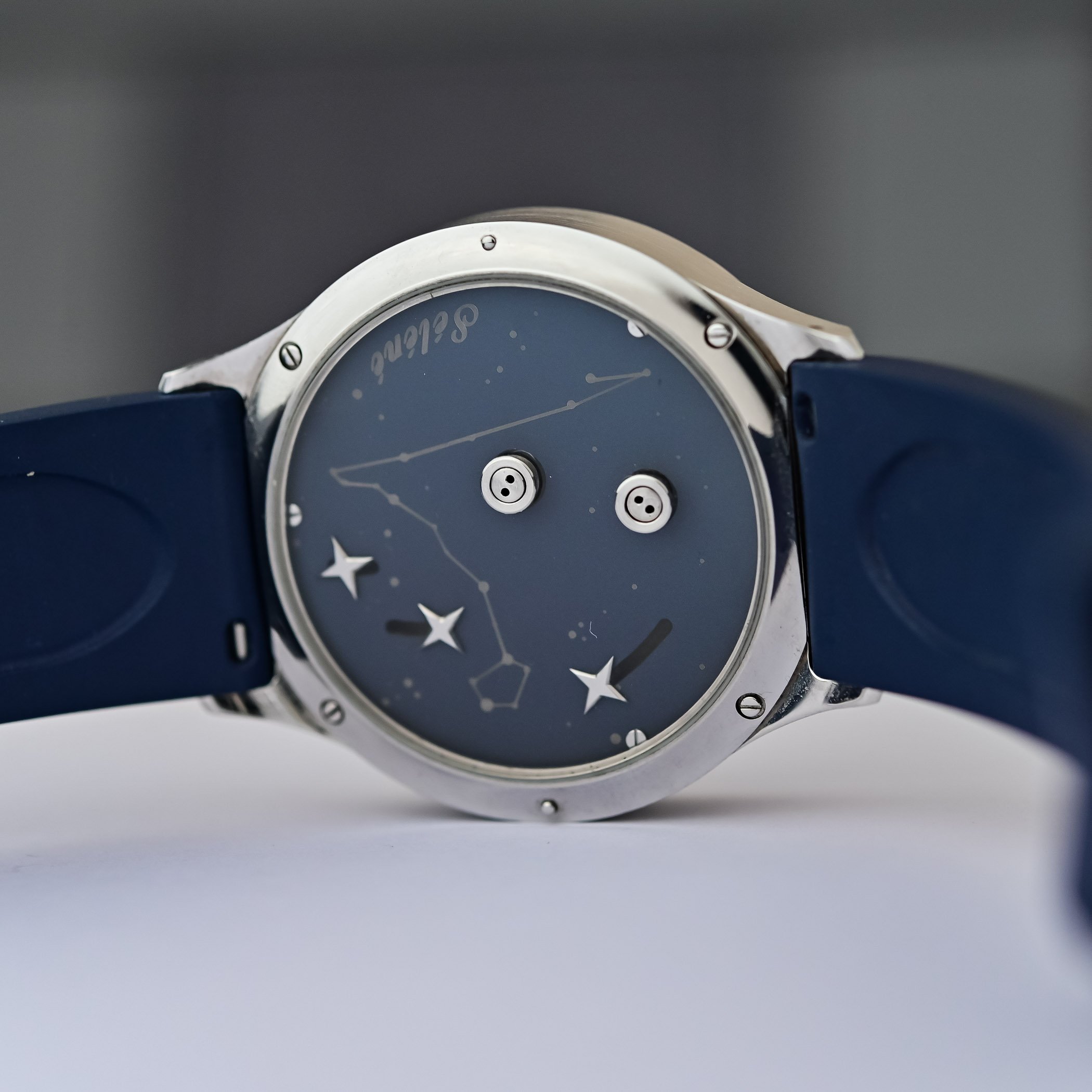To create Séléné, a wristwatch with key-winding and key-setting, Thomas Aubert based his work on the gear train of a calibre 6497, while completely redesigning all other components, including the bridges, main plate, balance, and mechanisms for time setting and winding. One of the watch’s most distinctive features is the animated “shooting stars” on the caseback. Rather than adding a second barrel, Aubert ingeniously developed a system that makes use of the “lost” energy of the click. Normally, the click has a recoil to avoid over-winding of the barrel. His idea has been to use this recoil, recovering and redistributing its energy thanks to a system of cams and feelers.