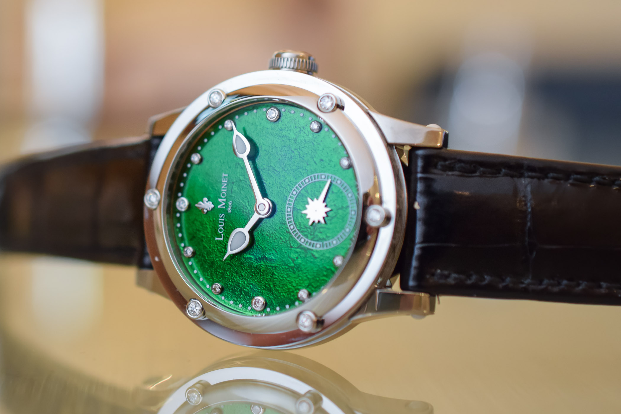 The striking dial of the Skydance watch, presented in Magic blue, Magic green and Magic red tonalities, draws the eye to its unusual and uneven surface. Although Louis Moinet will not divulge the technique employed, it reminds me of paillonné enamel that involves placing a leaf of foil beneath the enamel to obtain reliefs.