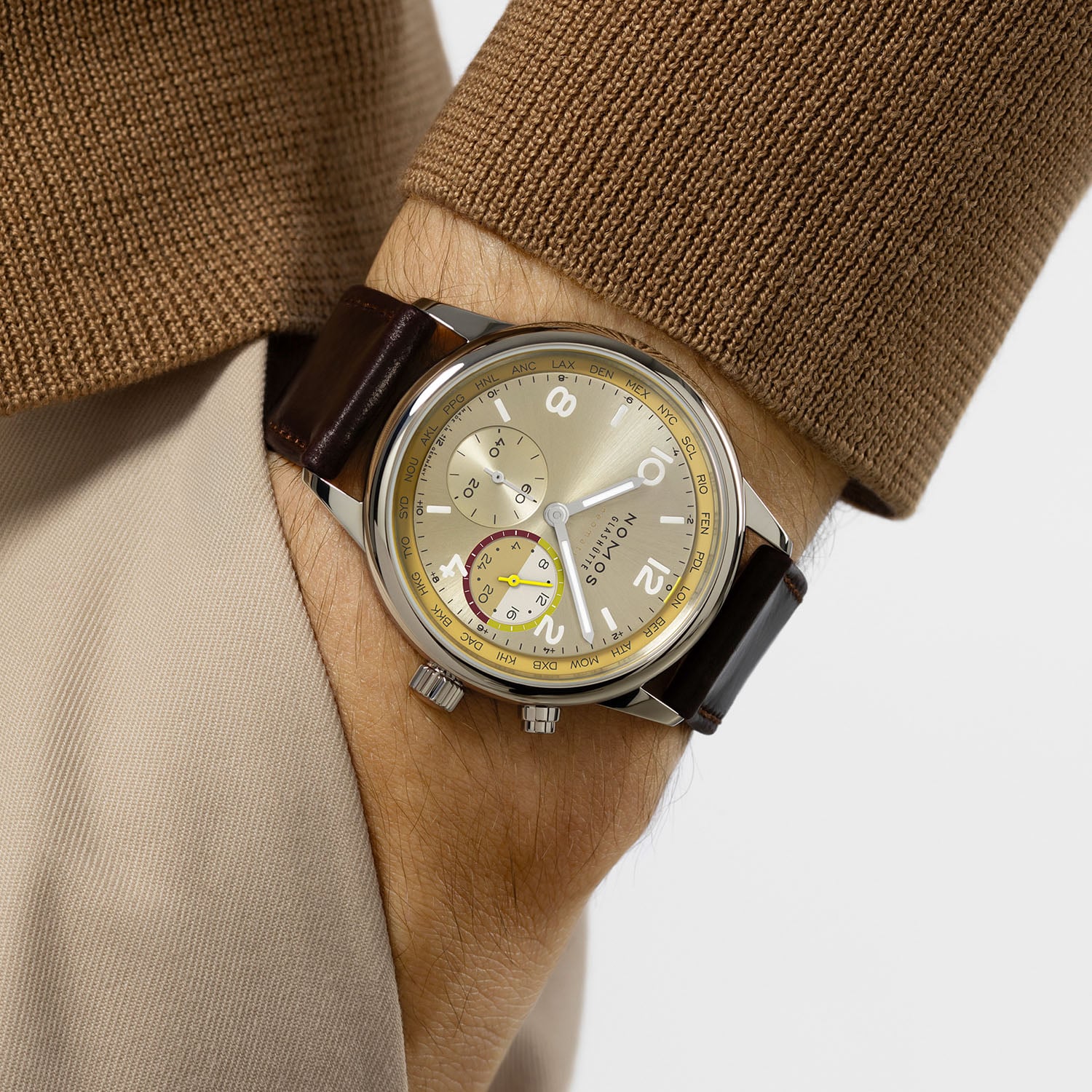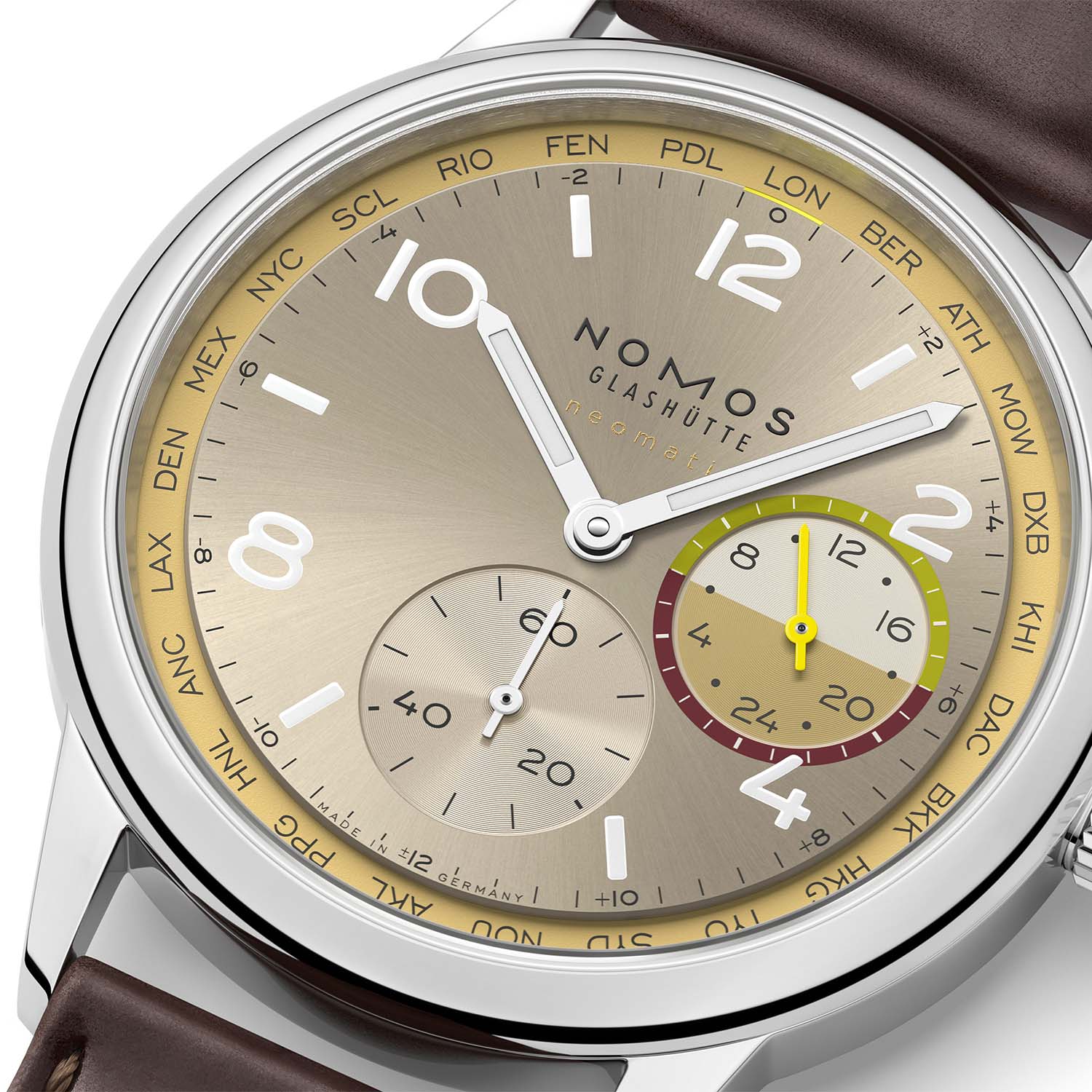 Once again, Nomos demonstrates its keen eye for creating colourful, contemporary dials. The Reverie has a soothing, sunray-brushed, champagne-coloured dial with yellow, sand and wine red accents, while Roam’s champagne dial features light blue, sand and green details. More than just pleasing colour combinations, they highlight certain functions and make consulting local and home time foolproof. Like earlier editions, the contrasting colour of the city ring on the periphery represents the 24 time zones using 24 city airport codes (IATA). Once the city has been selected via the pusher, a yellow or orange bar (depending on the model) appears beneath the three-letter IATA code at noon, and the time around the world can be consulted on the fixed minute track with its + and – values.