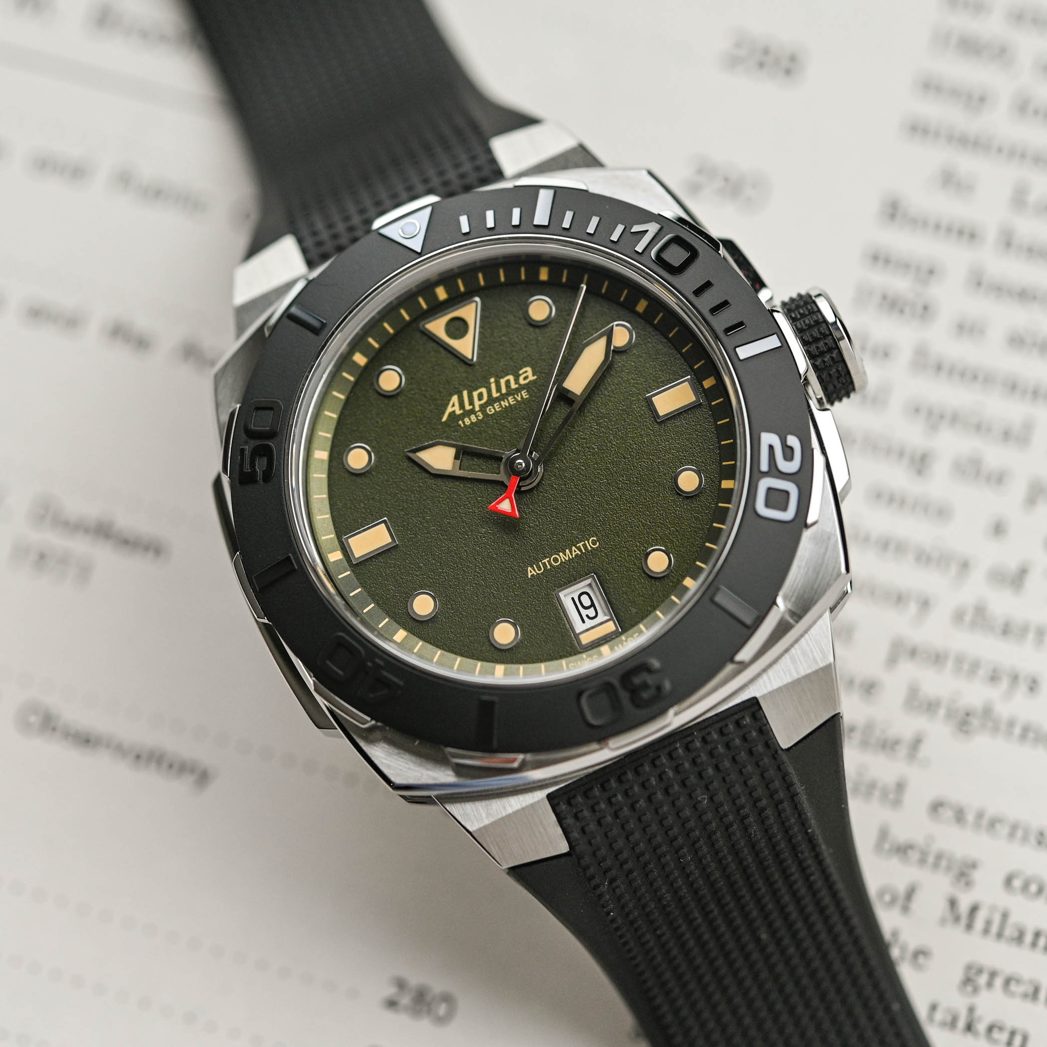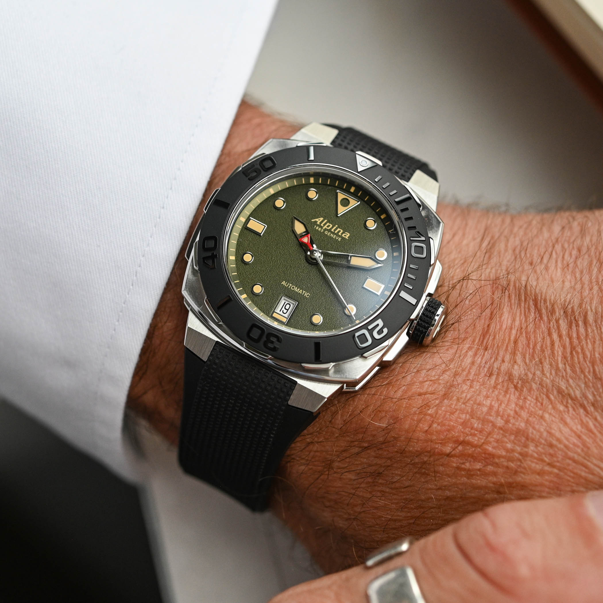 On the dial, both new editions share Alpina’s oversized triangular 12 o’clock marker, and a date at 6 o’clock, accompanied by a luminous segment for visibility in dark diving conditions. The first model features a black sandblasted dial where all applied indices, hands, and even the counterweight of the seconds hand are filled with “old radium” Super-LumiNova. This faux-patina lume brings vintage warmth and flavour, contrasting against the black background. The second edition introduces a grain-textured khaki dial, with the same lume treatment but a completely different spirit, more tactical, evoking rugged outdoor expeditions as much as underwater missions. Both dials are stripped of excess decoration, ensuring clarity and legibility remain the priority.