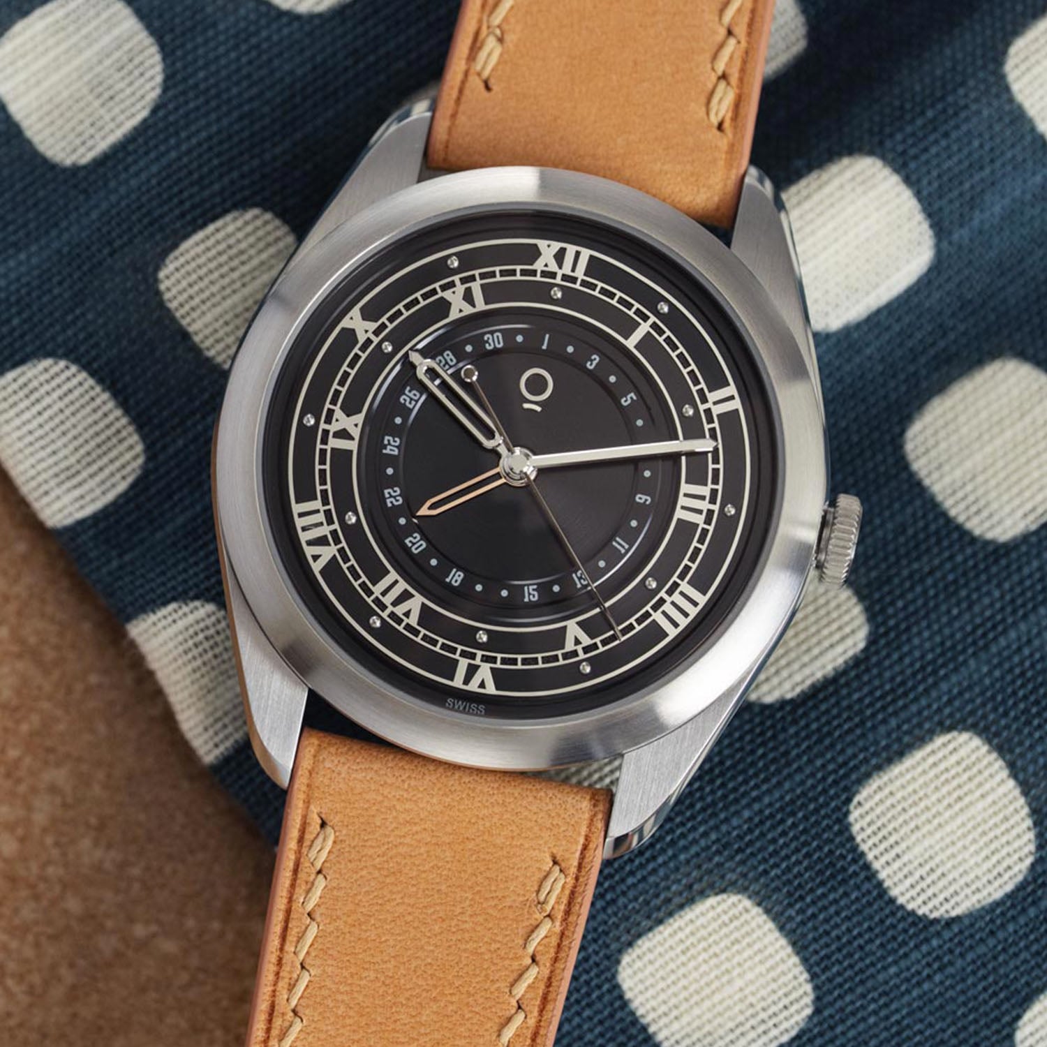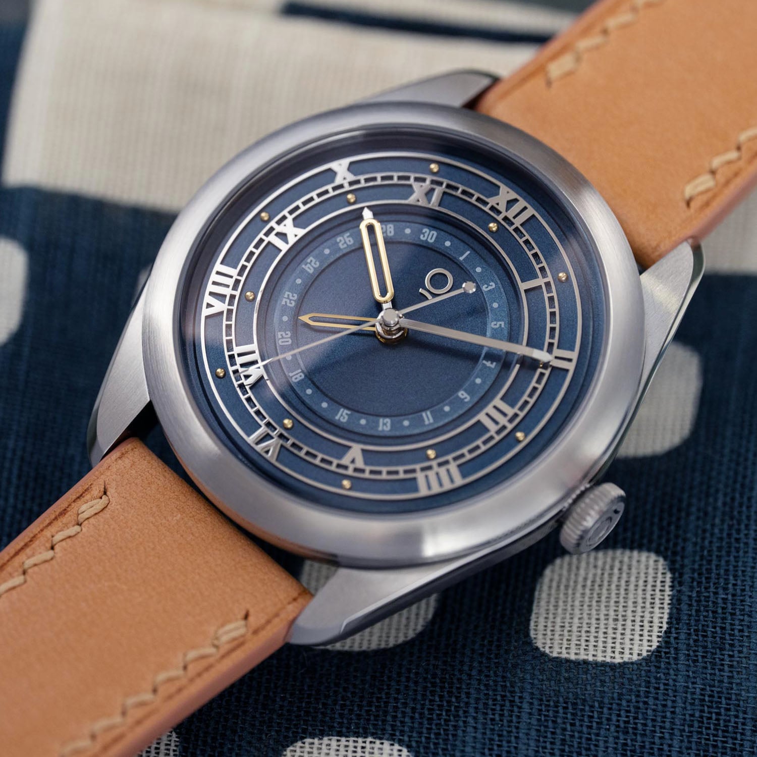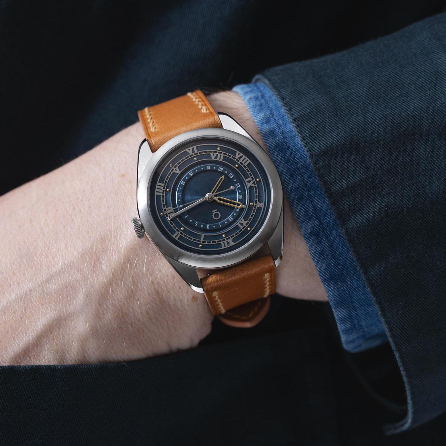 The OraOrea Coriolis Pointer Date stainless steel case measures 38.5mm in diameter and 12.1mm thick (including the crystal, 9.3mm without). The shape is defined by broad, curved lugs and a relatively compact 45mm lug-to-lug. Construction is more complex than it first appears, with separate components that allow distinct finishes across surfaces. Brushed planes contrast with polished bevels that subtly shift in width along the lugs. A highly domed sapphire crystal, AR and anti-fingerprint coated, adds visual height and softens the overall profile. The flat, 6mm push-pull fluted crown is decorated with the brand’s logo in colour. Water resistance is 100m.