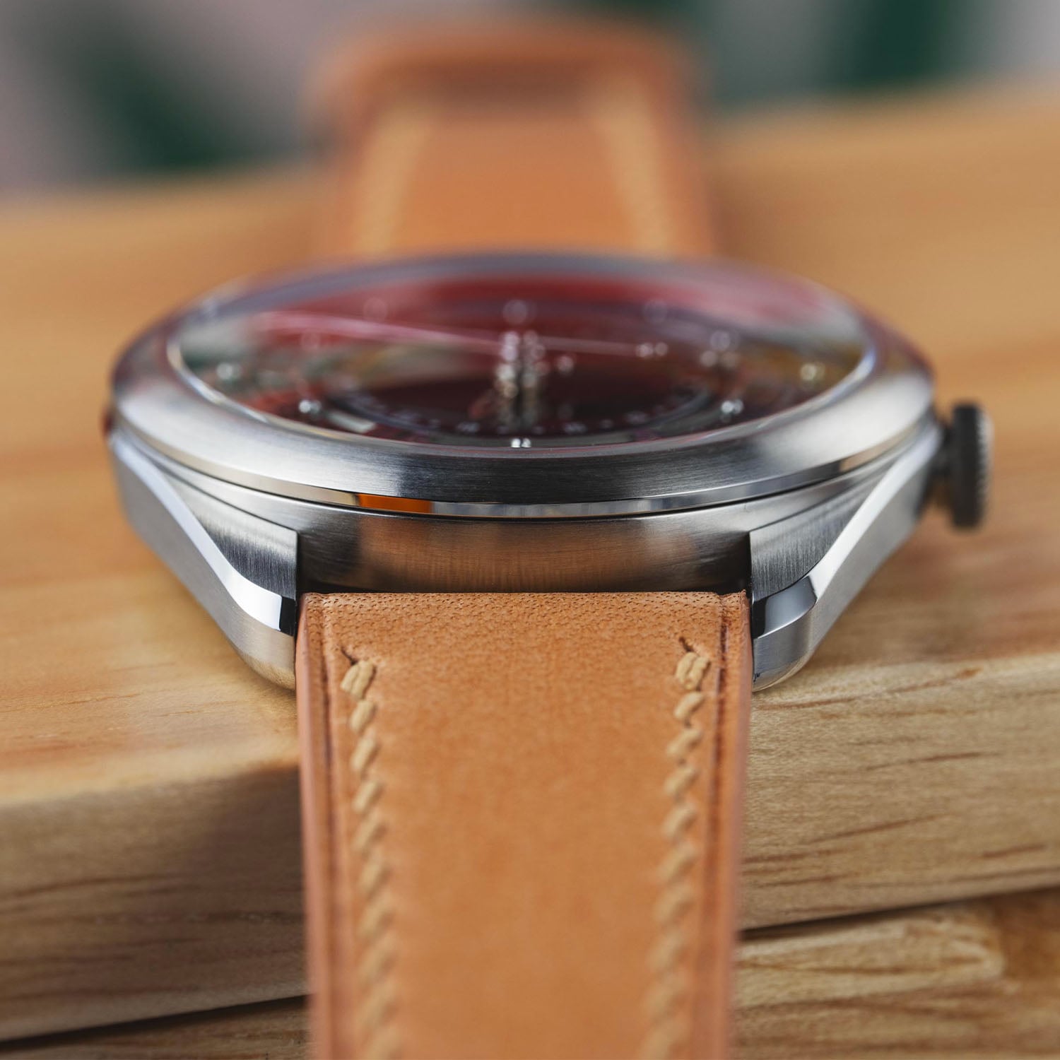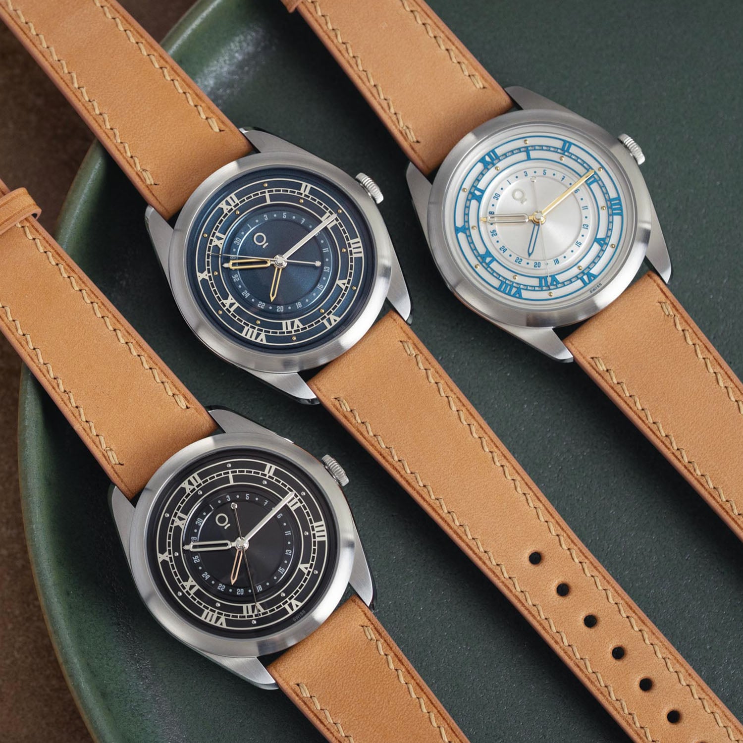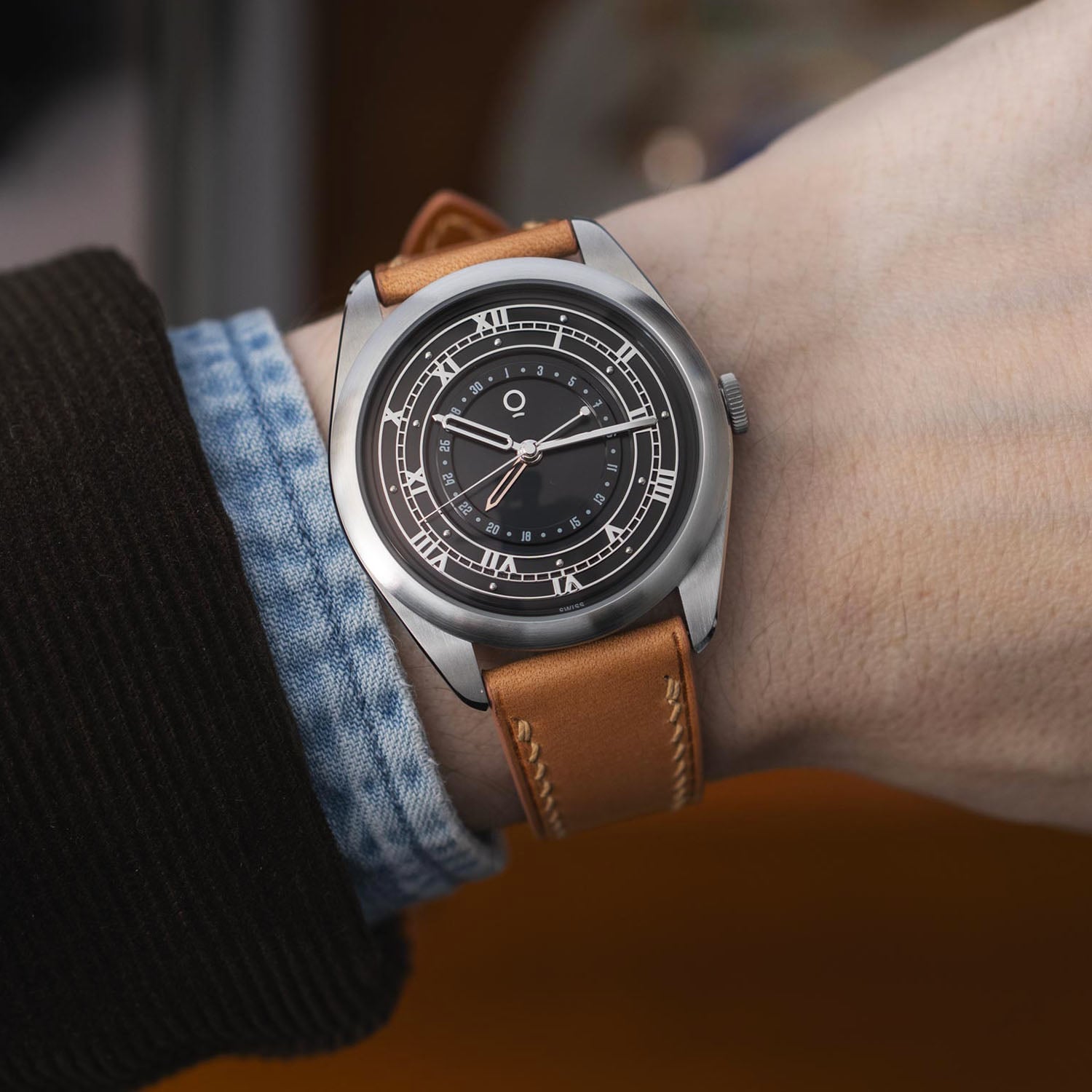 The OraOrea Coriolis Pointer Date stainless steel case measures 38.5mm in diameter and 12.1mm thick (including the crystal, 9.3mm without). The shape is defined by broad, curved lugs and a relatively compact 45mm lug-to-lug. Construction is more complex than it first appears, with separate components that allow distinct finishes across surfaces. Brushed planes contrast with polished bevels that subtly shift in width along the lugs. A highly domed sapphire crystal, AR and anti-fingerprint coated, adds visual height and softens the overall profile. The flat, 6mm push-pull fluted crown is decorated with the brand’s logo in colour. Water resistance is 100m.