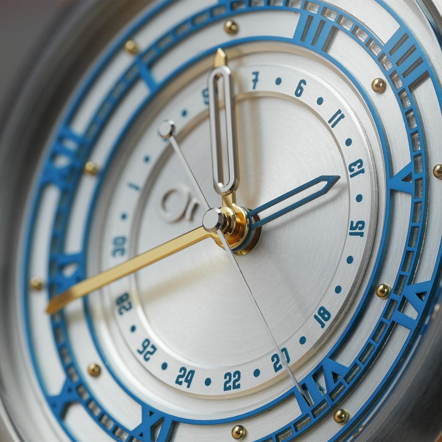 The dial, available in Skyline Silver, Venetus Teal and Rhodium Black, is where the watch gets even more interesting. The Coriolis builds its layered display with concentric rings, using a laser-cut, hand-polished single piece for the hours and minutes/seconds indication. The outer ring features even Roman numerals to mark the hours, then an integrated thin railroad-style minutes/seconds track separates the inner ring with odd Roman numerals. Each hour is additionally marked with a small gold hemisphere, positioned on both sides of the minutes ring.