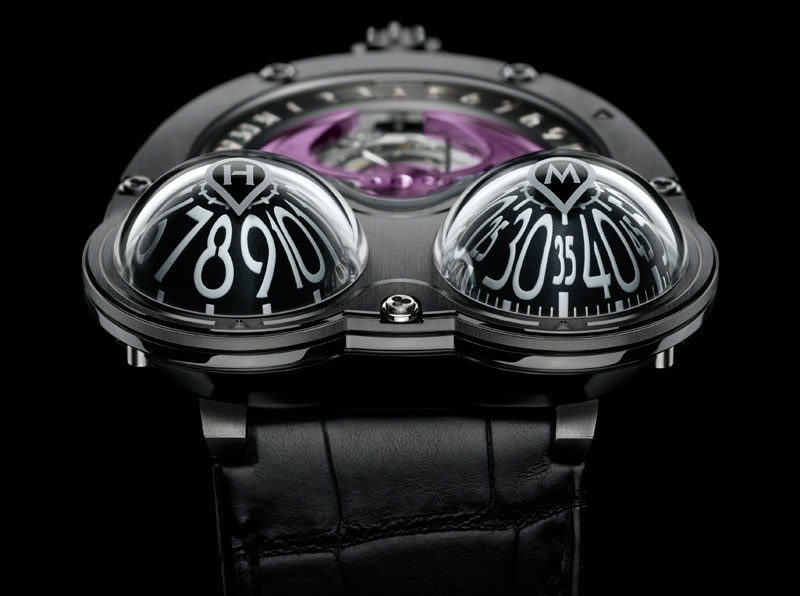 The purple automatic winding rotor is made of 22 carat rose gold. Above the rotor and positioned around the movement, is a rotating ring that indicates the date. The hour and minutes information is transmitted via ceramic ball bearings to rotating domes… or the Frog’s eyes.