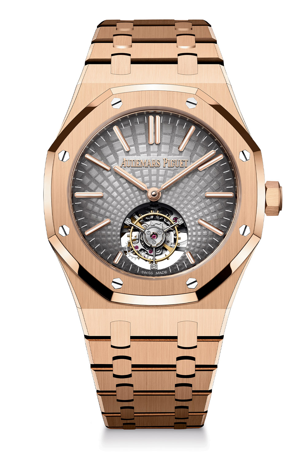 Last but not least, the Royal Oak Selfwinding Flying Tourbillon 41mm will be offered in a warm and luxurious 18 pink gold edition (26530OR.OO.1220OR.01) with a matching integrated bracelet. On this edition, gold accents are also found on the dial hands and markers, on the tourbillon cage and finally on the oscillating weight.
