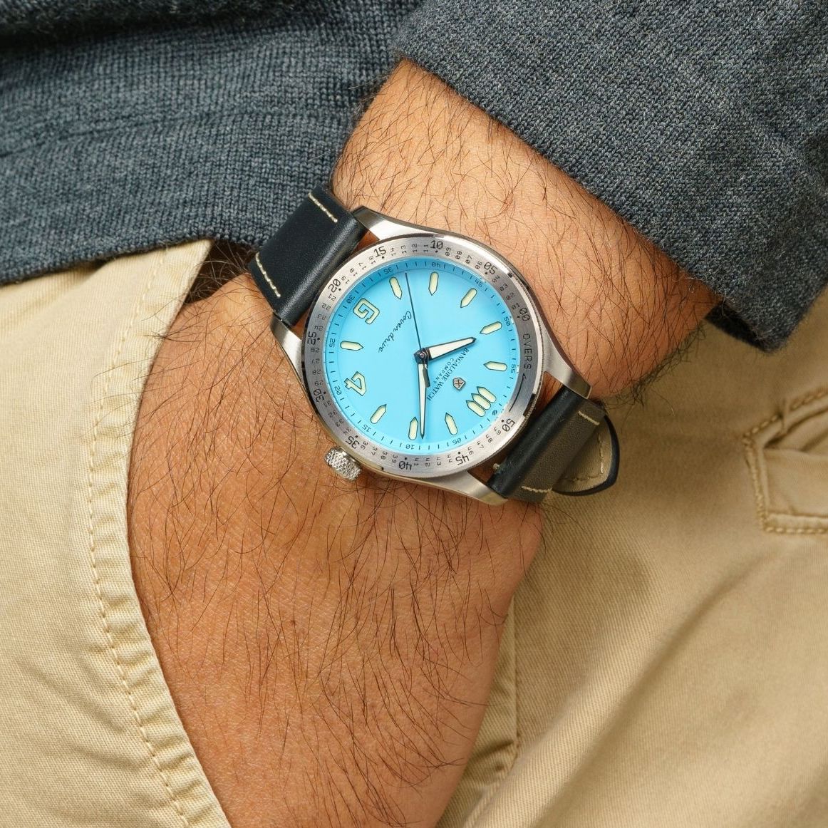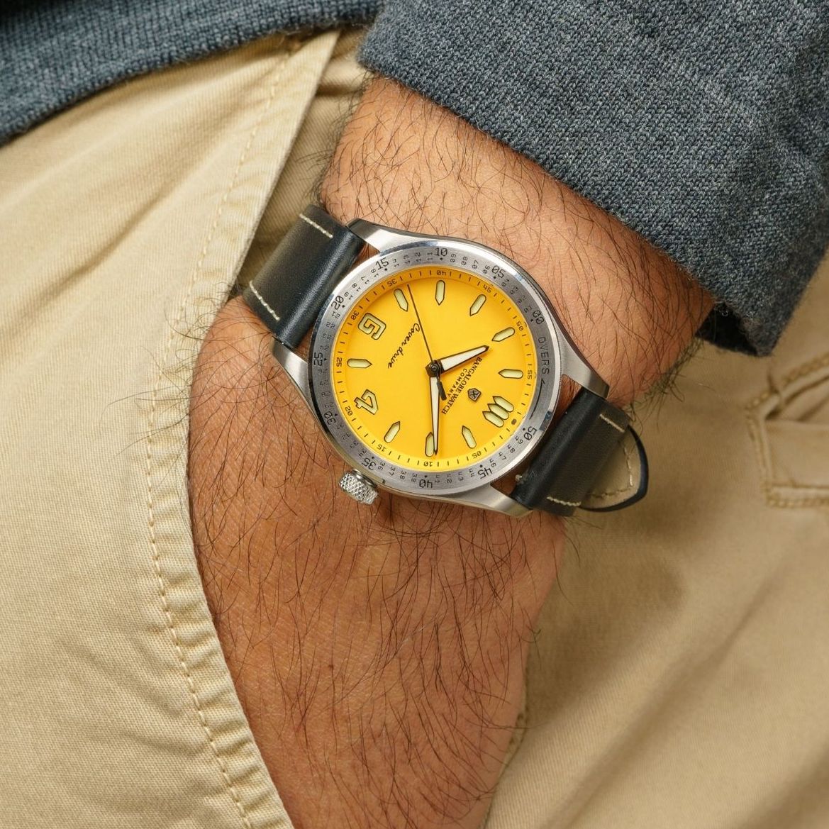 What’s new to the Cover Drive is the introduction of two colours, yet again inspired by Cricket. The mustard “Yellow Jersey” and the aquamarine “Men in Blue” dials are inspired by popular colours of jerseys in Cricket in India. What remains is the sandwich construction of the dial, with Super-LumiNova underneath. Also present are all the details that remind you of Cricket; the knurled grip on the bezel, the bat-shaped counterweight on the seconds hand, the cricket ball on the peripheral minute track, the wicket-style hour marker at 12 o’clock and more.