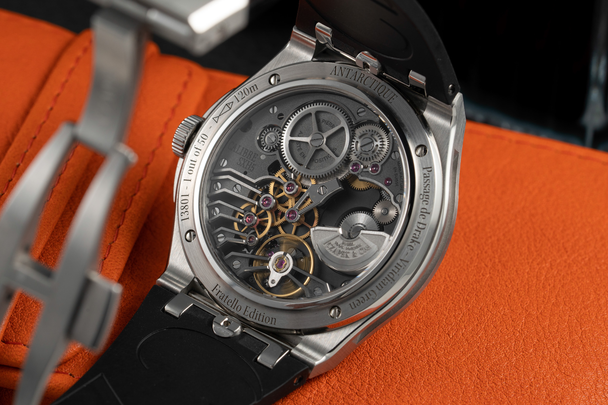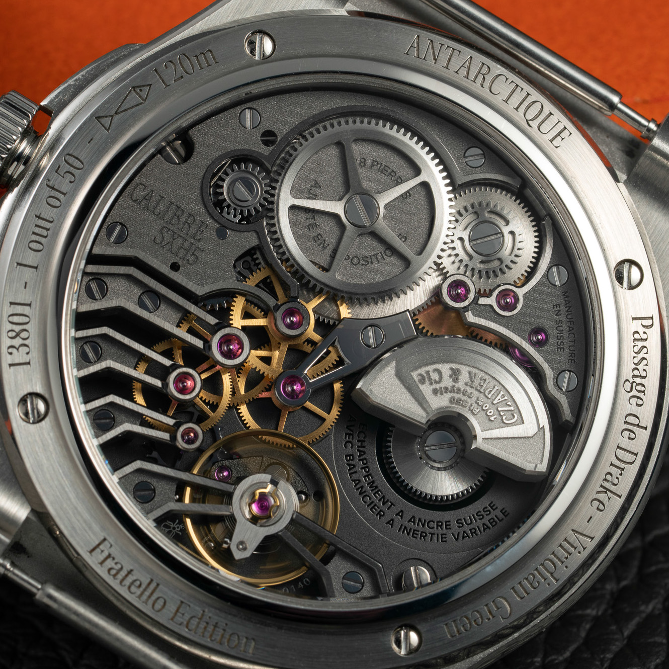 Last year, Czapek revealed a whole new watch, a model to compete in the ultra-competitive market of the luxury sports watch with integrated bracelet, a category dominated by icons such as the Nautilus and the Royal Oak. And the young independent watchmaker used all its arsenal in the battle, and managed to introduce a watch with strong arguments. The inaugural Antarctique collection was launched with great success and sold out faster than the brand probably expected. It’ll be followed by a new version, the so-called Passage de Drake, with a revised dial and some improvements on the proprietary (and stunning) automatic movement. This is the base that Fratello has been using for its new collab watch.