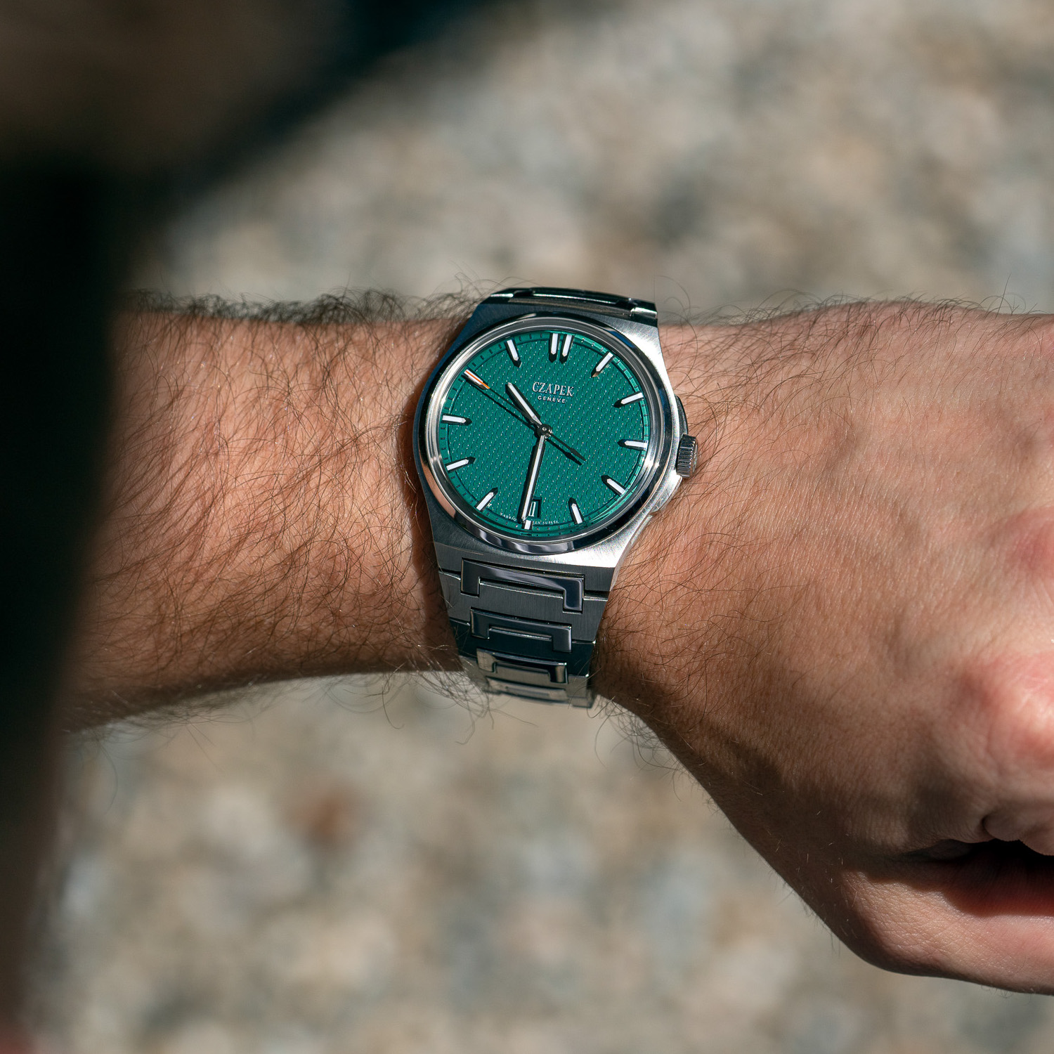 Fratello's third collaboration is a high-end, green-toned sports watch with integrated bracelet... trendy indeed!