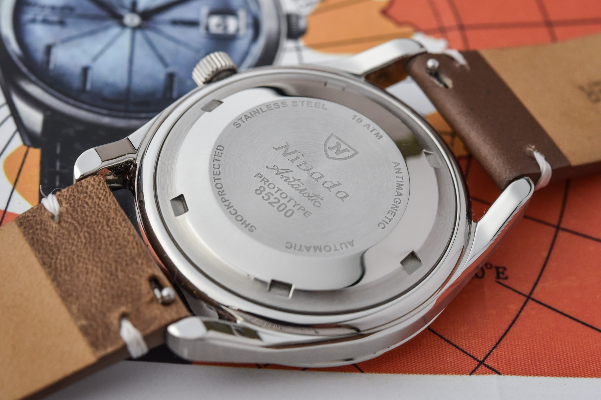 While a vintage watch inspires the design, the specifications of the Nivada Grenchen Antarctic Spider Re-Edition are entirely modern; the watch is equipped with a double-domed sapphire crystal (which creates nice distortions), equipped like the original watch with a date magnifier, a screw-down crown and a solid steel screwed caseback, resulting in a comfortable 200m water-resistance. The case is compact, with an 11.1mm thickness and 45mm from a lug to another. The overall construction is clean and neat, resulting in a pleasant quality feel.