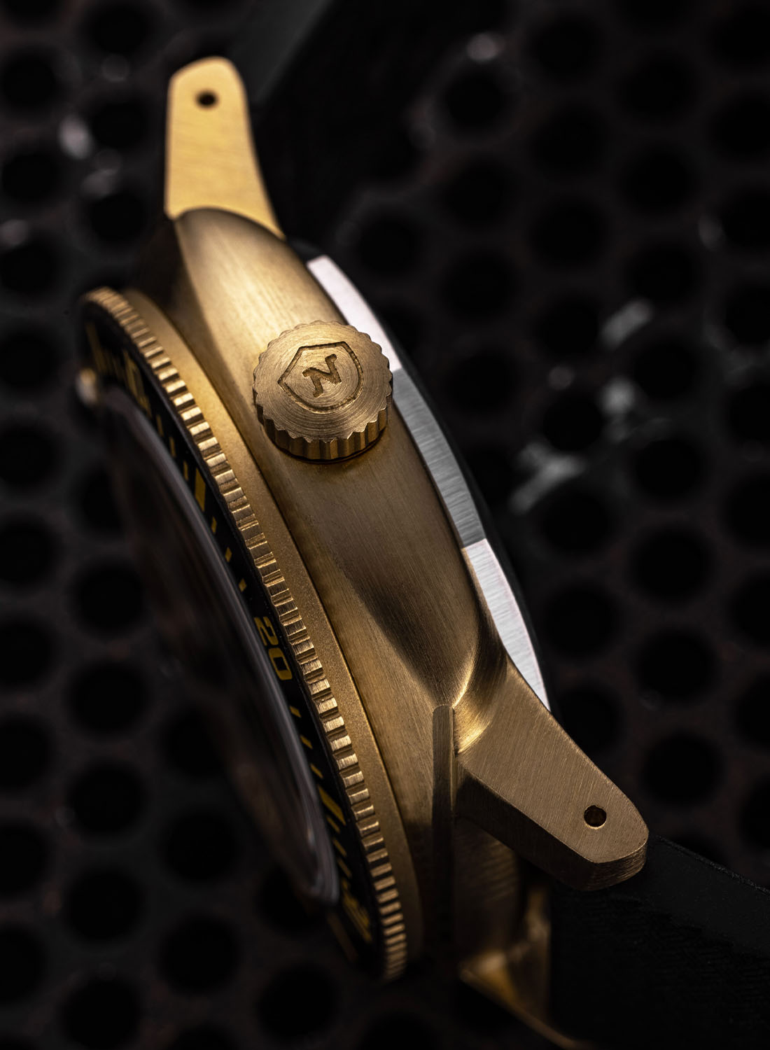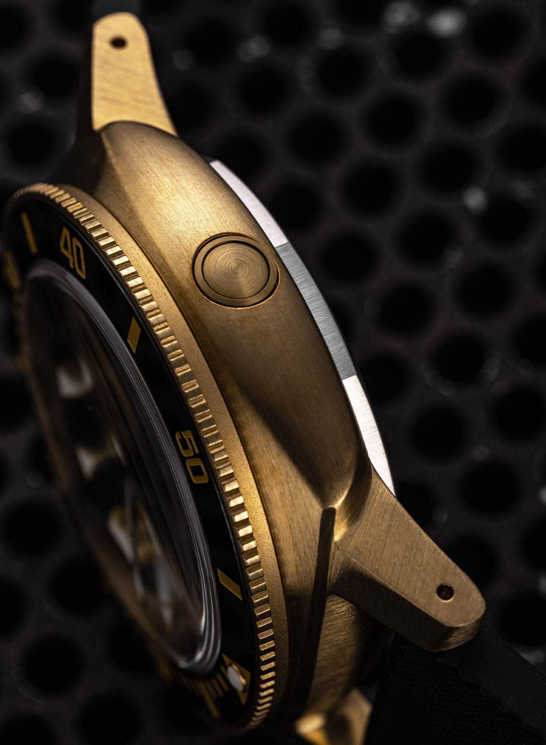 Today, the case – with a diameter of 39mm and a thickness of 13mm – is crafted in bronze but respects its ancestor’s cushion-shaped profile and straight, drilled lugs. Thanks to its resistance to corrosion, bronze evokes all things maritime and is a fitting metal for a retro-inspired dive watch. Using a copper-aluminium bronze alloy (92% copper, 8% aluminium), the brushed bronze will form a unique yet subtle patina over time, while the aluminium oxides that form on the surface make the metal more resistant to corrosion.