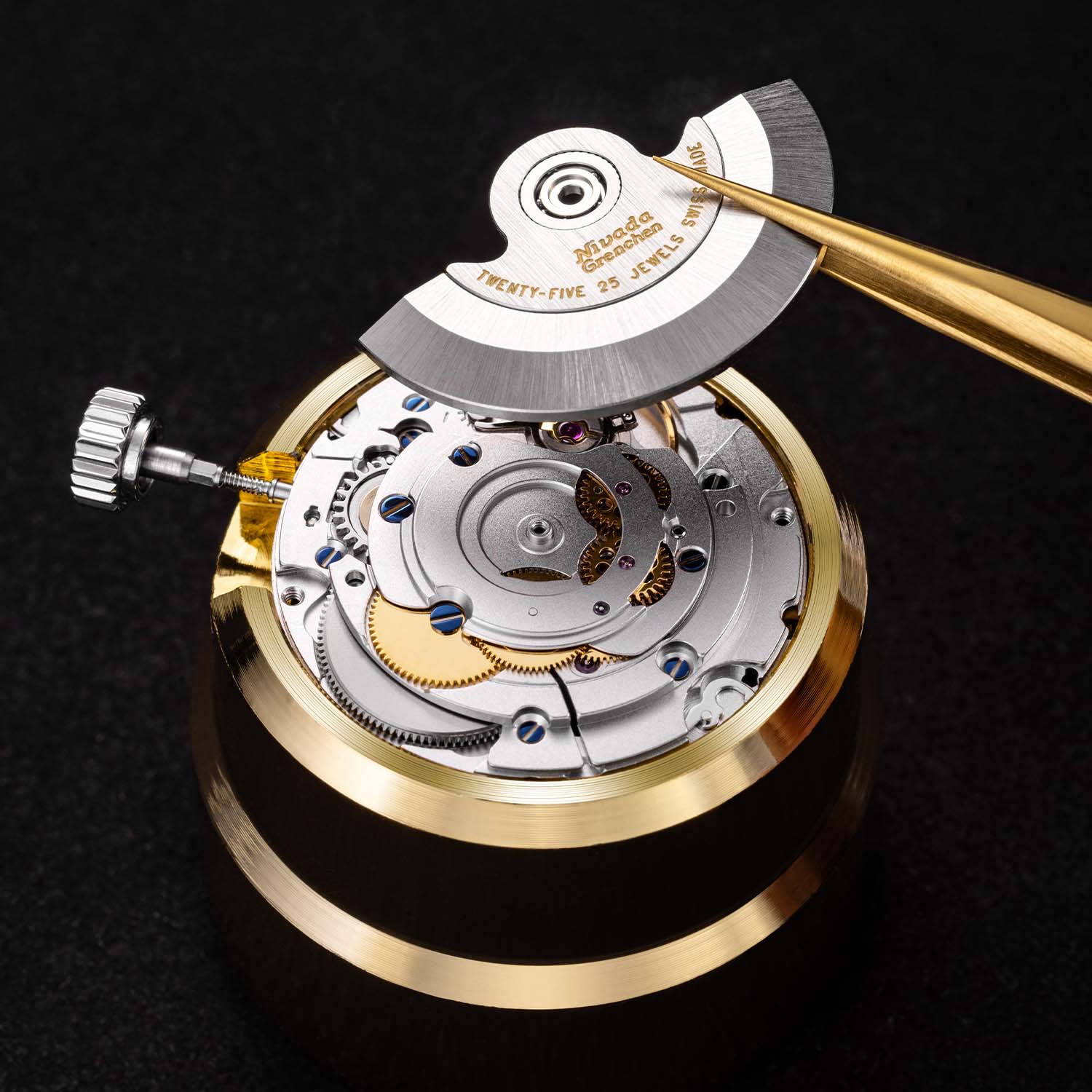 Powering the new Nivada Grenchen F77 Mark II is the Soprod P024 automatic, an ETA 2824-2 alternative. It has 25 jewels, operates at 28,800vph and offers a 42-hour power reserve. Functions include central hours, minutes, and hacking seconds, and there’s also a date complication that can be utilised or not.
