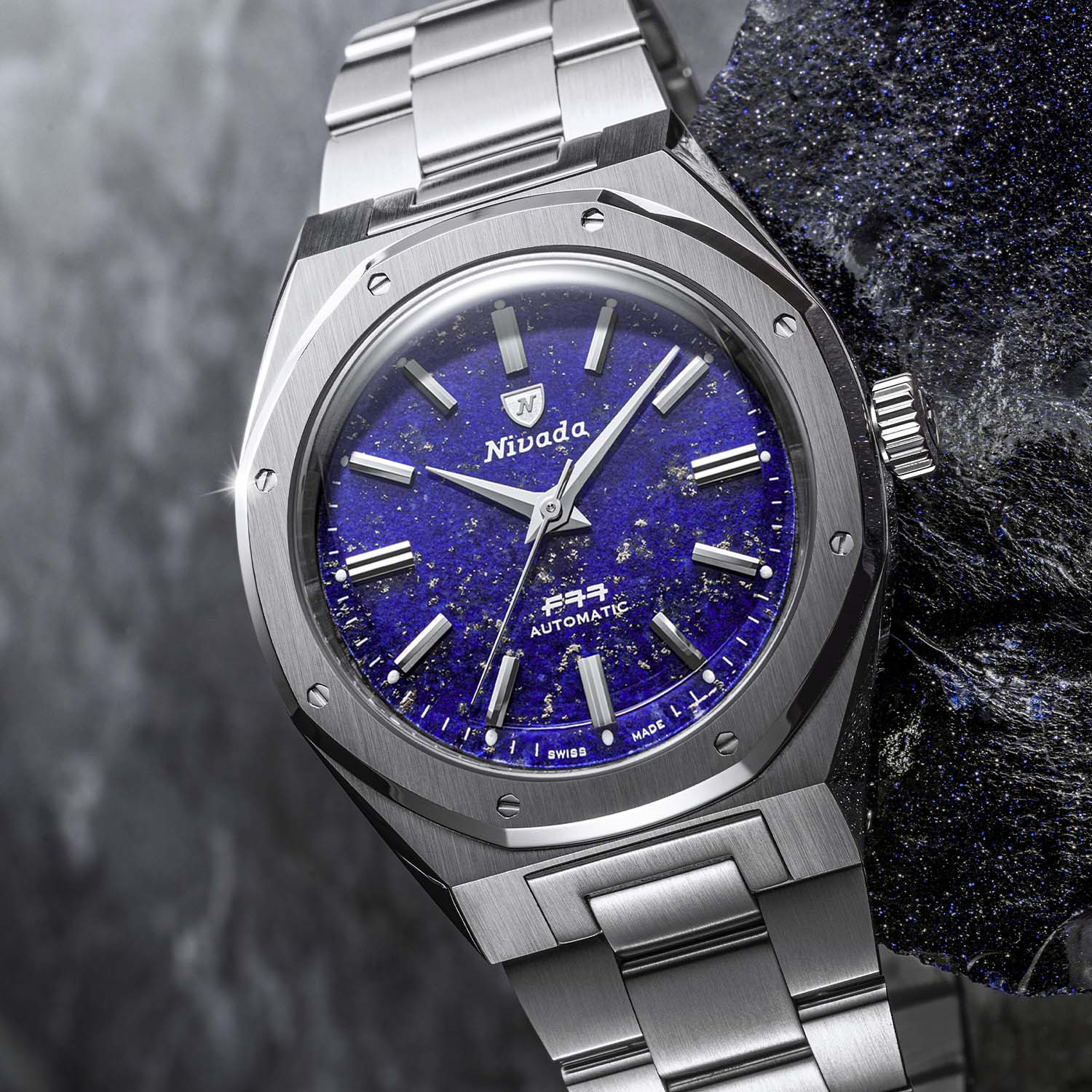 The watch is worn on an integrated steel bracelet; rubber and fabric straps are also available. Prices start at EUR 1,220 for the classic braided dials and EUR 1,420 for the stone dials. For more information, please visit Nivada Grenchen’s website.