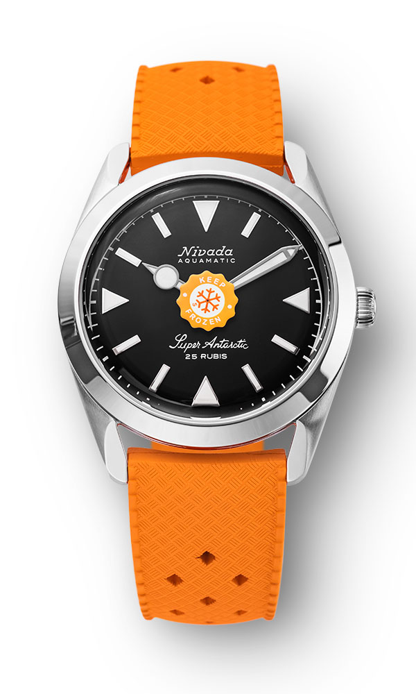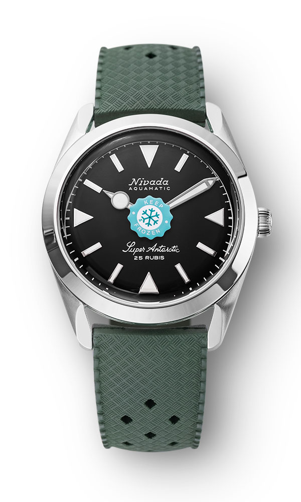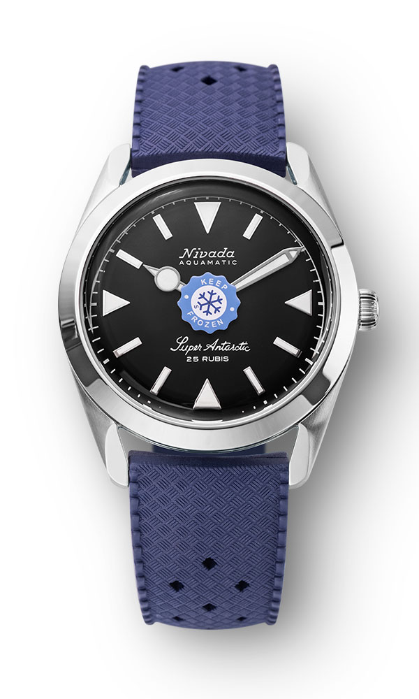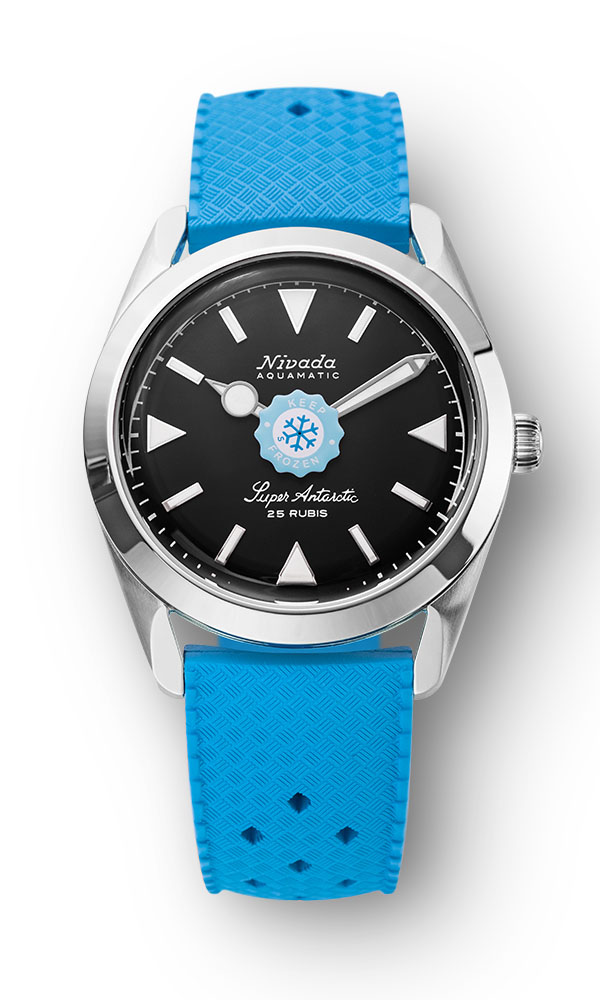 Since its resurrection a few years ago – we’ve listed the brand in our recent buying guide on recently-revived historic brands – Nivada Grenchen has been hard at work, providing nicely designed and well-priced watches with a retro feel. It all started with the revamped Chronomaster, followed by funky models such as the “Pac-Man” Depthmaster or the Antarctic Spider. And then came the Super Antarctic, a rugged exploration model with no-nonsense design. Well, today, it’s not so much about “no frills” anymore, as French artist Seconde/Seconde, a.k.a Romaric Andre?, gives (quite literally) a cool touch to this watch, with the new Nivada Super Antarctic Keep Frozen Limited Edition.