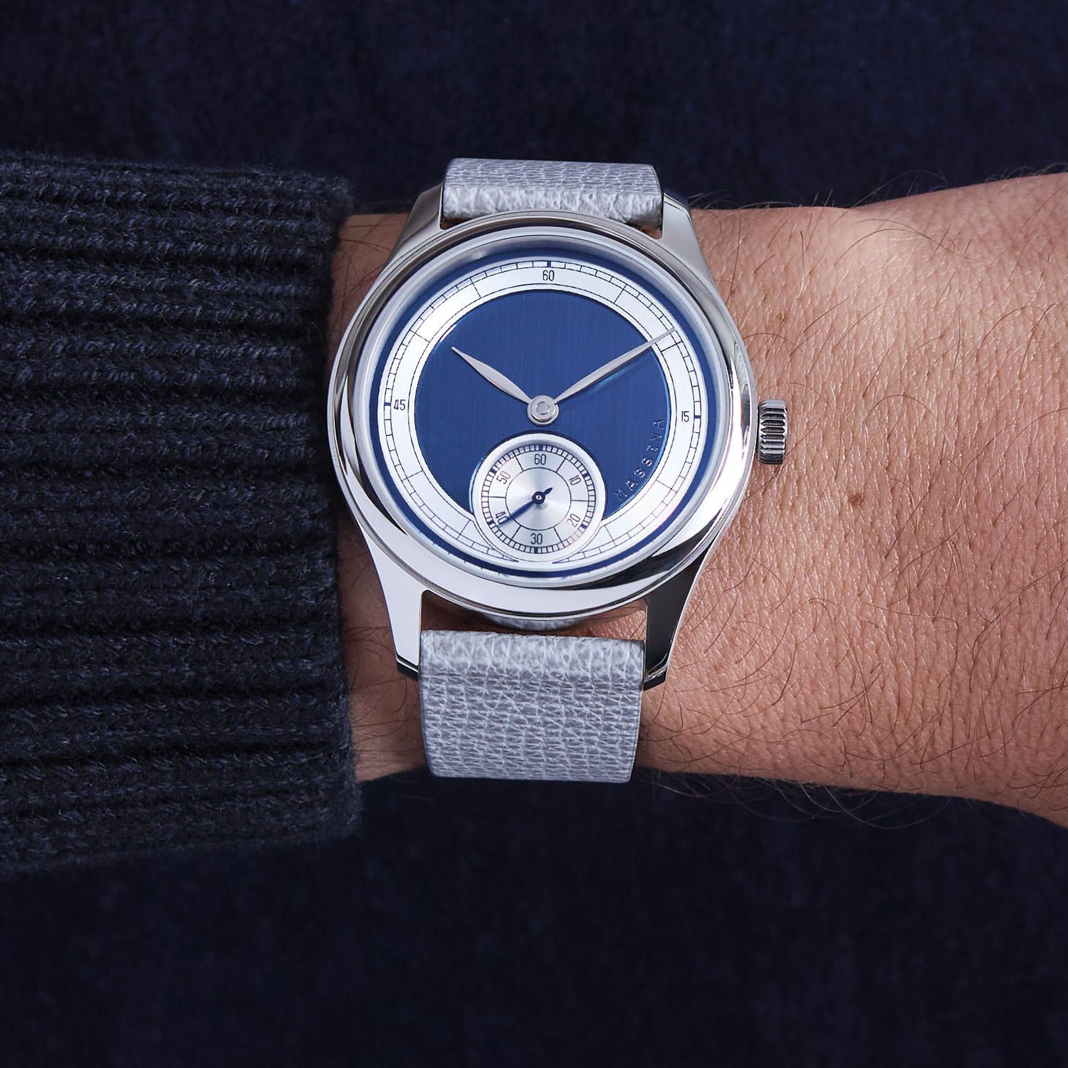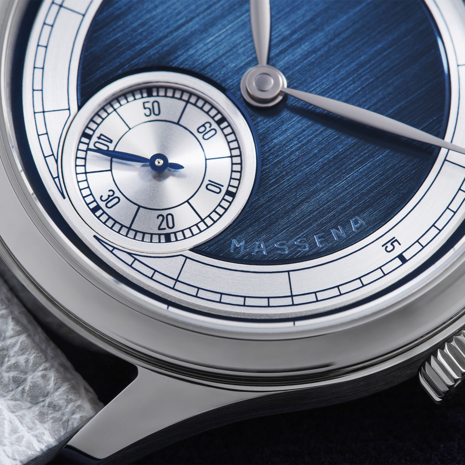 Marking a certain continuity with Raúl Pagès’ acclaimed RP2 watch, the Noctograph plays on minimalism but mixed with vintage cues. The dial is built around a central plate, vertically brushed, with a shade of blue that changes colour according to the light, ranging from slate to petrol or deep midnight. And like the RP2, there’s a ghost signature at 4 o’clock, but here engraved Massena. Surrounding this central part is a bright chapter ring plated with rhodium and radially brushed. This outer section is marked with a fine, black railroad track showing the hours and minutes. A recessed small seconds sits at 6 o’clock and time is indicated by steel leaf-shaped hands.