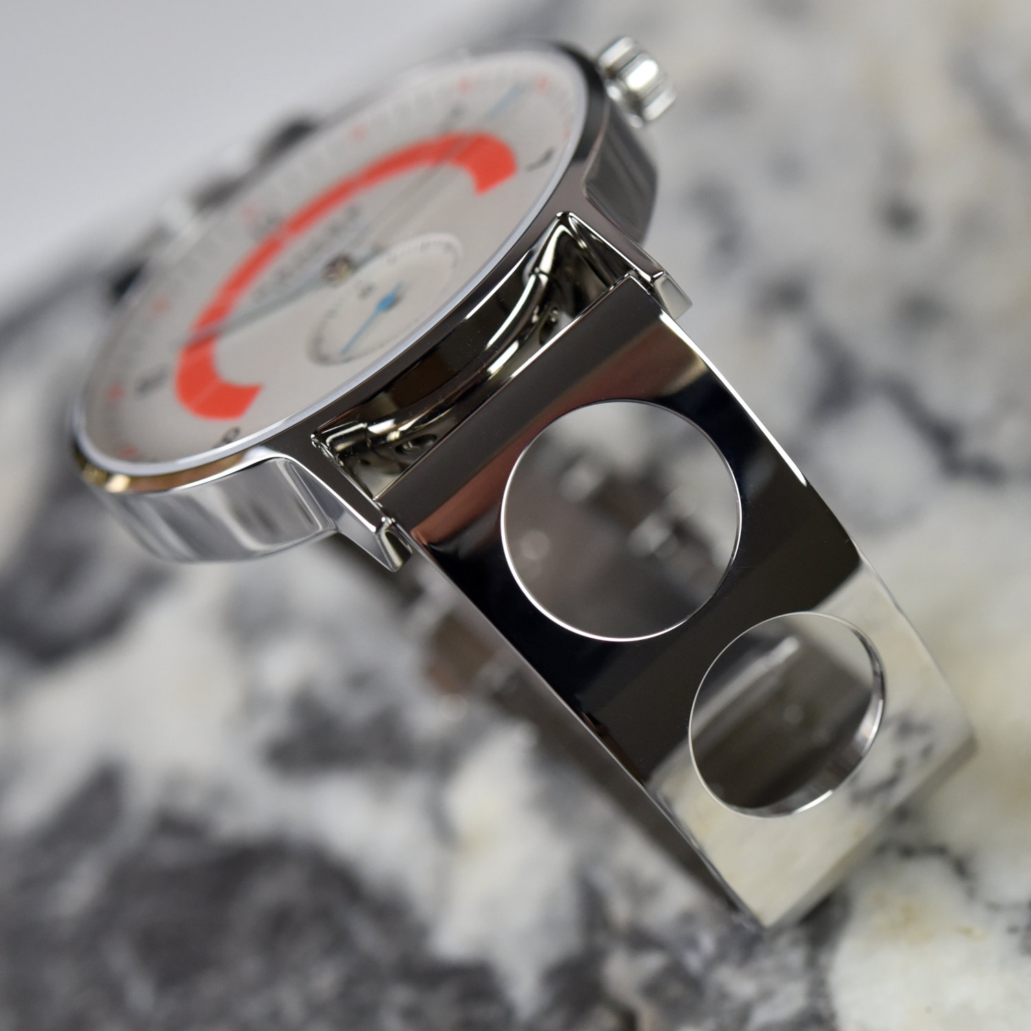 Each of the three Nomos Autobahn Director’s Cut models comes on a special, limited edition ‘strap’ (according to Nomos). Reminiscent of Breitling’s perforated Air Racer bracelet, you first have a long, solid link with two holes in it, before it transitions to solid steel links and ends in a folding buckle. Something that really boldens the design of the watch and feels novel for the brand.