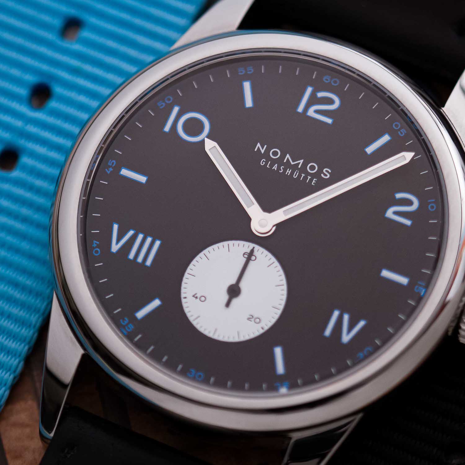 The dial of the new Nomos Club Campus 38 #NomiesForLife watch is presented in a deep shade of black as opposed to the Club’s recognisable anthracite colour and comes with the familiar north hemisphere represented in Arabic numerals; the south features traditional Roman numerals. What sets the dial apart from standard versions is the bright blue outline of the indices – a nod to Michiel’s favourite colour. The numerals are also completed in Nomos’ white luminescent treatment for assisting with reading the time during the night or in dark conditions.
