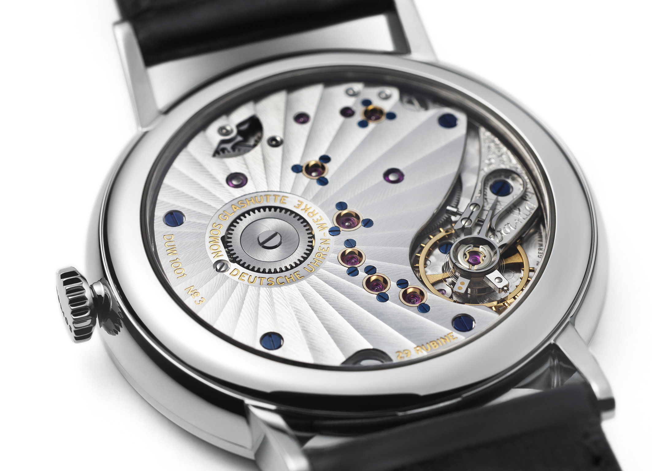When the Swatch group announced its ETA ébauche moratorium, the watch industry began scrambling to find or produce movements. Nomos’ manufacture independence, now complete with hairsprings, seems prescient in comparison to much of the industry – many other companies are trying to catch up. The manually wound DUW 2002 (Lux) and DUW 1001 (Lambda), “Deutsche Uhrenwerke NOMOS Glashütte” or DUW, are manufactured and assembled at the Nomos facility.