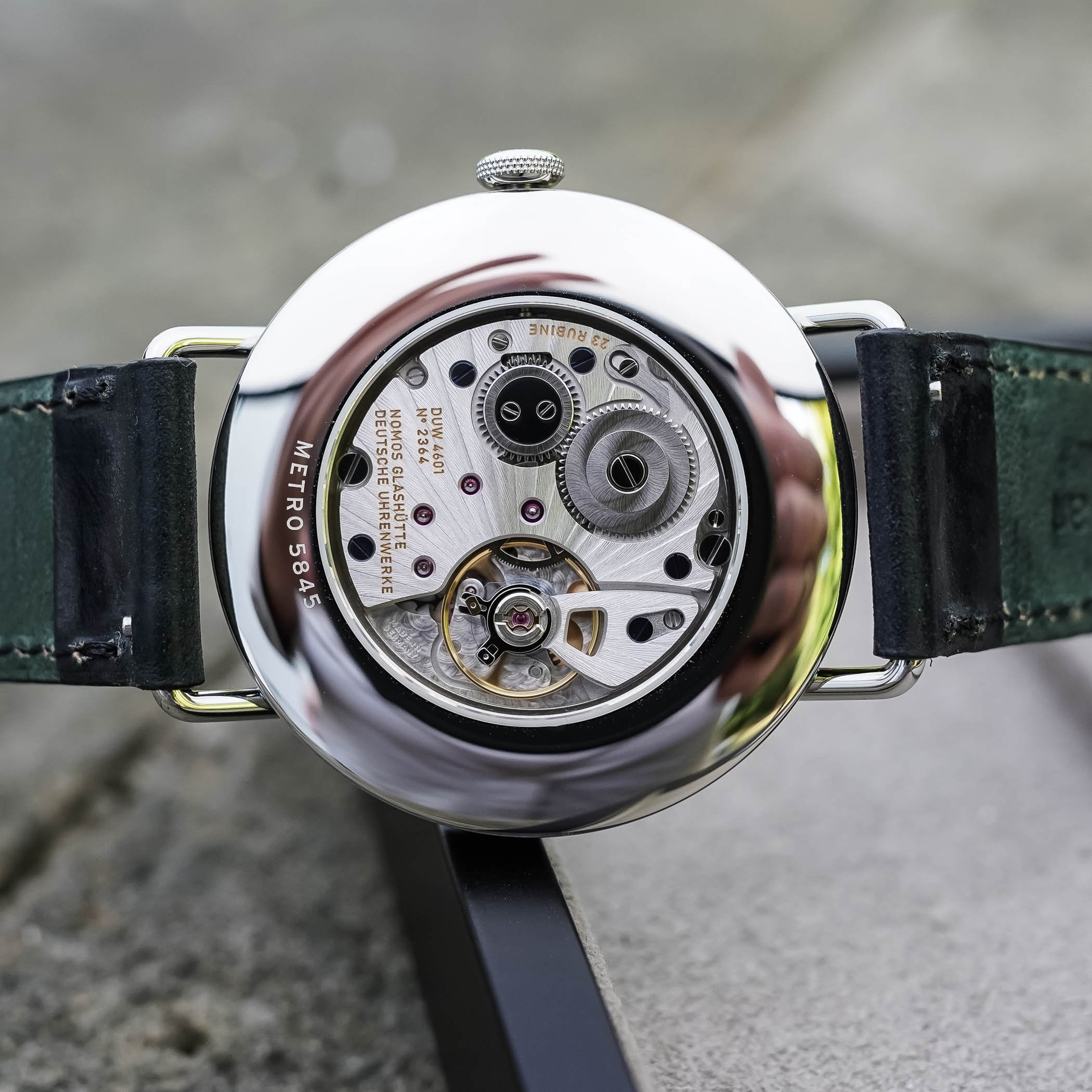 The main evolution in this Metro 38 Date can be seen through the sapphire back. Instead of a date version of the Alpha calibre, Nomos opts for its latest in-house hand-wound movement, the calibre DUW 4601. Introduced last year in the Tangente 2date and later in the Minimatik 39 Date, this movement represents the latest evolution of the Alpha calibre, a movement based on a Peseux architecture. While still showing traces of its origins, the DUW 4601 now features the brand’s in-house blued hairspring (the Swing System), a stop-seconds mechanism, a skeletonised balance cock, and an upgraded power reserve of 52 hours. Just like the Minimatik, it has a two-part construction with a date module on the periphery, but it’s hidden here. Finally, the decoration has been enhanced with fine sunbeam ribbing, radiating from the centre of the balance.