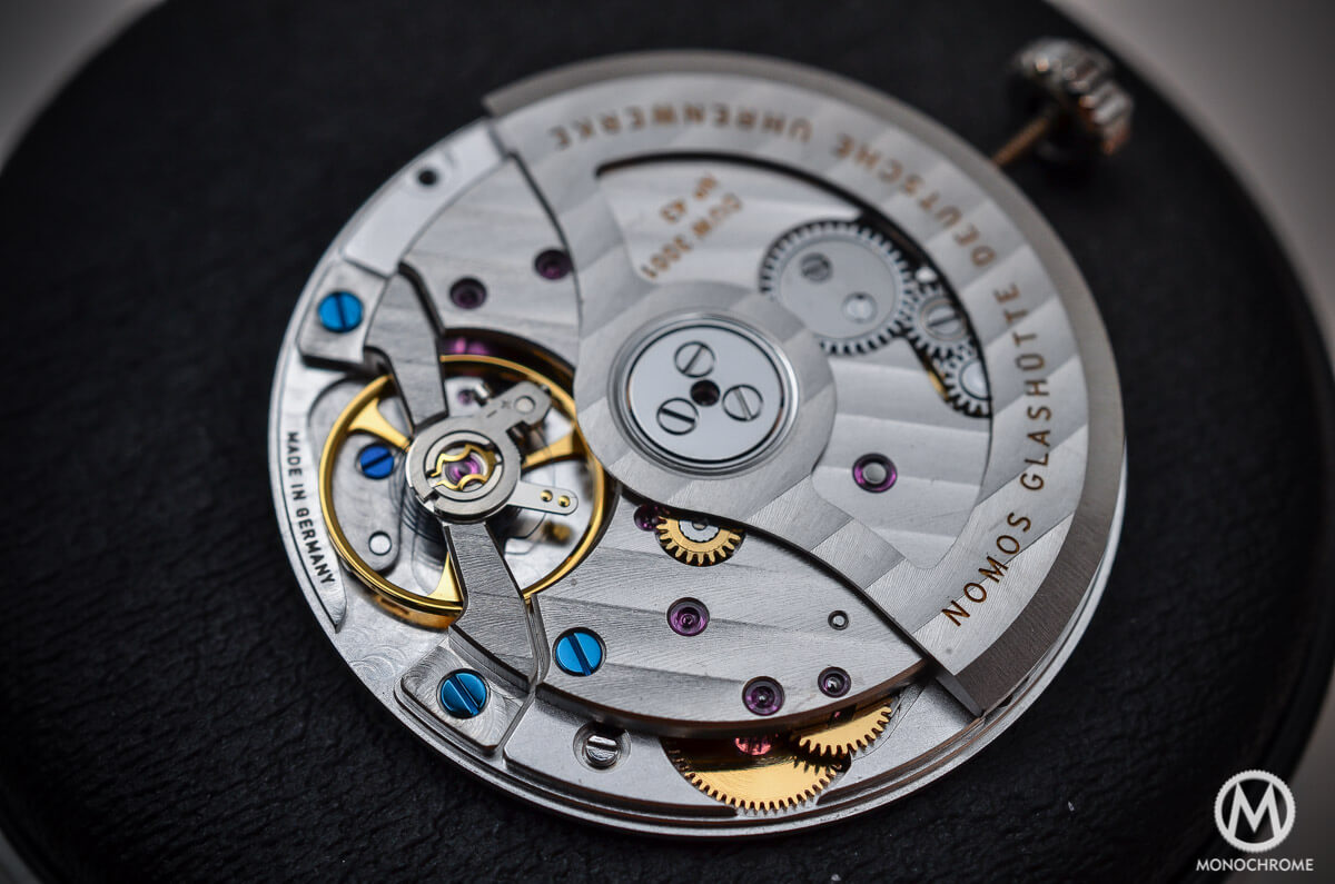 Nomos already has several own movements in its collections, as for instance the complicated automatic calibre Epsilon that can be found in the Zurich Weltzeit or the superbly finished DUW 1001 / 2002 of the Nomos Lux and Lambda (in an other price range however). They also announced in 2014 the in-house production of the escapement modules – balance wheel, hairspring and escapement – known as the Nomos Swing System. It’s rather impressive to see a brand like Nomos producing all these elements in-house, especially because the investments required are huge. However, since the Swatch ébauche moratorium (ETA stopping to deliver movements to third parties), brands like Nomos have no other choice to out-source from ETA-clones manufactures or to create their own movements. This situation usually leads to a tremendous increase of the production prices, and thus, to a larger retail price. This could have been the case with Nomos – but no!
