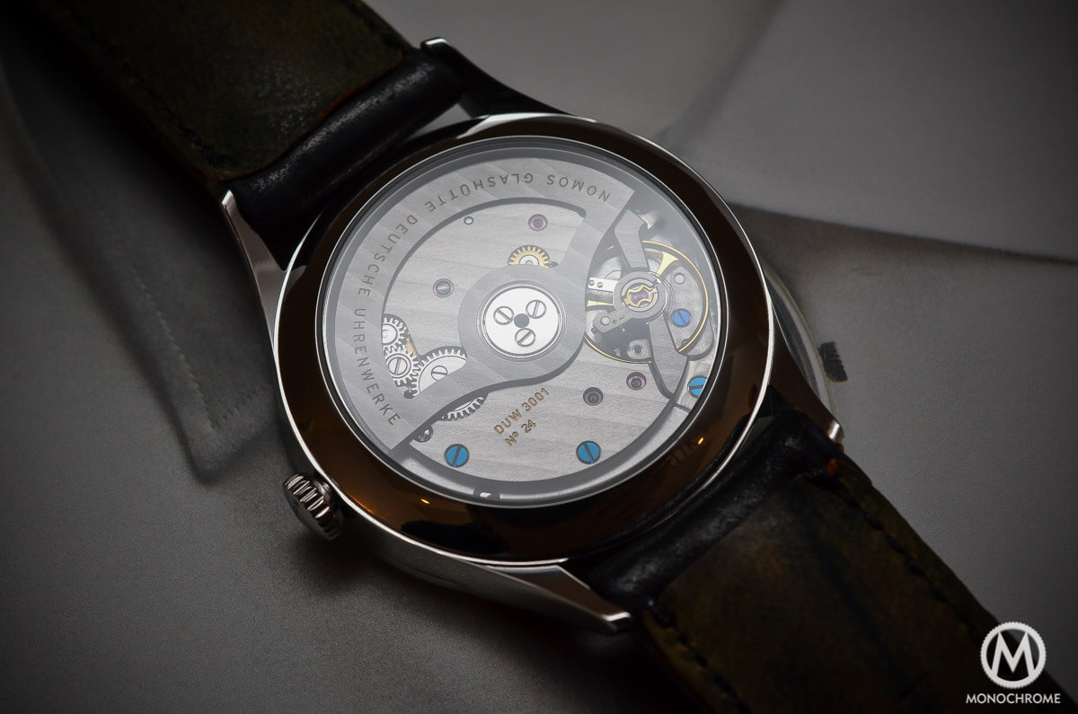 The Calibre DUW 3001 measures 28.8mm (a huge diameter considering the small cases that creates a nice view from the caseback). The finishes are clean and pleasant, with Glashütte ribbing on the 3/4 plate, perlage on the main plate, tempered blue screws and (machined) polished bevelled angles. Of course, it comes with Nomos swing system with tempered blue balance spring and it is adjusted in 6-positions. It boasts 42 hours of power reserve and ticks at 21.600 bph.