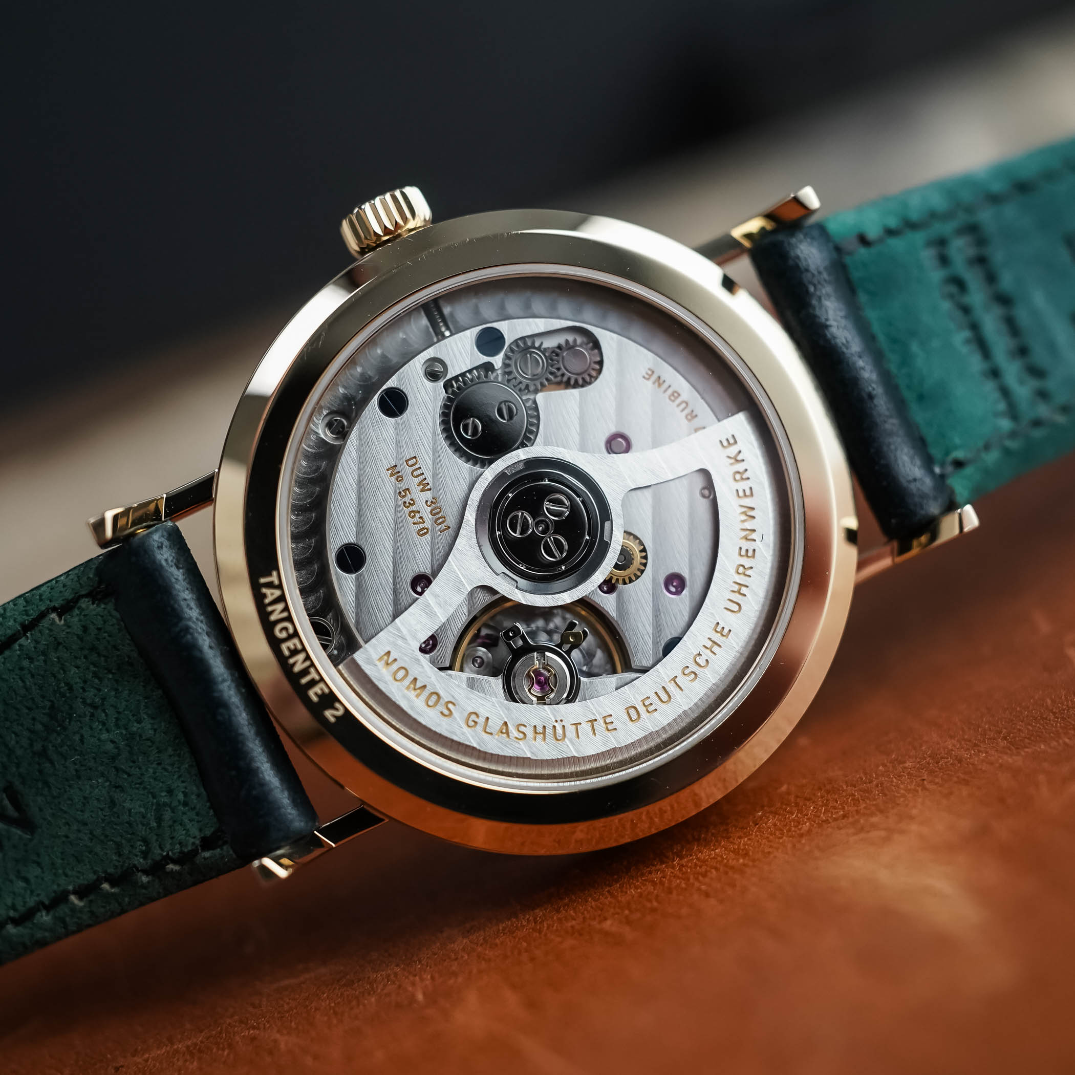 In terms of mechanics, these two precious metal dress watches take off in different directions. While both the Tangente and Ludwig are available with automatic and hand-wound movements, Nomos opted for an automatic one in the Tangente Gold and a manual one in the Ludwig Gold. It’s important to note that Nomos makes all of its own movements, minus just a very few parts. Even in its simplest calibre, the DUW 4001, which replaced the Alpha, Nomos uses its own Swing System escapement. So, in terms of production, and I know this will please quite a few, they are true in-house movements.