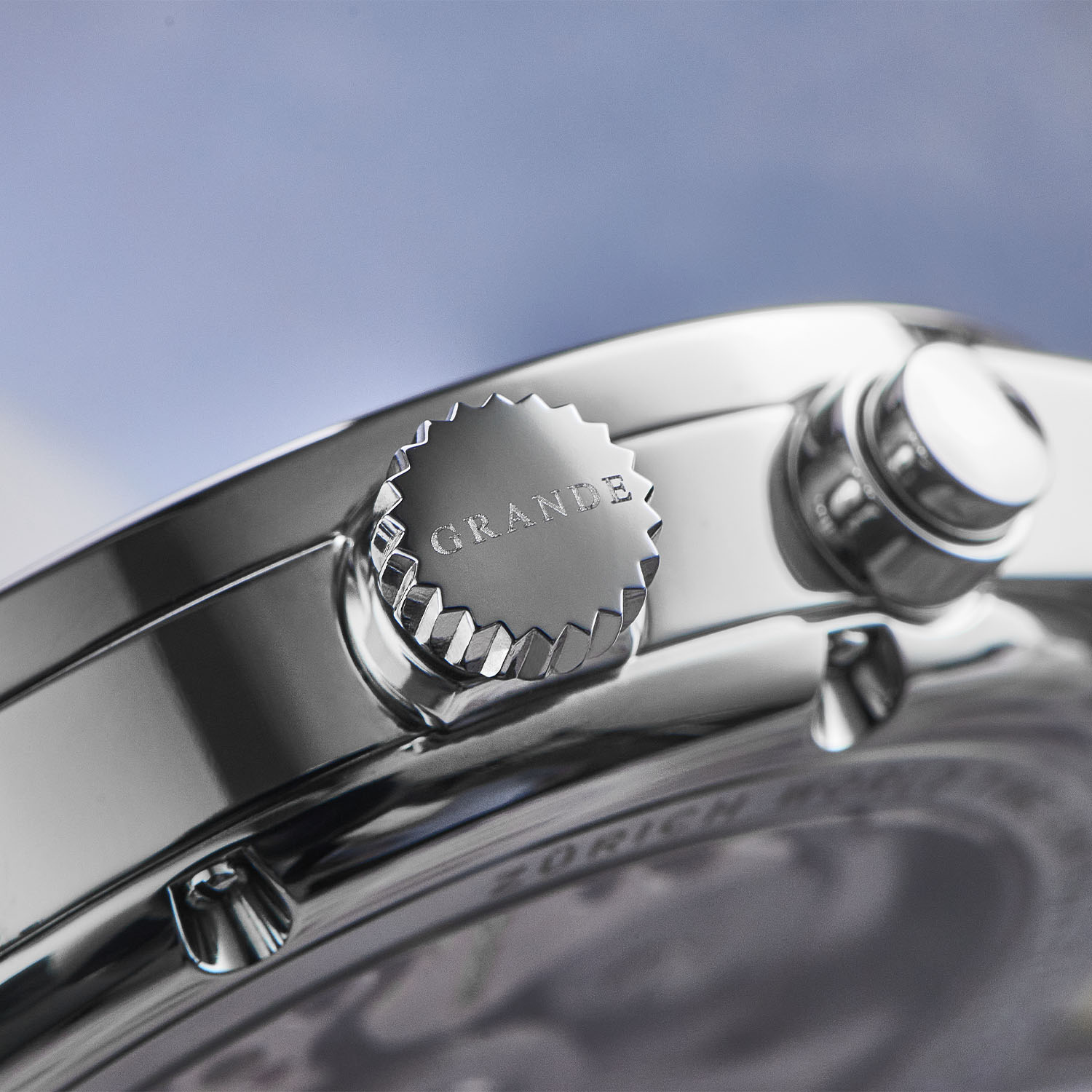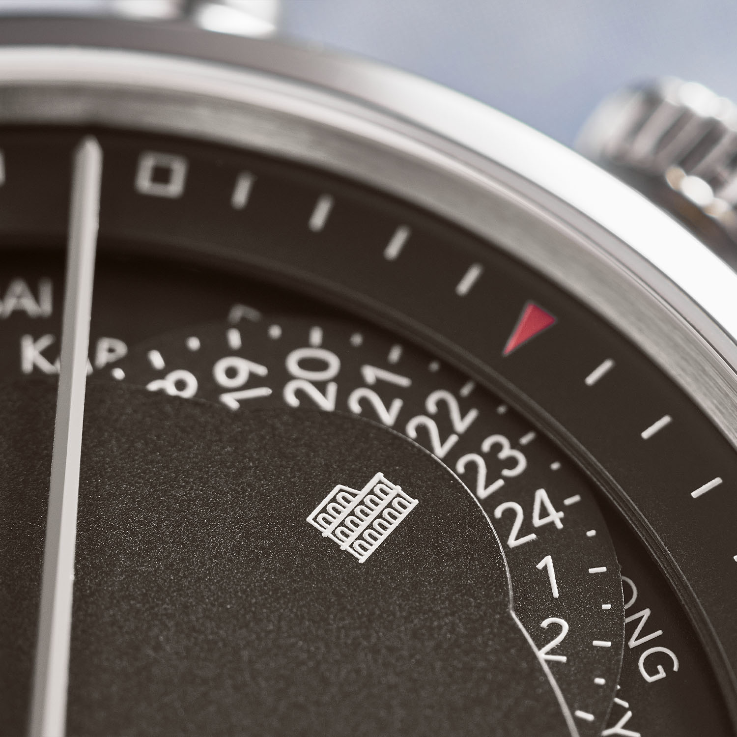 The Zurich World Time relies on the combination of a 24-city ring actuated by a pusher at 2 o’clock and a cool home-time 24-hour ring (positioned between the dial and the city ring) corrected by a recessed pusher and combined with a pointer on the dial. Under the sapphire back is the elegant and nicely finished calibre DUW 5201, an in-house automatic movement with 3Hz frequency and 42h power reserve.