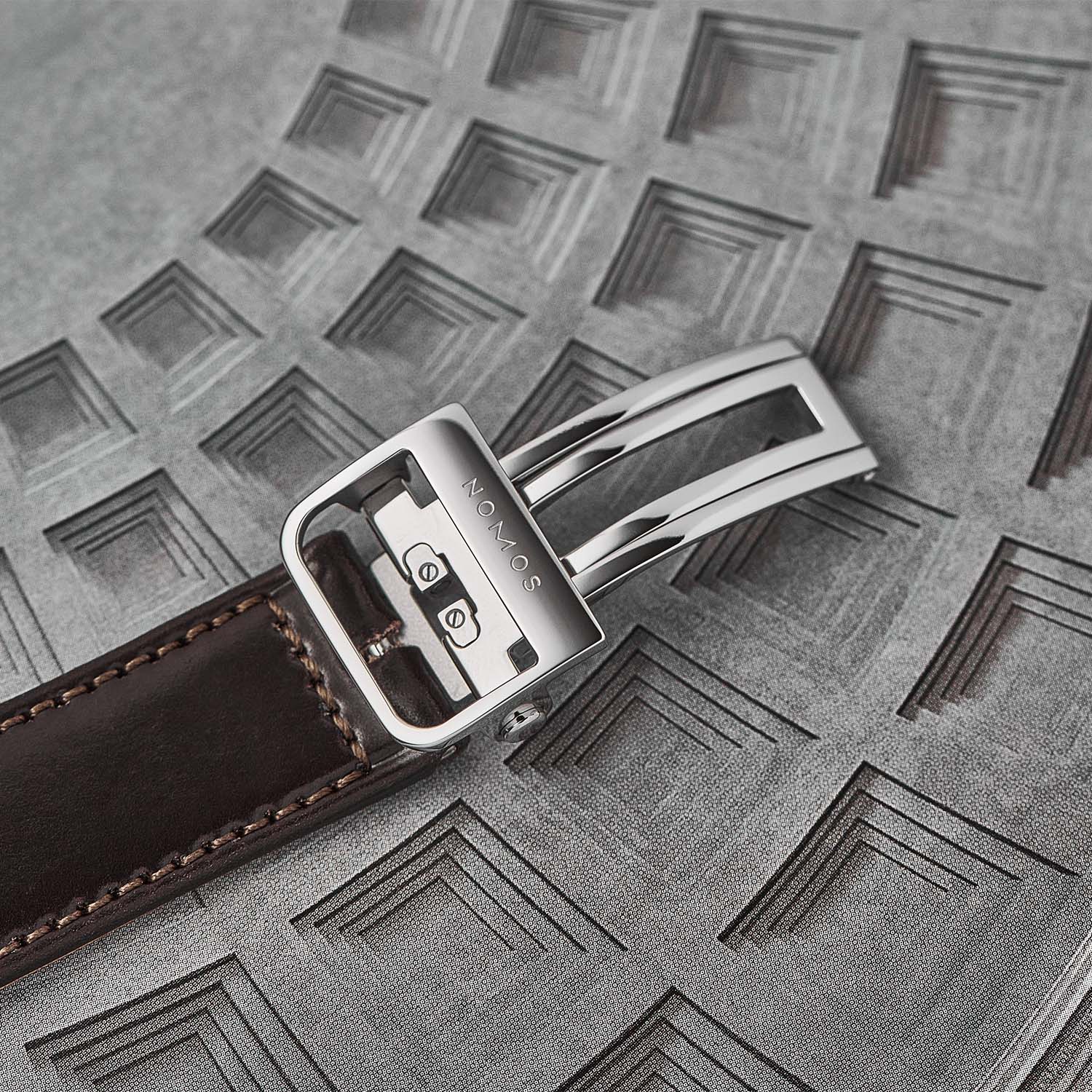 Other small details include the red Rome indication on the city ring, which replaces Berlin as the GMT+1 reference city, or the small representation of Rome’s famous Colosseum, replacing the red home drawing to indicate the home time. Finally, the crown is engraved with Grande instead of Nomos as a reference to the Italian retailer. The back also carries several unique engravings, as well as the number of the watch.