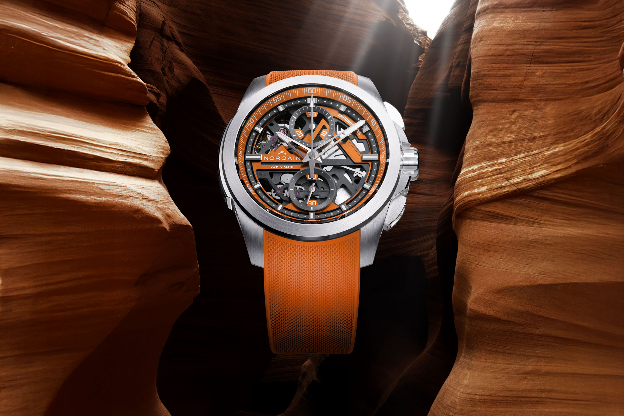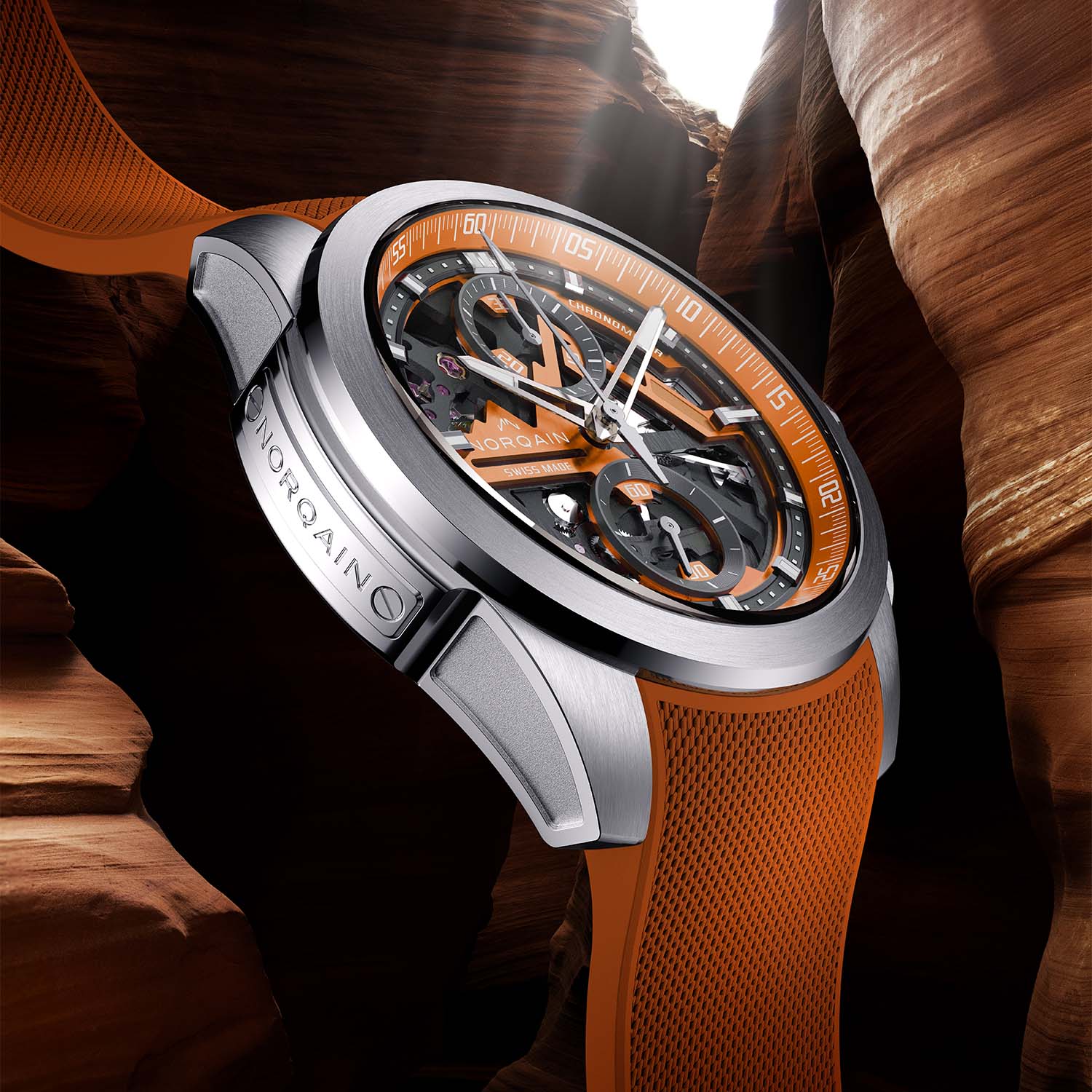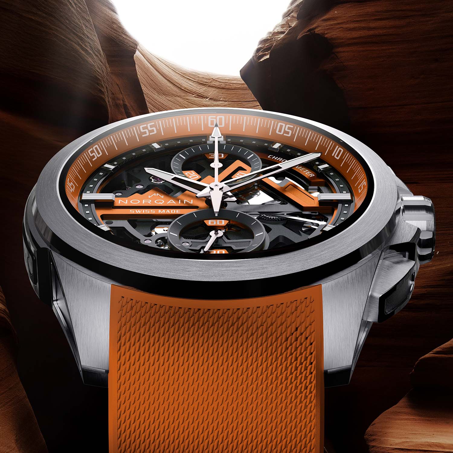 A zesty orange version of Norqain’s skeletonised flyback chronograph.