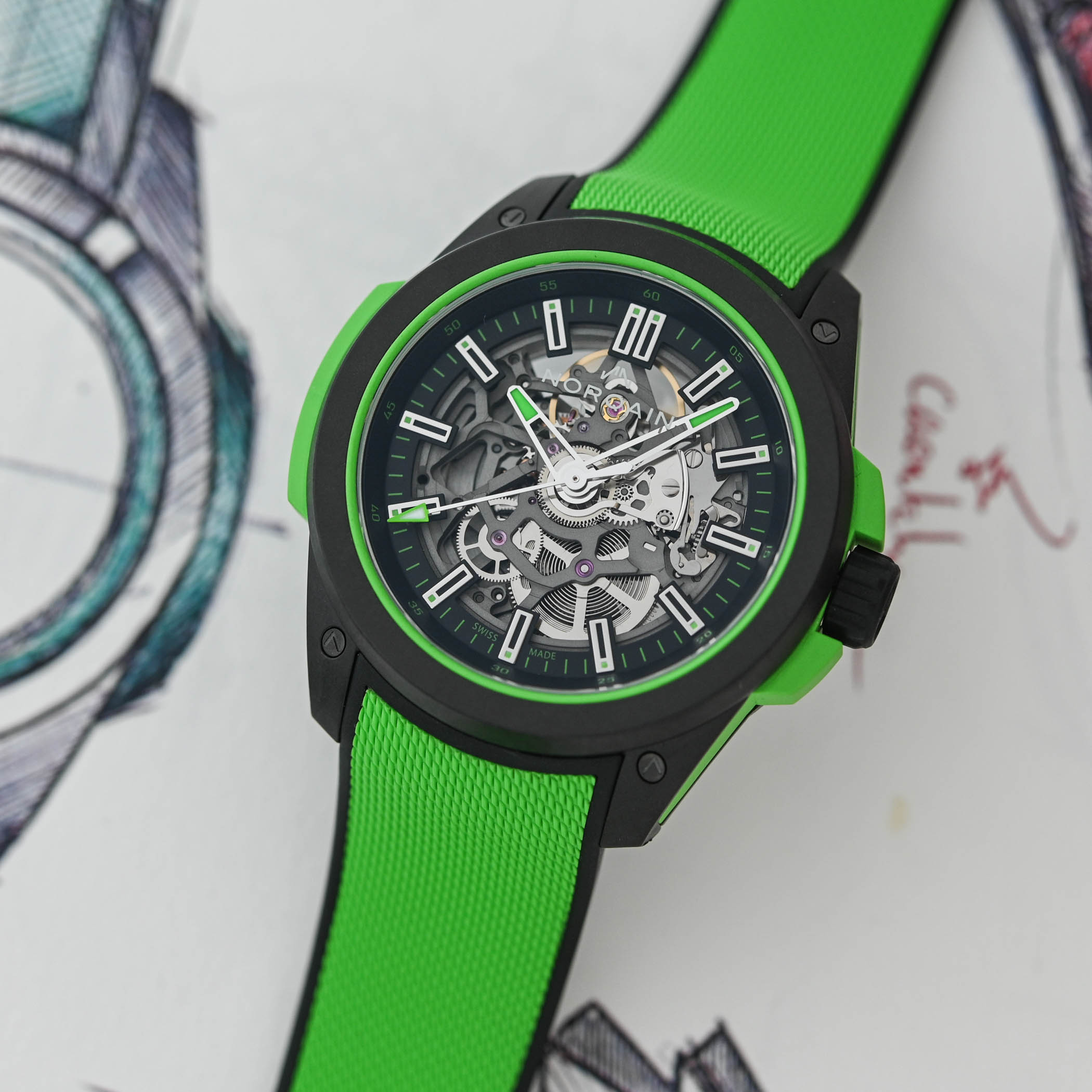 The openworked dial with grey skeletonised bridges reveals the automatic calibre N08S (Sellita SW200). The indices attached to the peripheral chapter ring with red or green markings are suspended over the dial and treated with gecko green or coral red Super-LumiNova. The hour and minute hands also play with the thematic colours and feature matching SLN inserts, while the central seconds hand has a white luminescent insert. The two models are presented on animal cruelty-free black rubber straps with a mesh insert in coral red or gecko green.