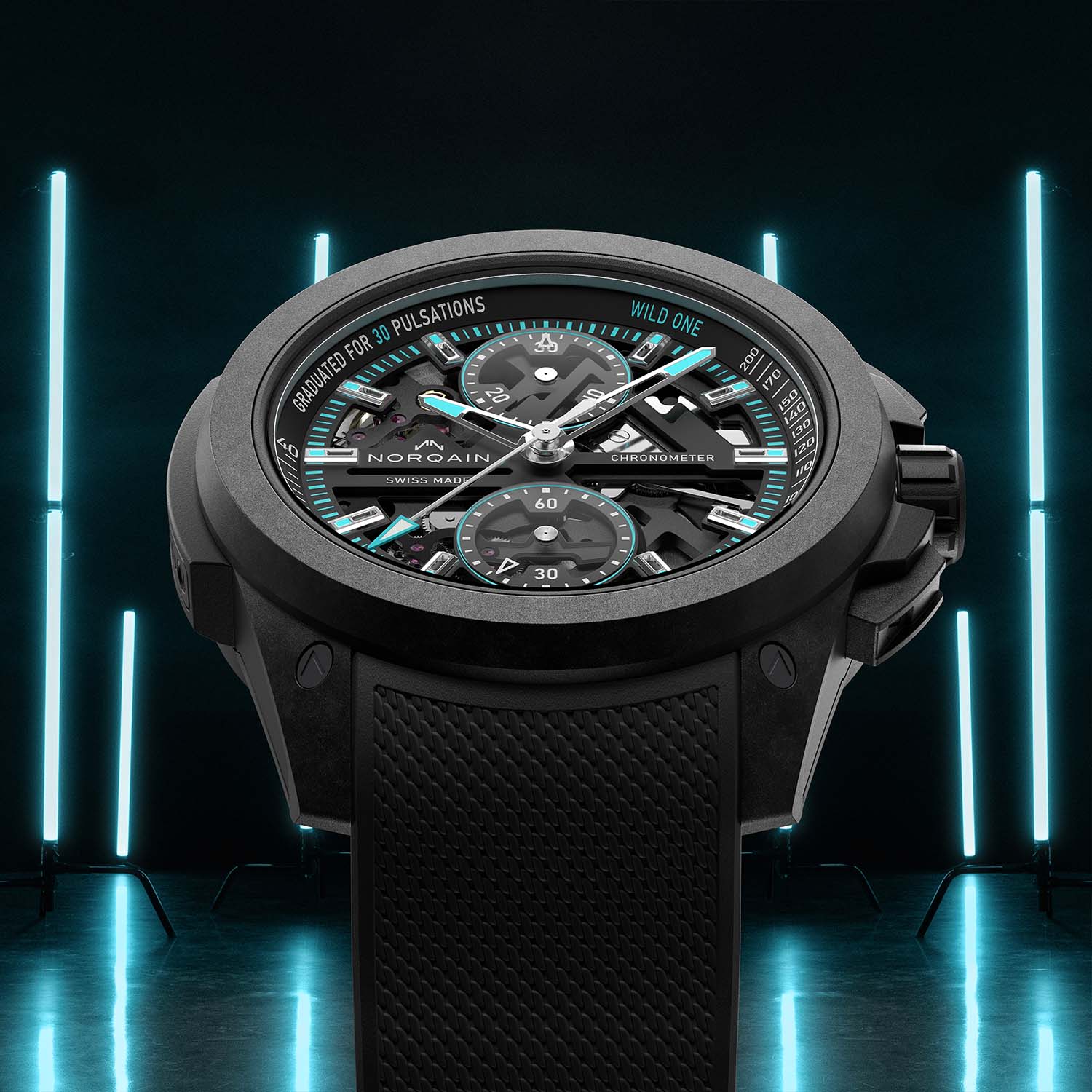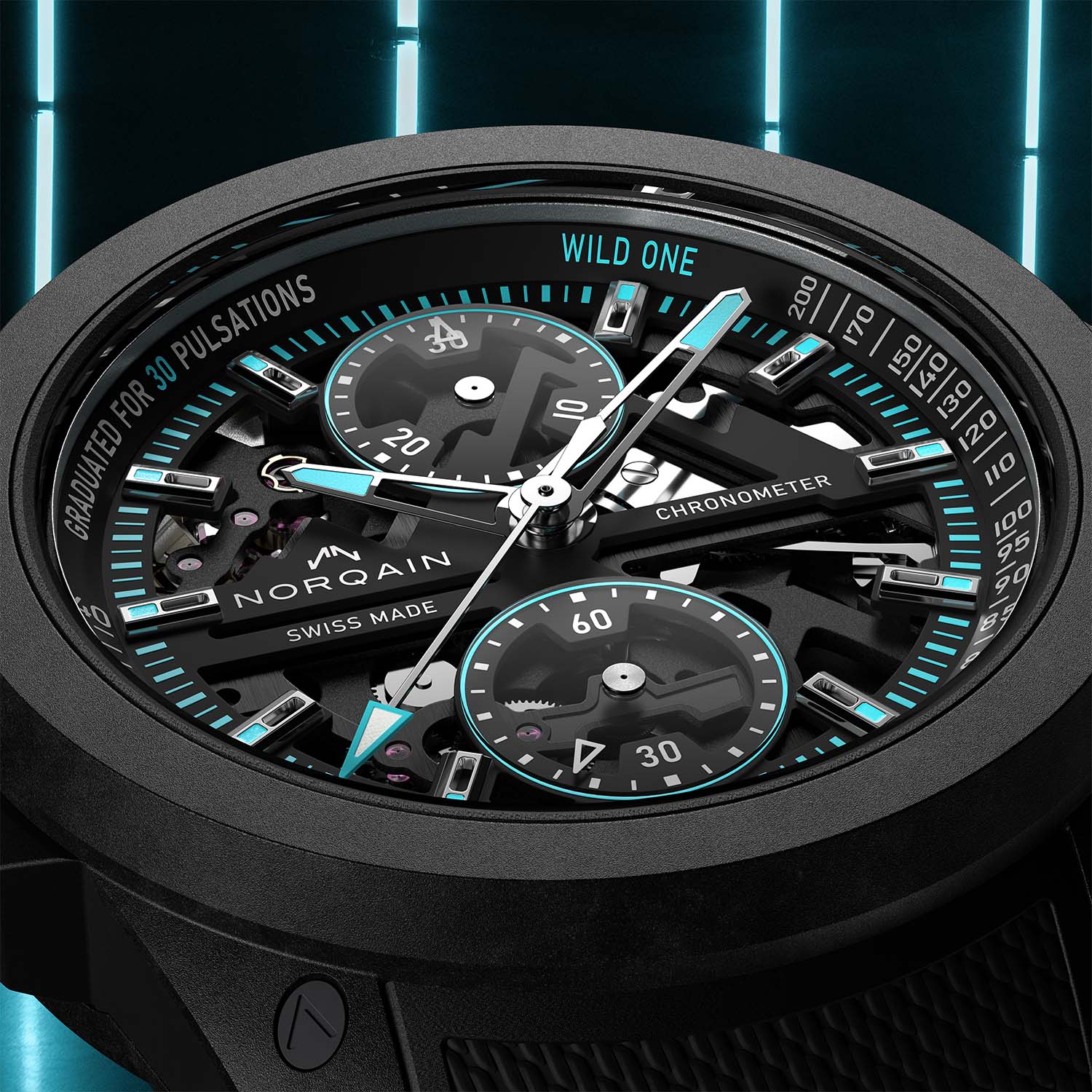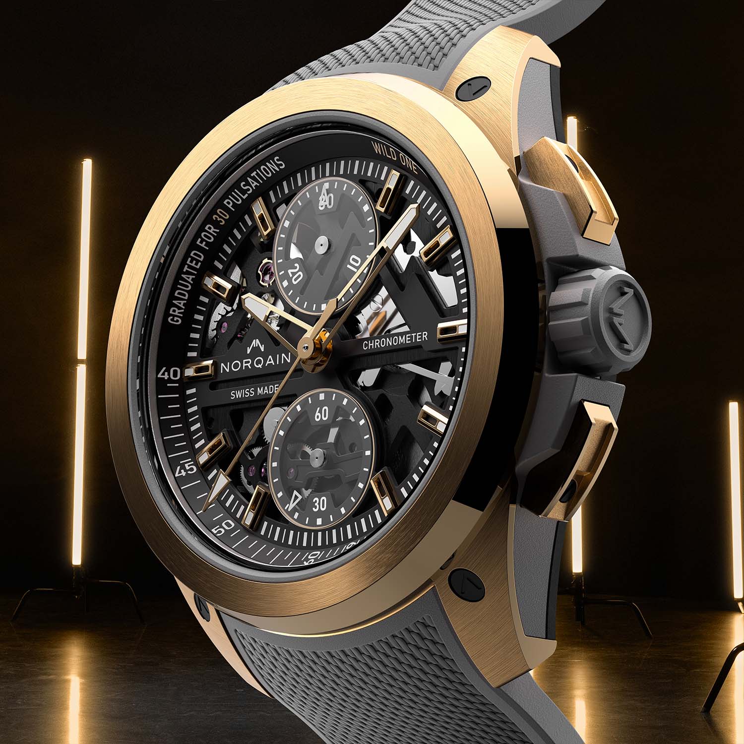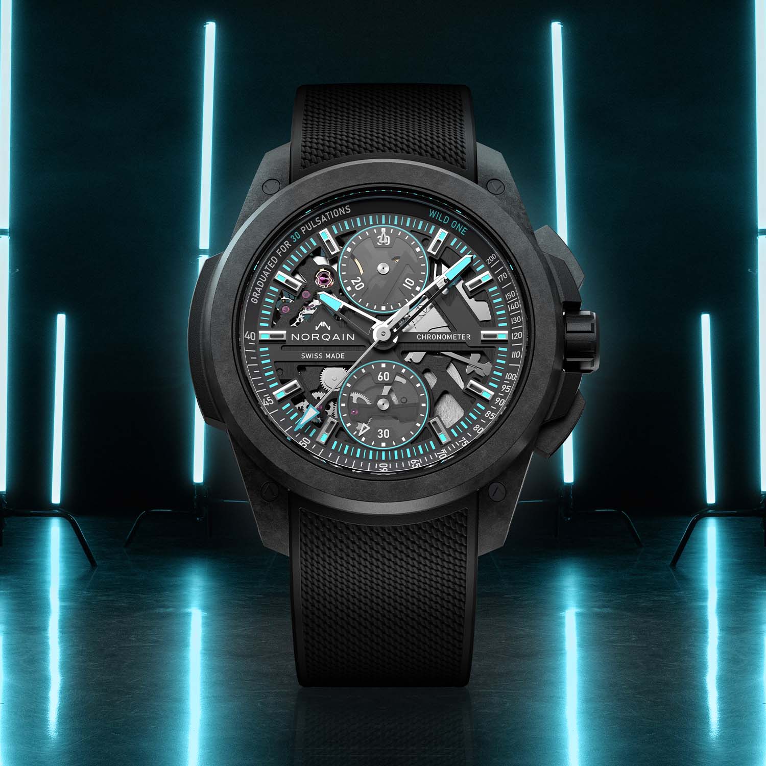 Norteq is an exceptionally robust, super-light and ultra-resistant carbon fibre composite with a polymer matrix that can also be produced in any colour under the rainbow. Thanks to the complex 25-part Wild One Skeleton Chrono case with a rubber shock absorber, a titanium container for the movement and a carbon fibre Norteq protective cage secured with screws, most cases can withstand shocks of up to 5,000 g. The screw-down crown, sheathed in black or grey rubber, ensures the Wild One’s 200m water-resistance rating.