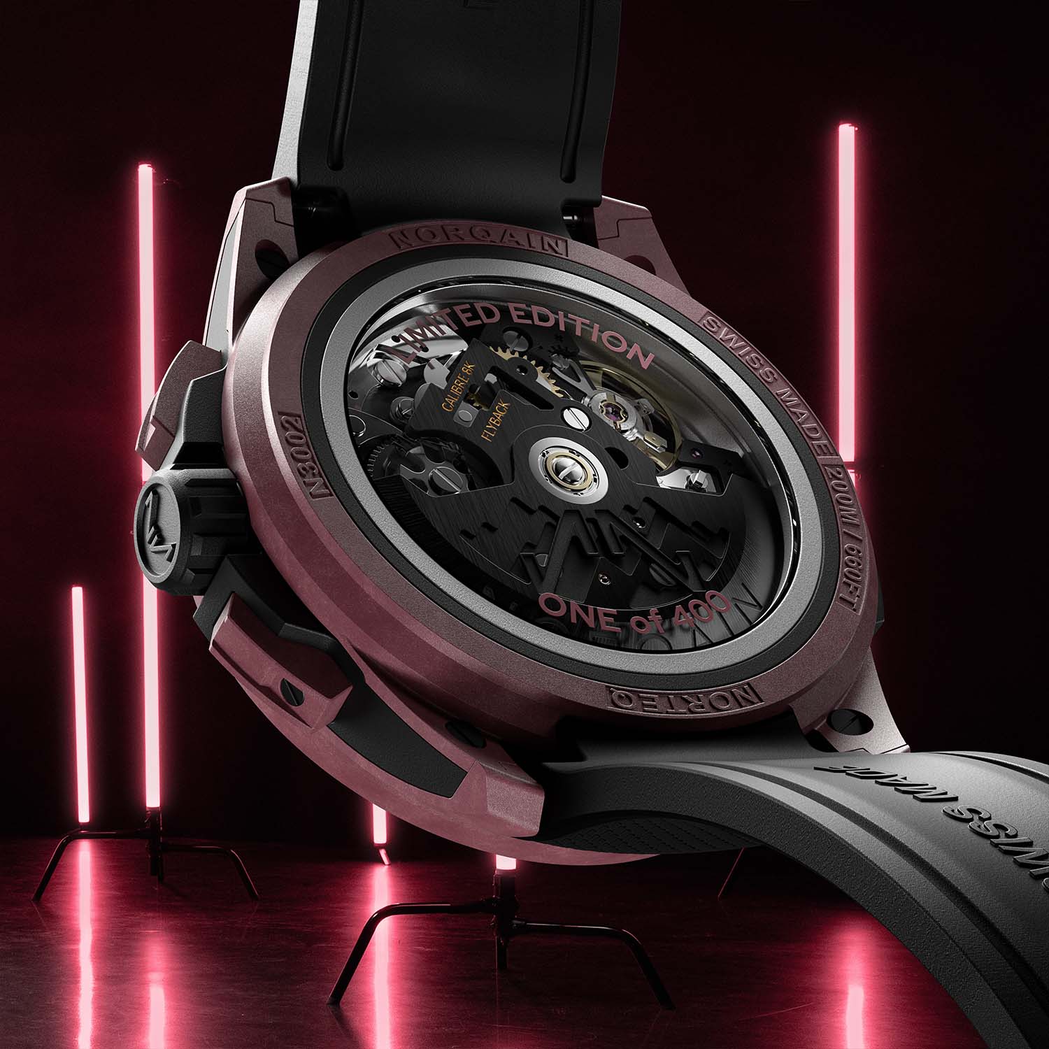The three Wild One Skeleton Chrono models can be ordered with rubber straps and pin buckles or folding clasps. Prices for the watches paired with a rubber strap and pin buckle range from CHF 7,200 for the standard black model to CHF 7,300 for the burgundy model, rising to CHF 18,950 for the red gold reference. For more information, please visit Norqain.com.