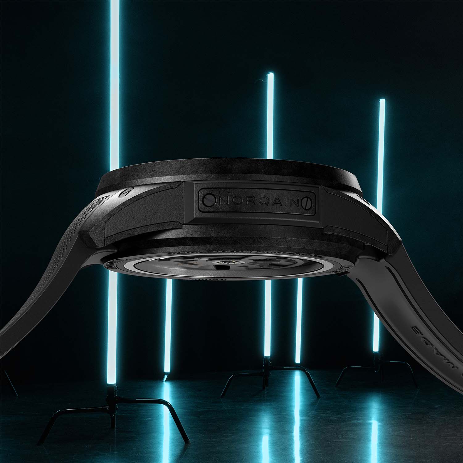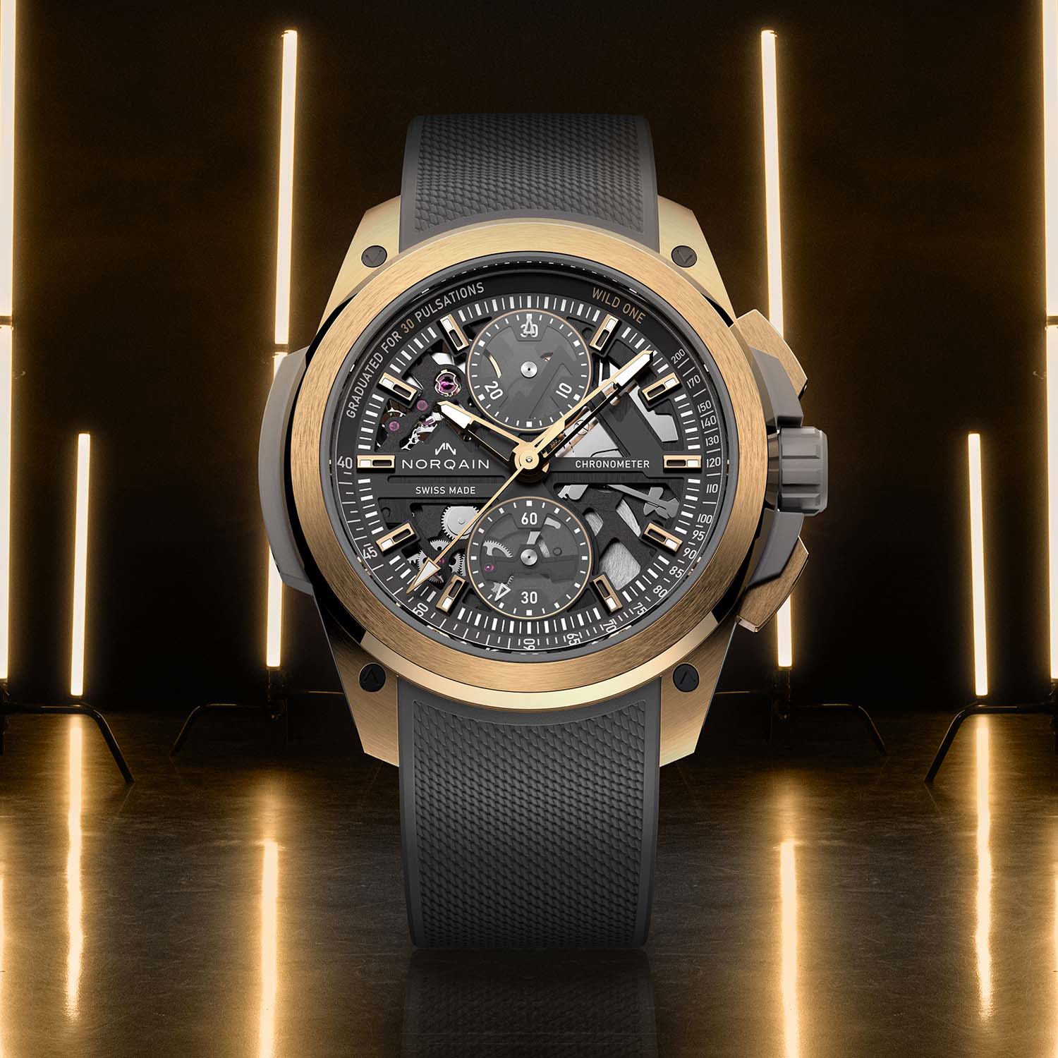 Norteq is an exceptionally robust, super-light and ultra-resistant carbon fibre composite with a polymer matrix that can also be produced in any colour under the rainbow. Thanks to the complex 25-part Wild One Skeleton Chrono case with a rubber shock absorber, a titanium container for the movement and a carbon fibre Norteq protective cage secured with screws, most cases can withstand shocks of up to 5,000 g. The screw-down crown, sheathed in black or grey rubber, ensures the Wild One’s 200m water-resistance rating.