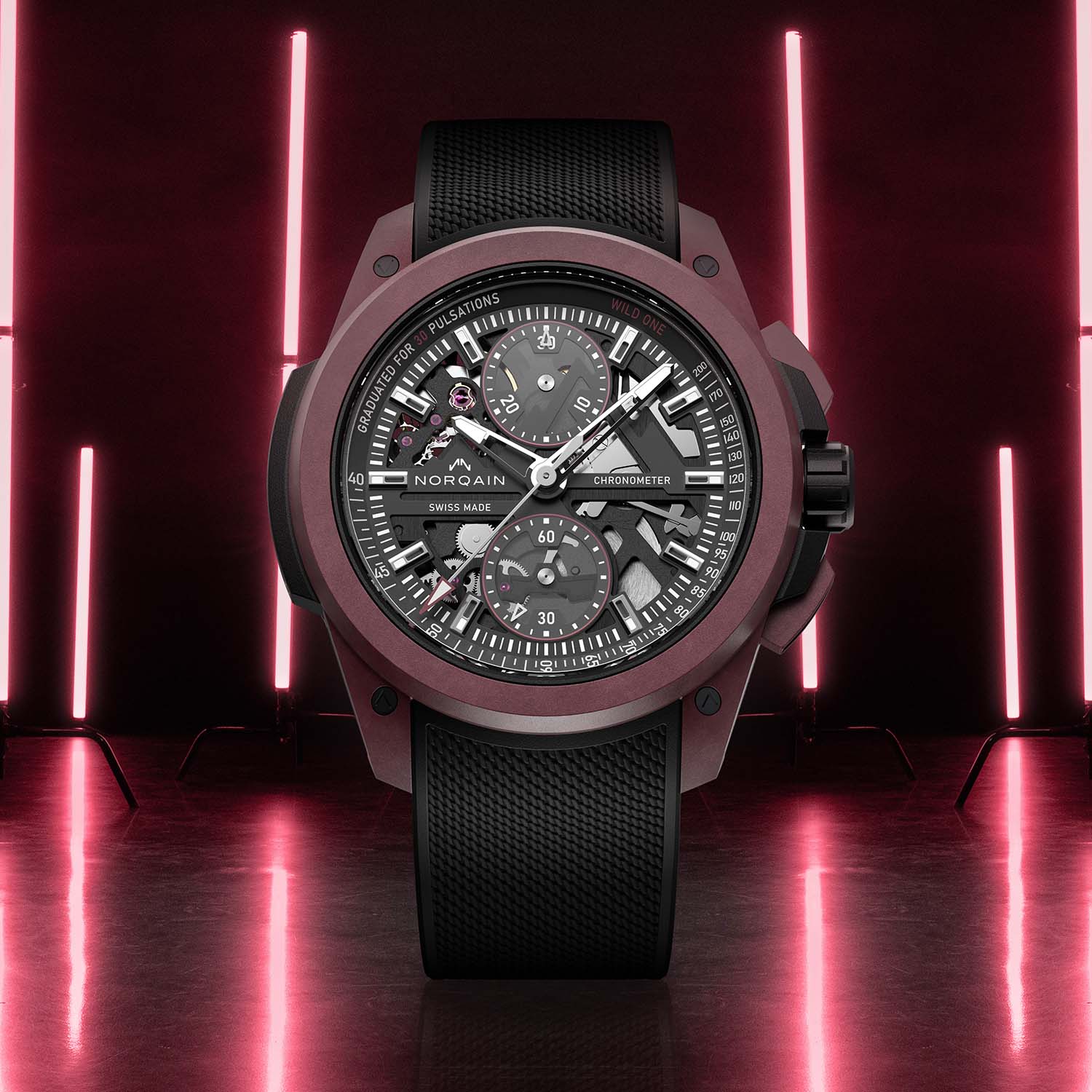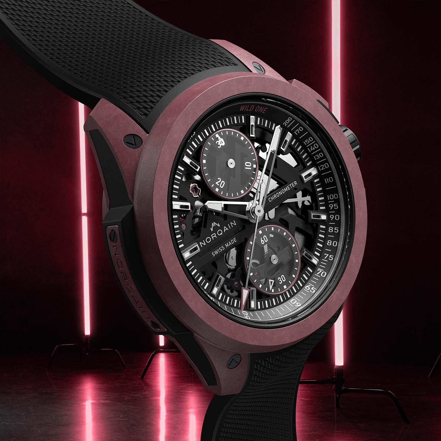 The three Wild One Skeleton Chrono models can be ordered with rubber straps and pin buckles or folding clasps. Prices for the watches paired with a rubber strap and pin buckle range from CHF 7,200 for the standard black model to CHF 7,300 for the burgundy model, rising to CHF 18,950 for the red gold reference. For more information, please visit Norqain.com.