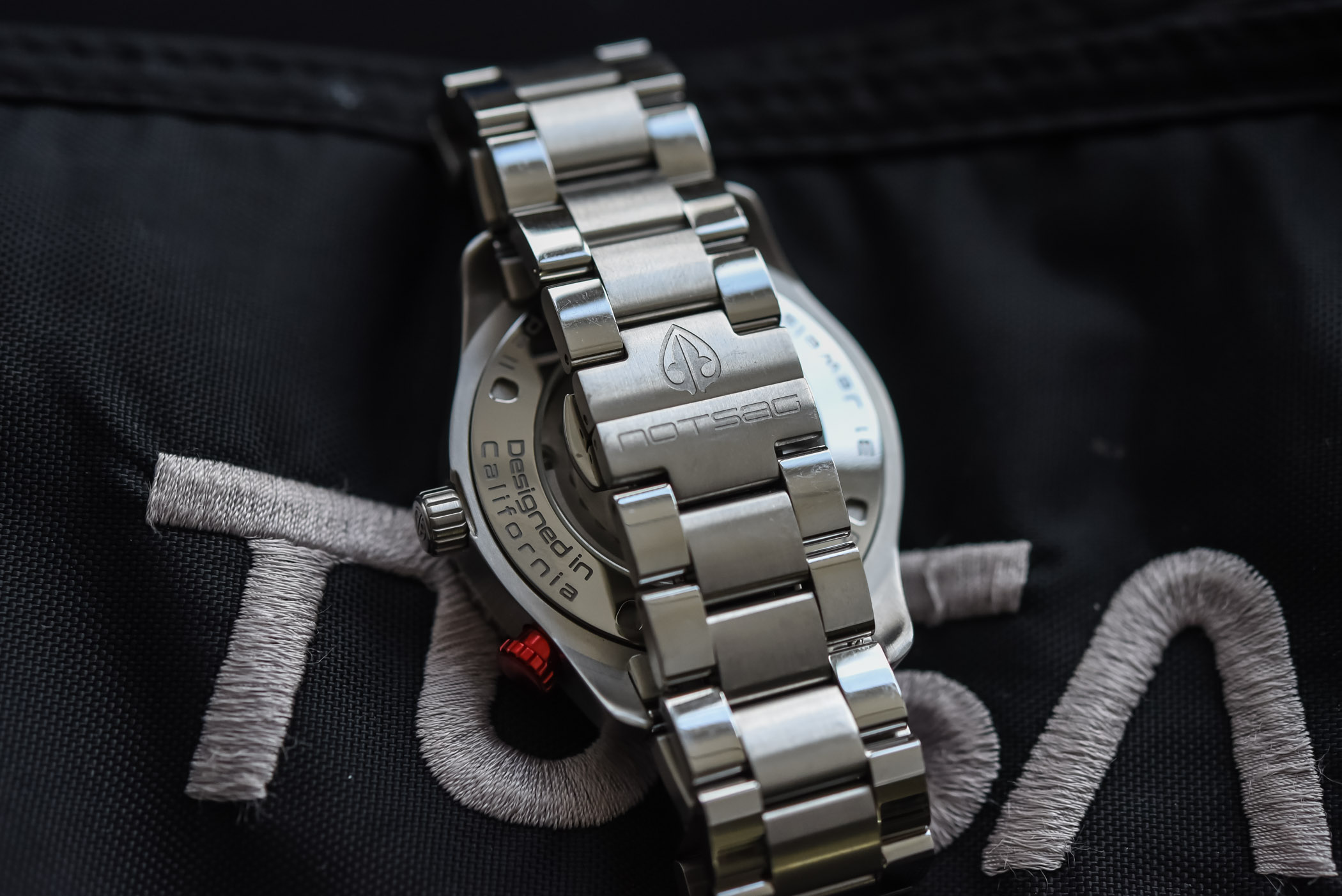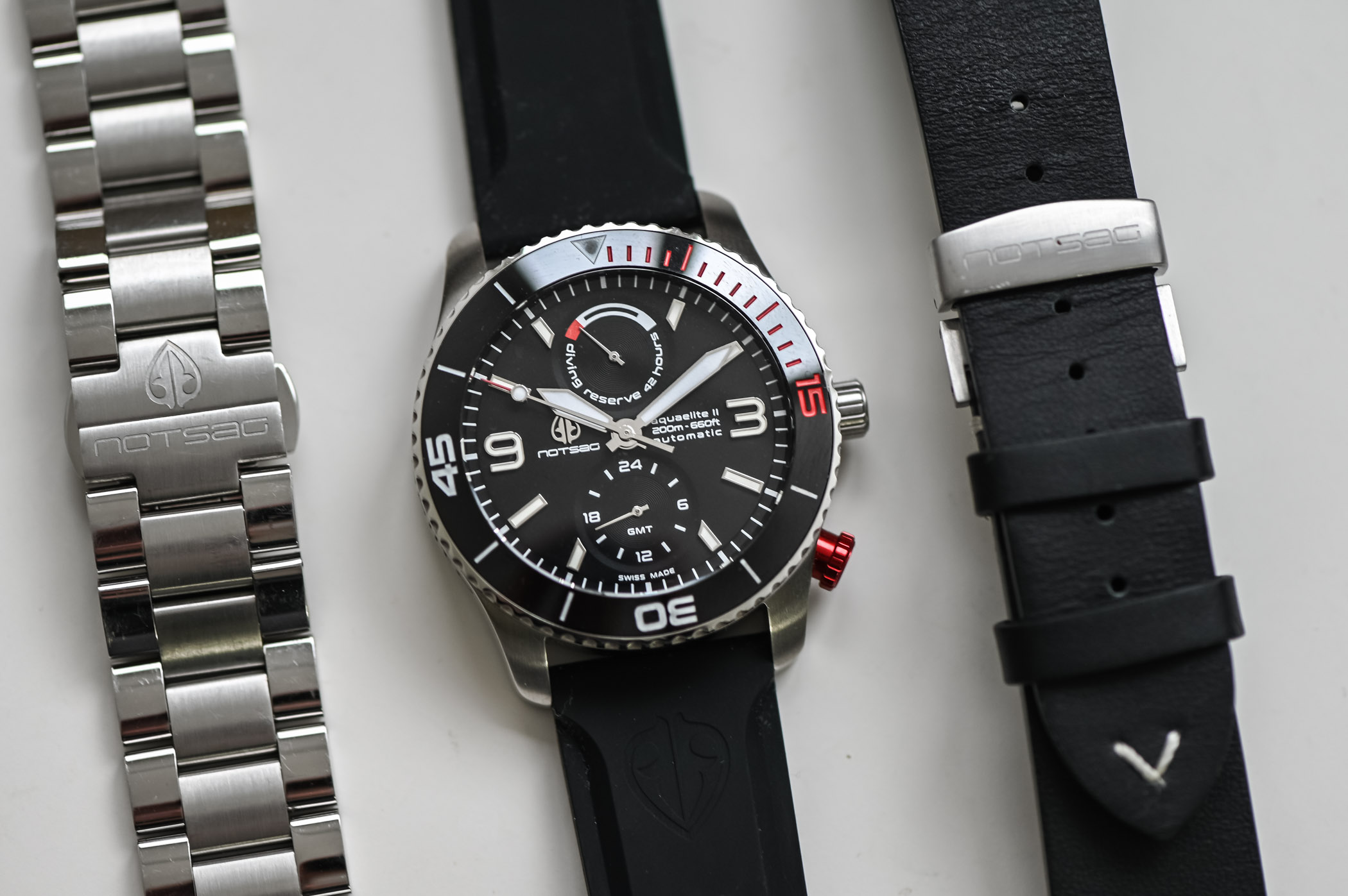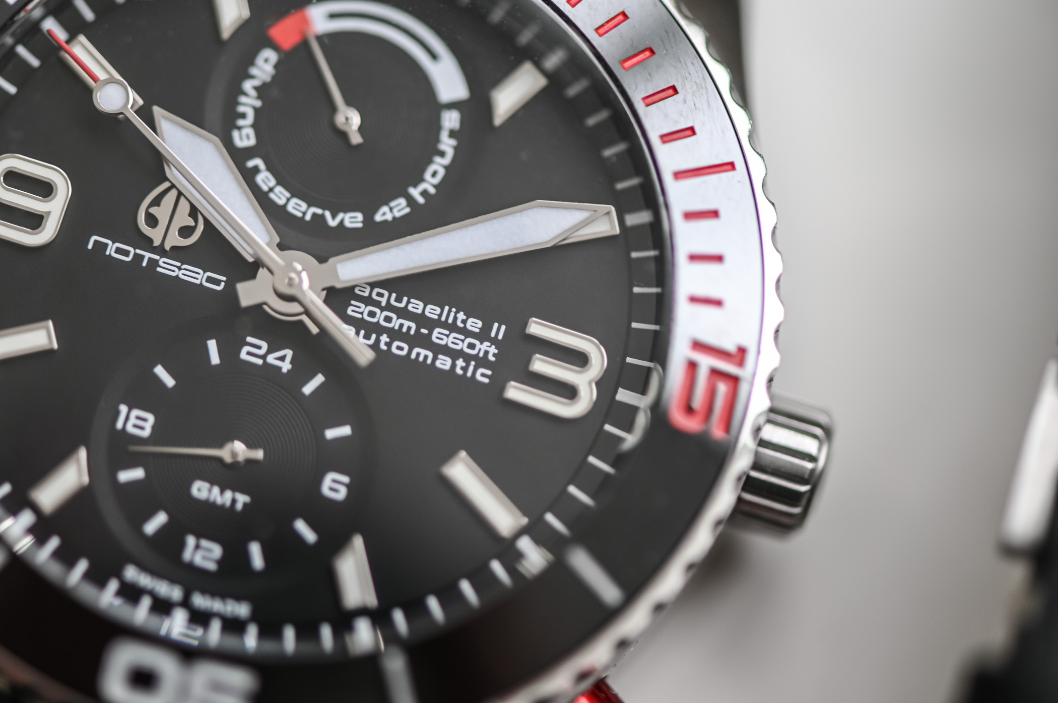 The NOTSAG Aquaelite Type II shares the 42mm stainless steel case with the Type I with a height of 13.56mm (lug to lug is 49mm). A black DLC coating is also available. The 120-click bezel is unidirectional with a 5mm polished black ceramic insert that features a detailed 15-minute scale in red. The indices, numerals and inverted triangular marker are all coated with Super-LumiNova BGW9 for a bold green glow at night. The domed sapphire crystal with an anti-reflective coating adds almost 1mm to the overall height (12.6mm to 13.56mm) and the sapphire exhibition caseback displays an upgraded Swiss Soprod automatic. The signed crown at 3 o’clock screws down and a second red pusher at 4:30, just above the bottom right lug, advances the GMT hand in one-hour increments. Like the crown, the pusher screws down for additional water-resistance, which is 200 metres. That’s a serious rating and double your average microbrand diver.