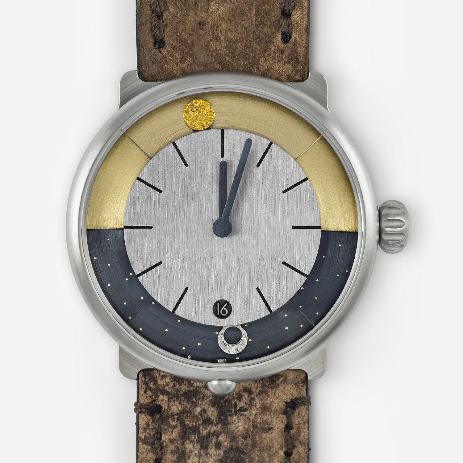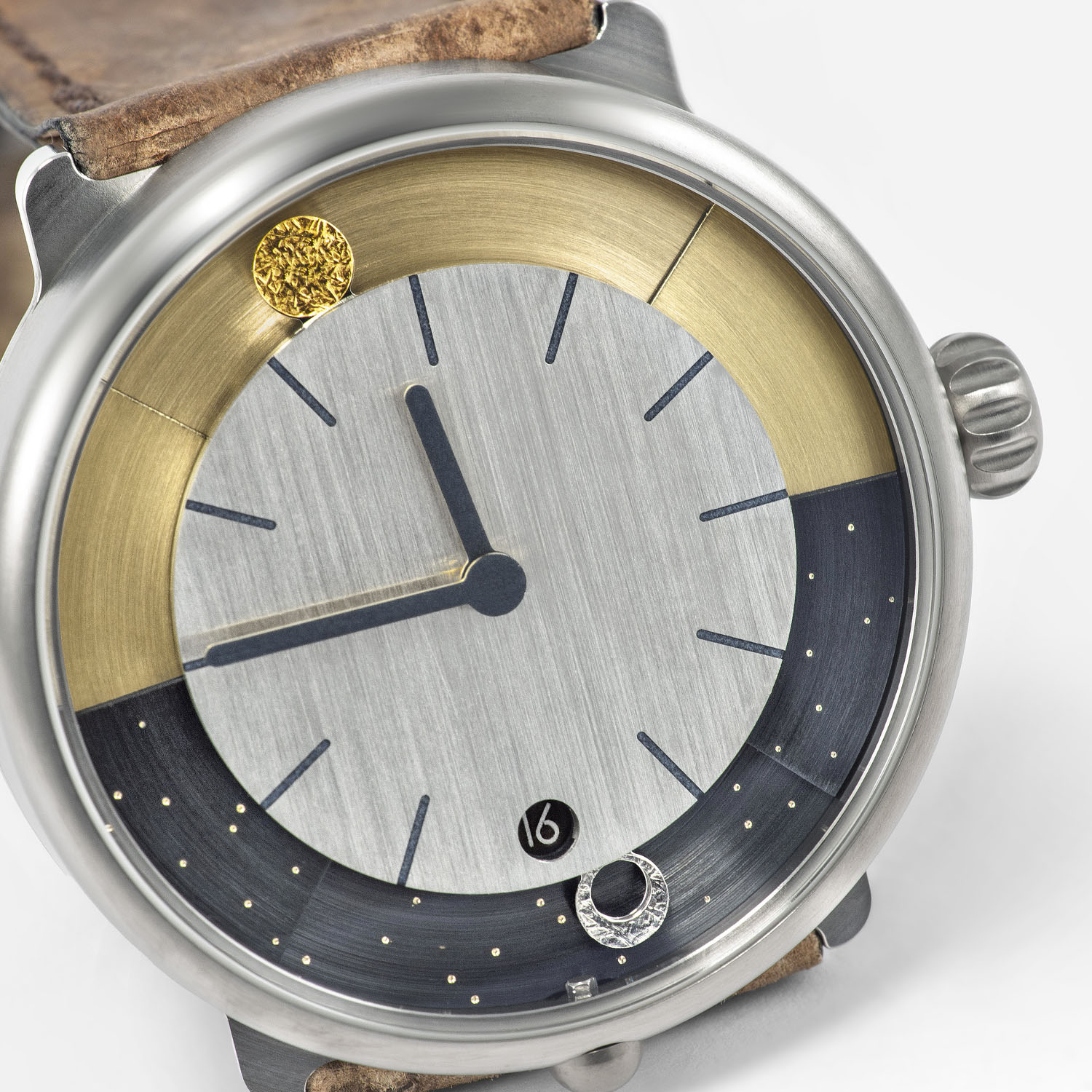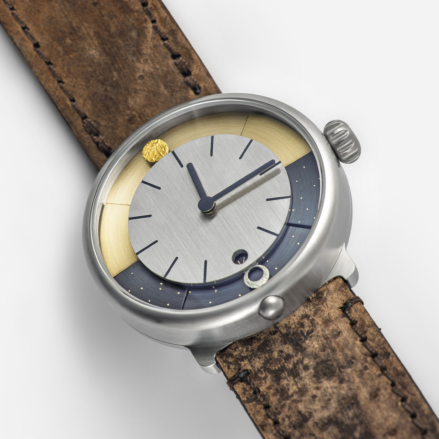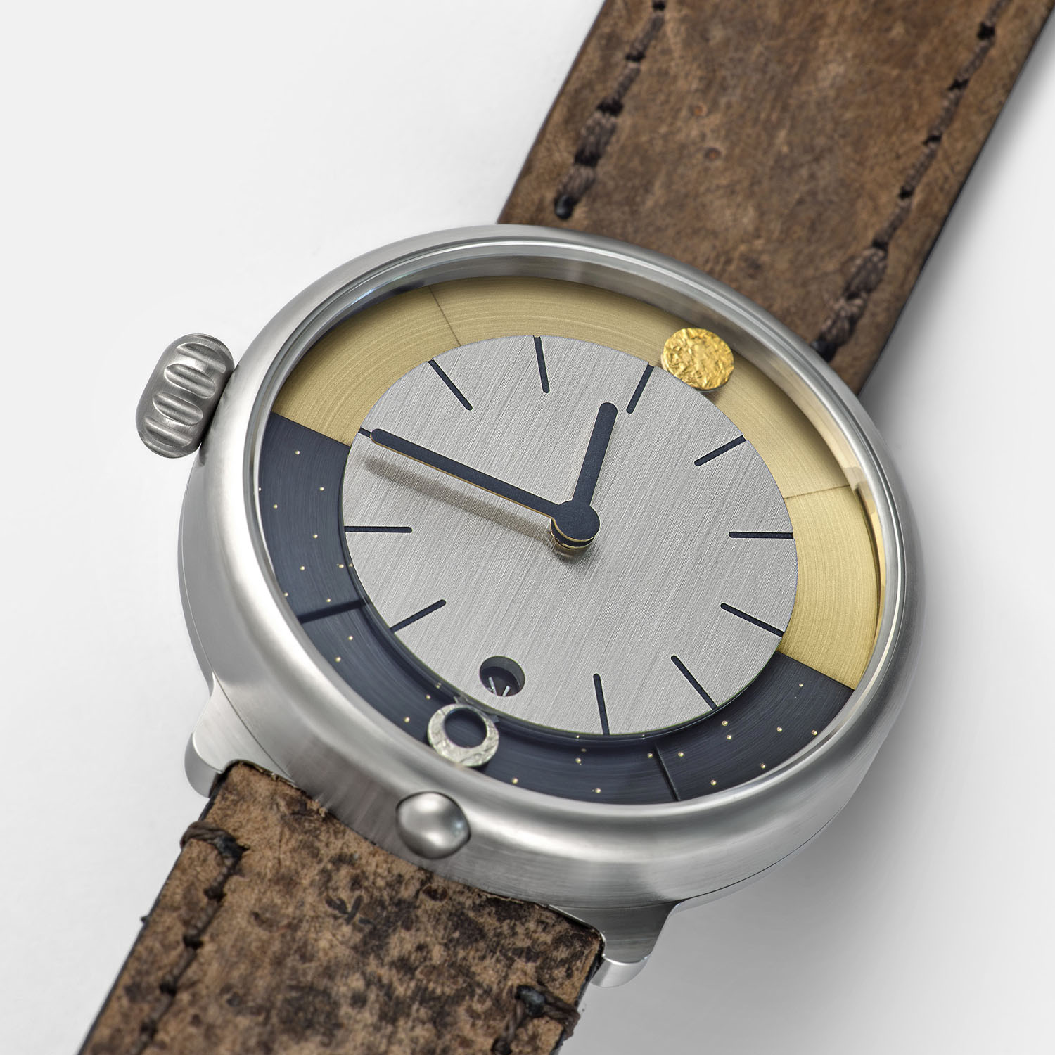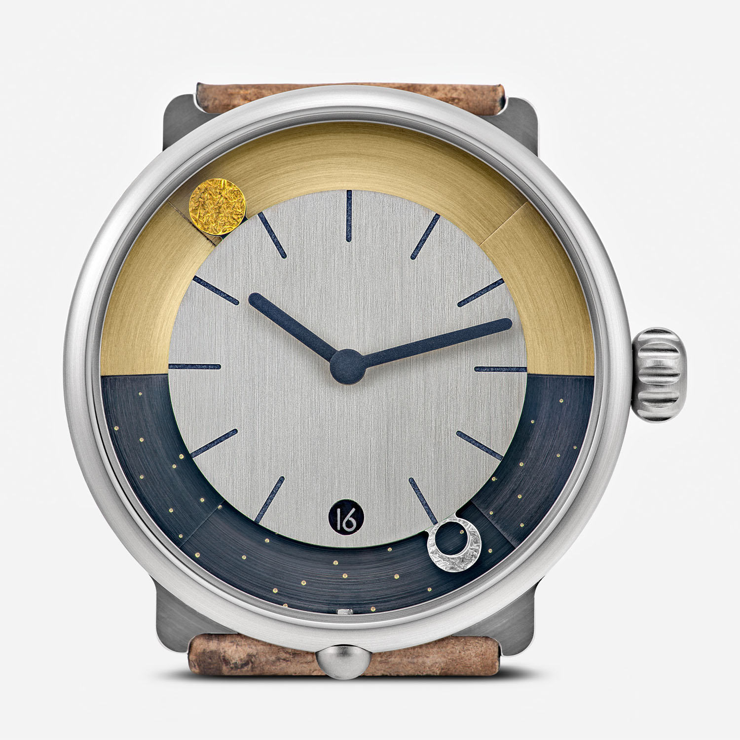 Take a look at the exhaustive list of complications that this deceptively simple watch has: location of the sun and the moon in the sky, length of day and night, sunrise, sunset, solar noon, moon phase, and a compass.