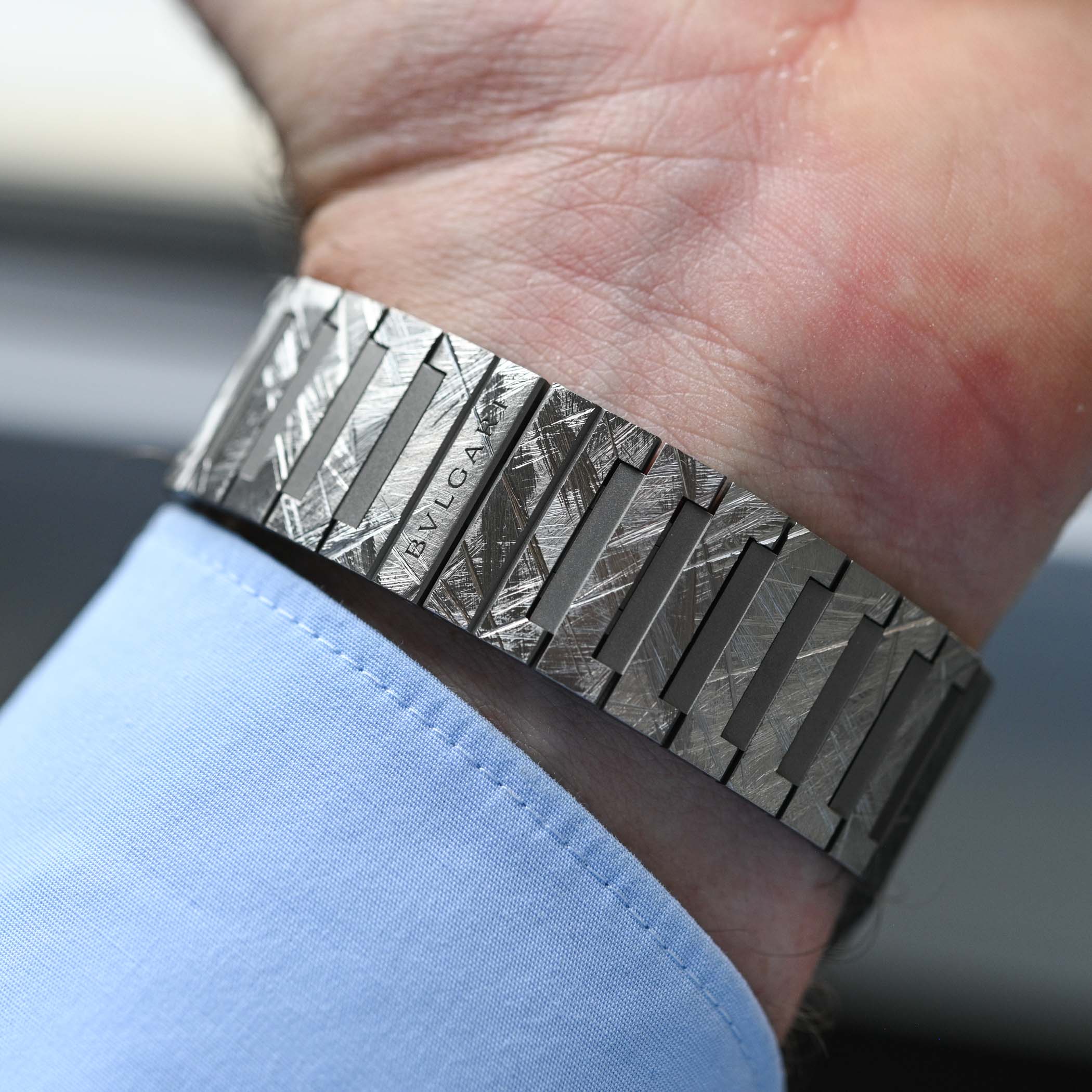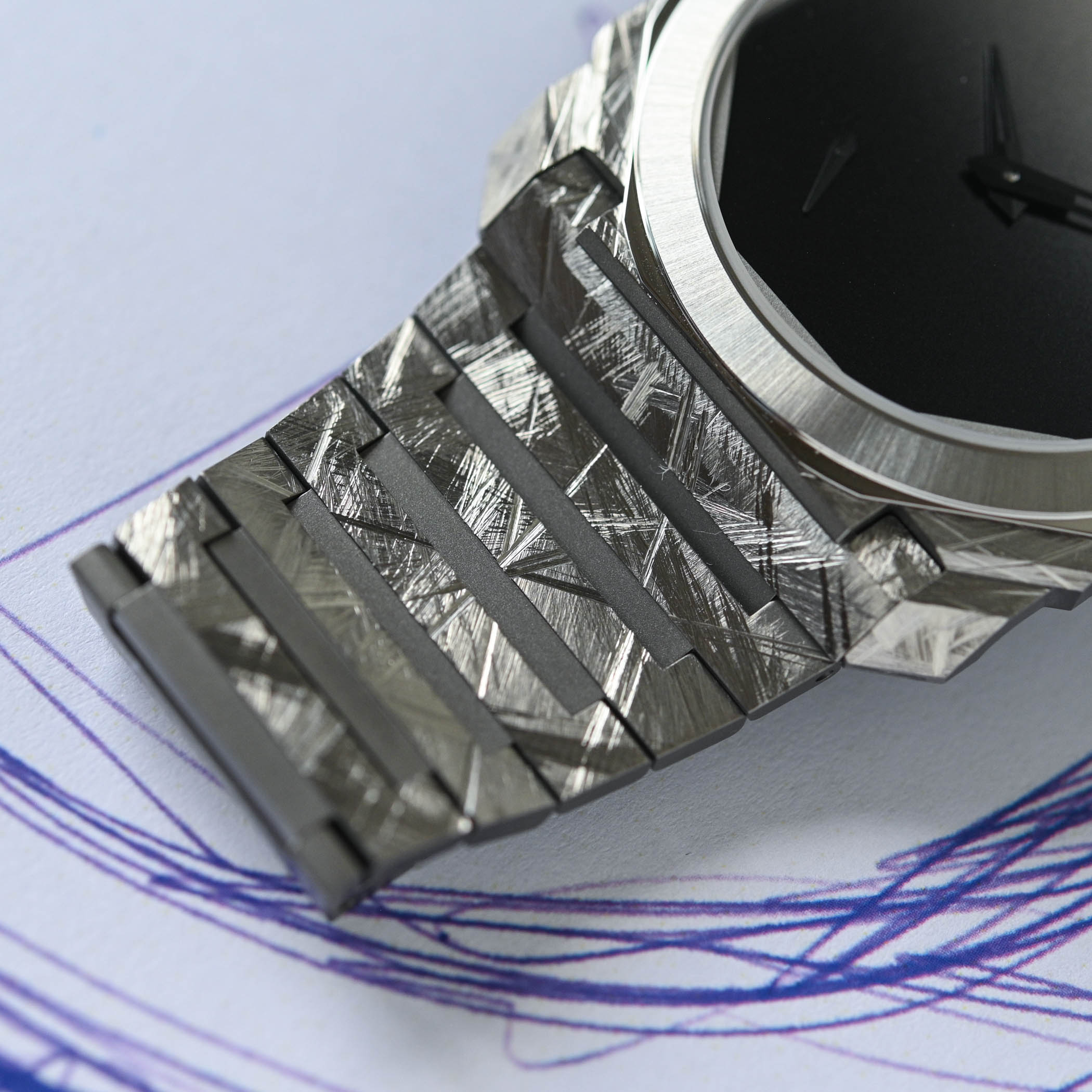 The 40mm titanium case with its ultra-slim profile of just 5.15mm and the integrated titanium bracelet are filed by hand to create a series of raw, crisscrossing patterns – similar to those you might find on a meteorite dial. Instead of muting the complex architecture of the stacked octagonal architecture, the patterns draw light and cast shadows on the facets, emphasising the powerful geometry of Buonamassa’s design.