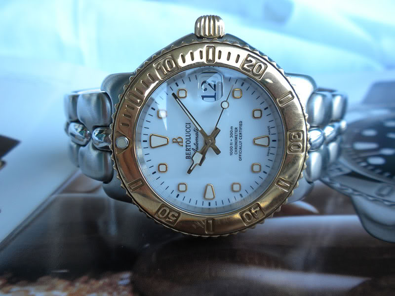 Minor points of the Vir Maris are that the divers bezel doesn’t have all the minute marks, the bracelet lacks a divers extention and that it is simply way too pretty to do any serious diving with. No, despite good credentials, the Vir Maris a more original choice for any pool playboy, other than the next COMEX-standard issue diving watch. The pool playboy wearing this Bertolucci was by no means a poser. With a 1997 price of 9900 DM (around 5,000 Euro) for the steel/gold version with steel/gold bracelet it costed much more than the 7875 DM (around 4,000 Euro) Rolex would charge you for a steel/gold GMT Master II…..
