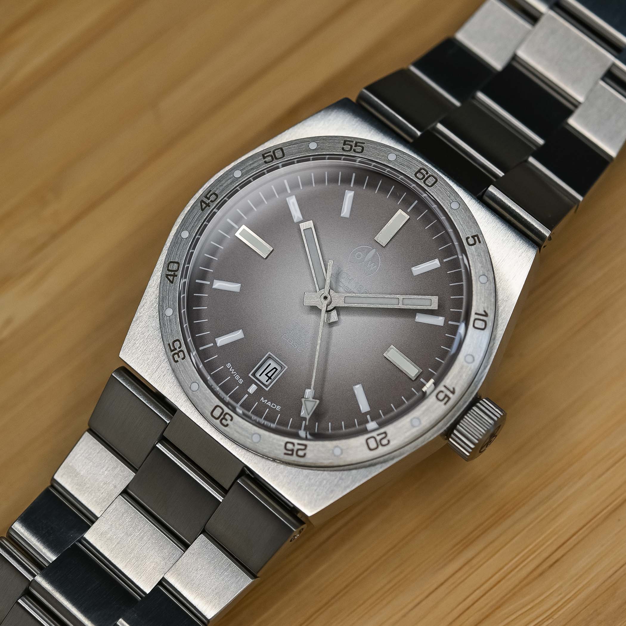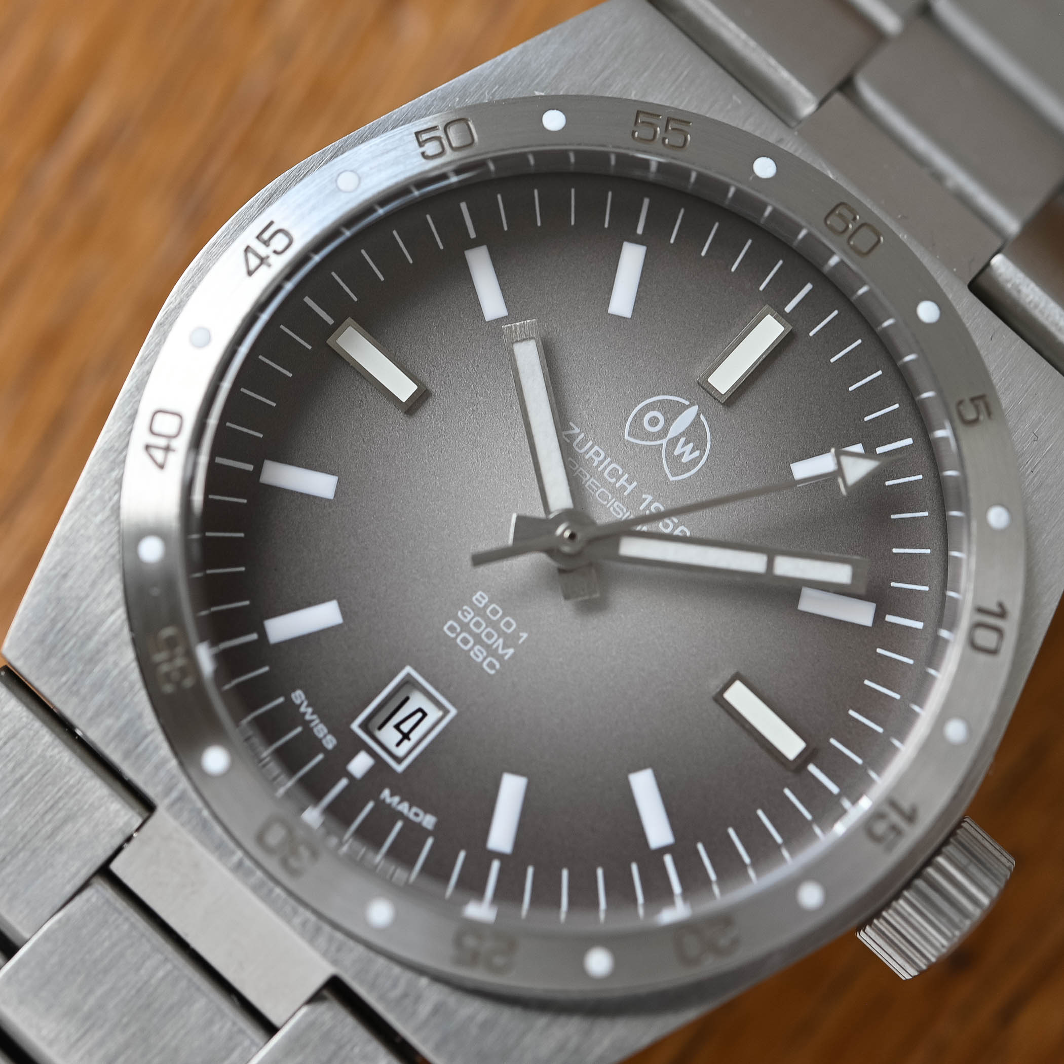 Crafted from 316L stainless steel, the brushed tonneau-style solid-slab case of the OW 8001 measures 39.56mm in diameter, with a height of 12mm – thicker than the usual integrated sports watch, but there’s a reason for that. Its robust construction, with a screwed bottom and crown, contributes to an impressive 300m water resistance. The fixed bezel features numerals at 5-minute intervals and round markers in Super-LumiNova. The fluted crown is ergonomically sized for comfortable operation, and while the watch offers wrist comfort, some may find the lugs need to be a little more articulated.