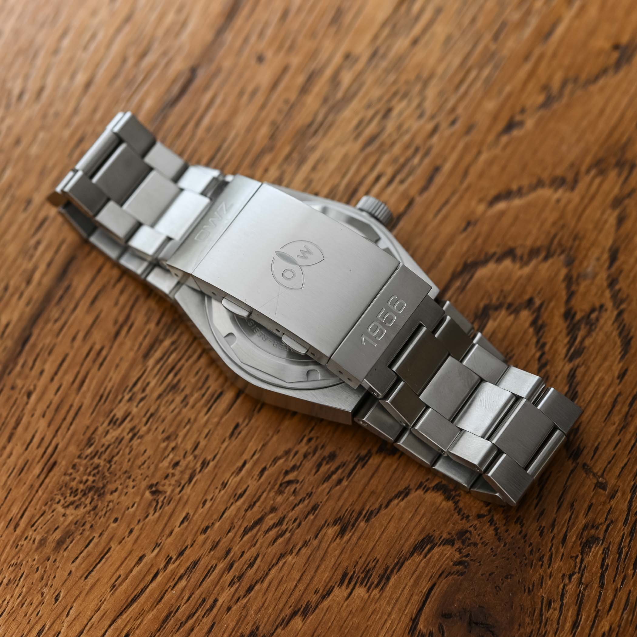 In the realm of integrated bracelet watches, attention to detail is paramount, and the OW 8001’s three-row oyster-style stainless steel bracelet exudes both style and ruggedness. Its chunky design complements the watch’s utilitarian character, enhancing its overall feel of robustness. Noteworthy is the milled clasp, which offers a double pusher-release system for micro-adjustment, allowing the bracelet to extend up to 22mm – a feature that beautifully adds practicality. The Ollech & Wajs OW 8001, available for order with an approximate 6-week delivery time, comes with a price tag of CHF 1,856.
