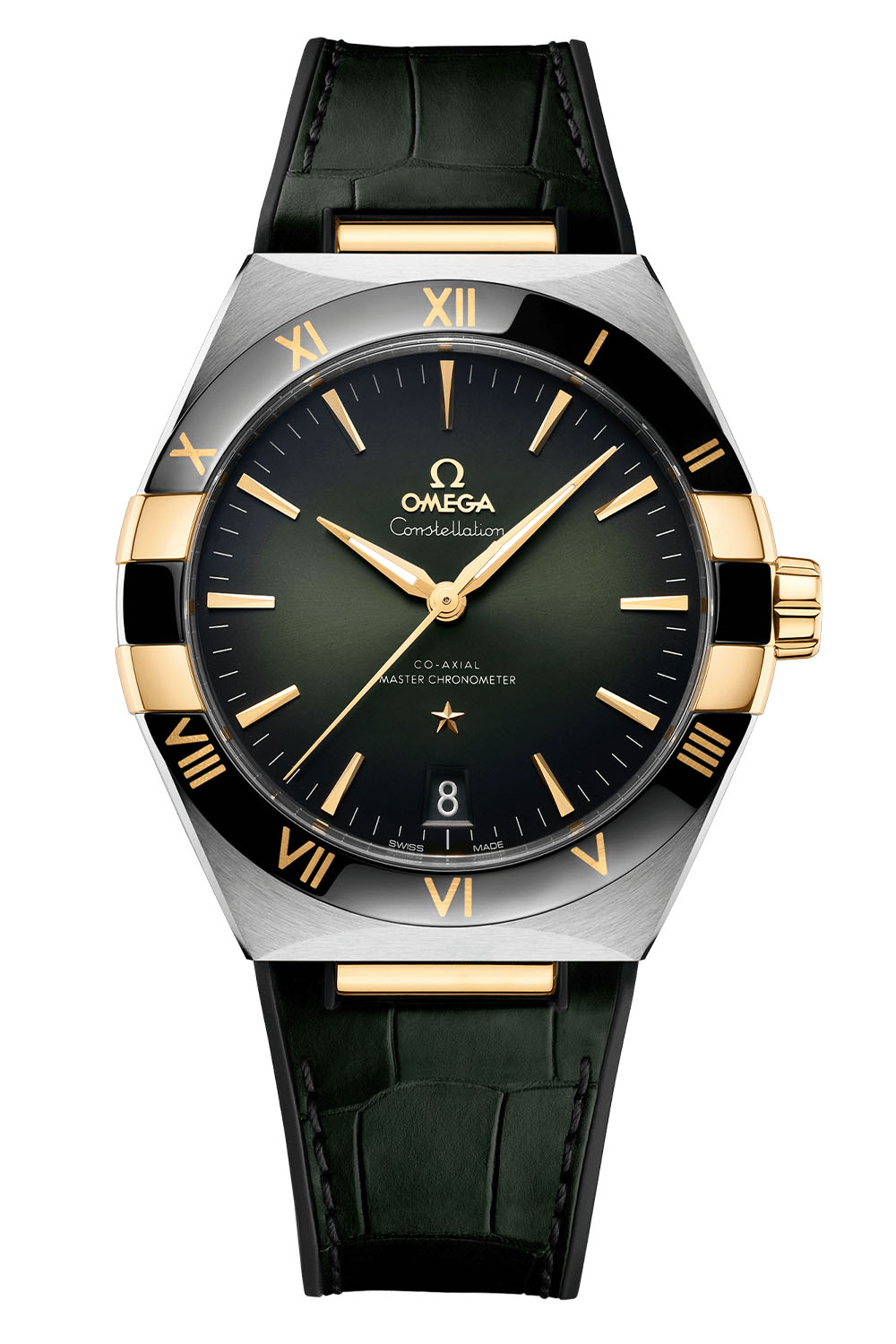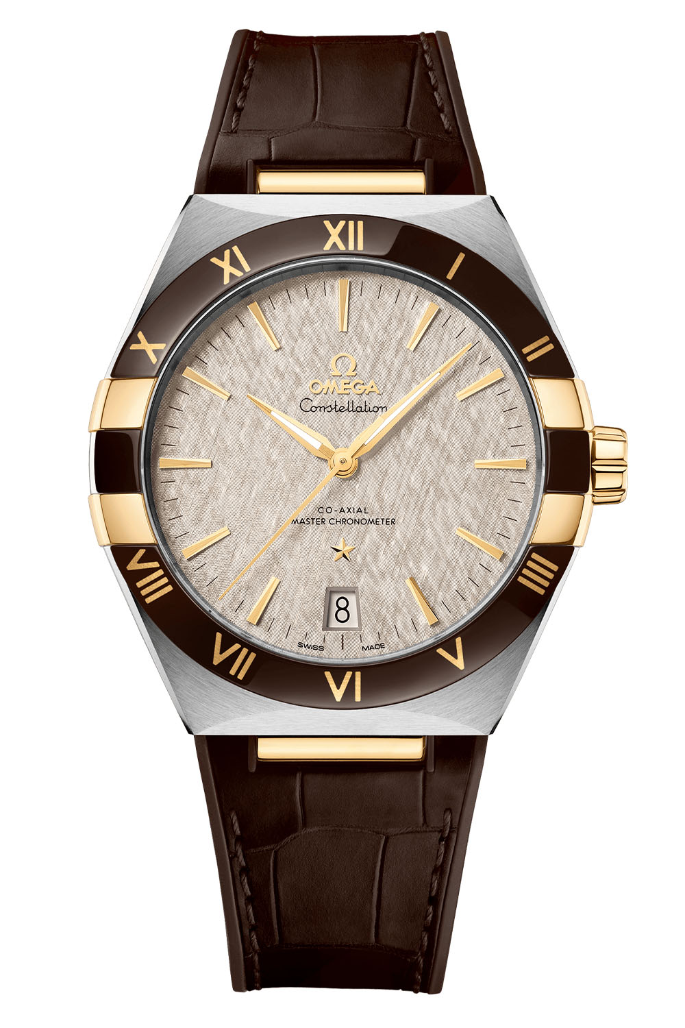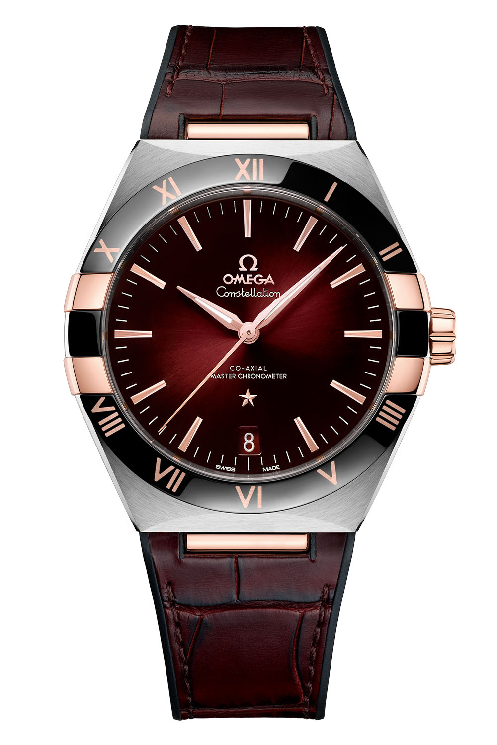 The rest of the collection is all about two-tone cases and colours. First, mixing steel and yellow gold (ref. 131.23.41.21.10.001), is a pleasant edition with a gradient dark green dial with a sunray-brushed pattern, a black ceramic bezel with gold Roman numerals (thanks to the seamless Ceragold technology) and a dark green strap. In the same vein, the brand has created a burgundy Omega Constellation 41mm (ref. 131.23.41.21.11.001) that mixes steel with 18k Sedna gold, a gradient dark red brushed dial, a black bezel with gold numerals and a burgundy strap. Finally, the last option (ref. 131.23.41.21.06.002) also mixes steel and yellow gold, this time with a patterned rhodium-grey dial. This edition features a brown ceramic bezel and strap.