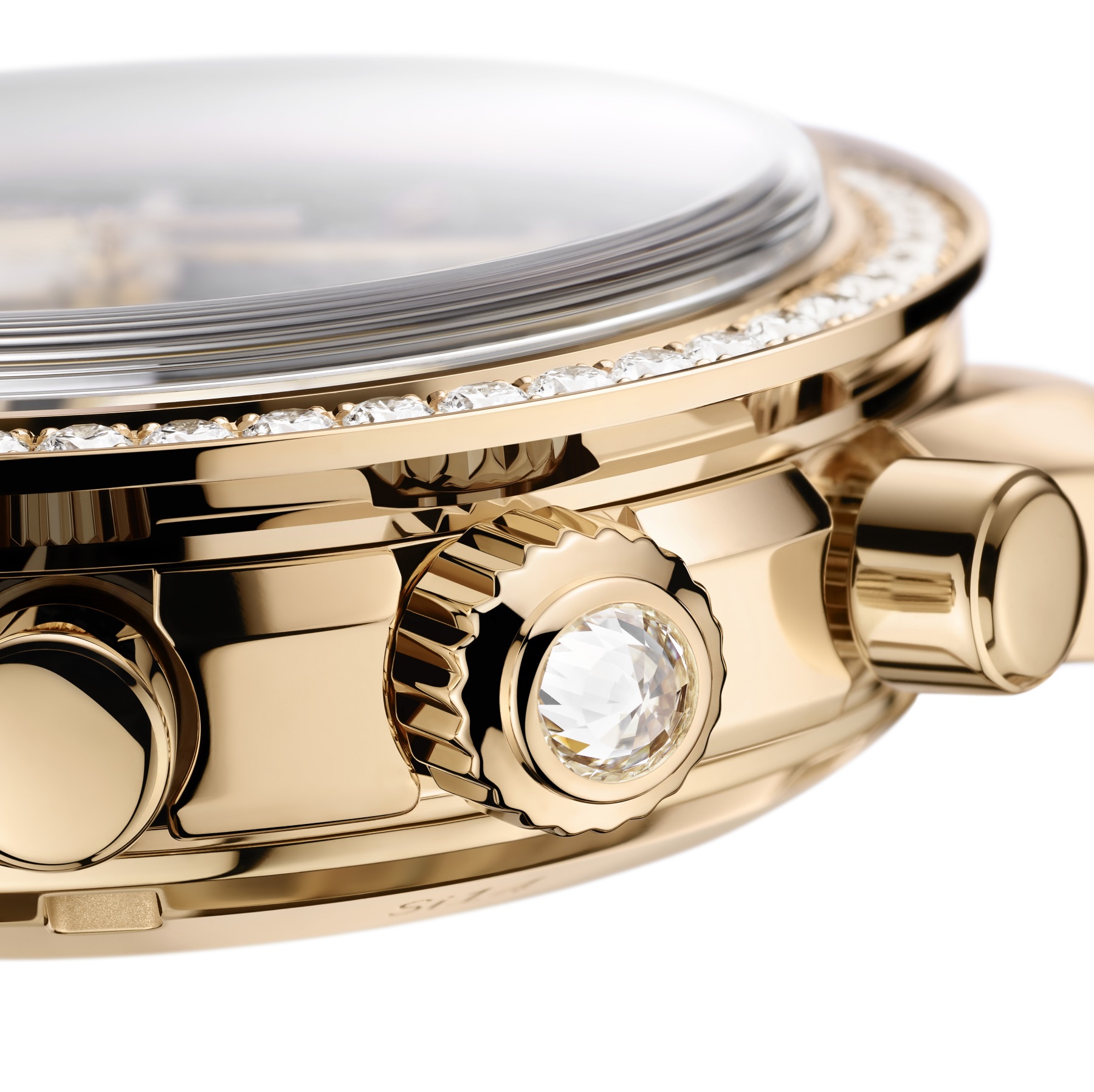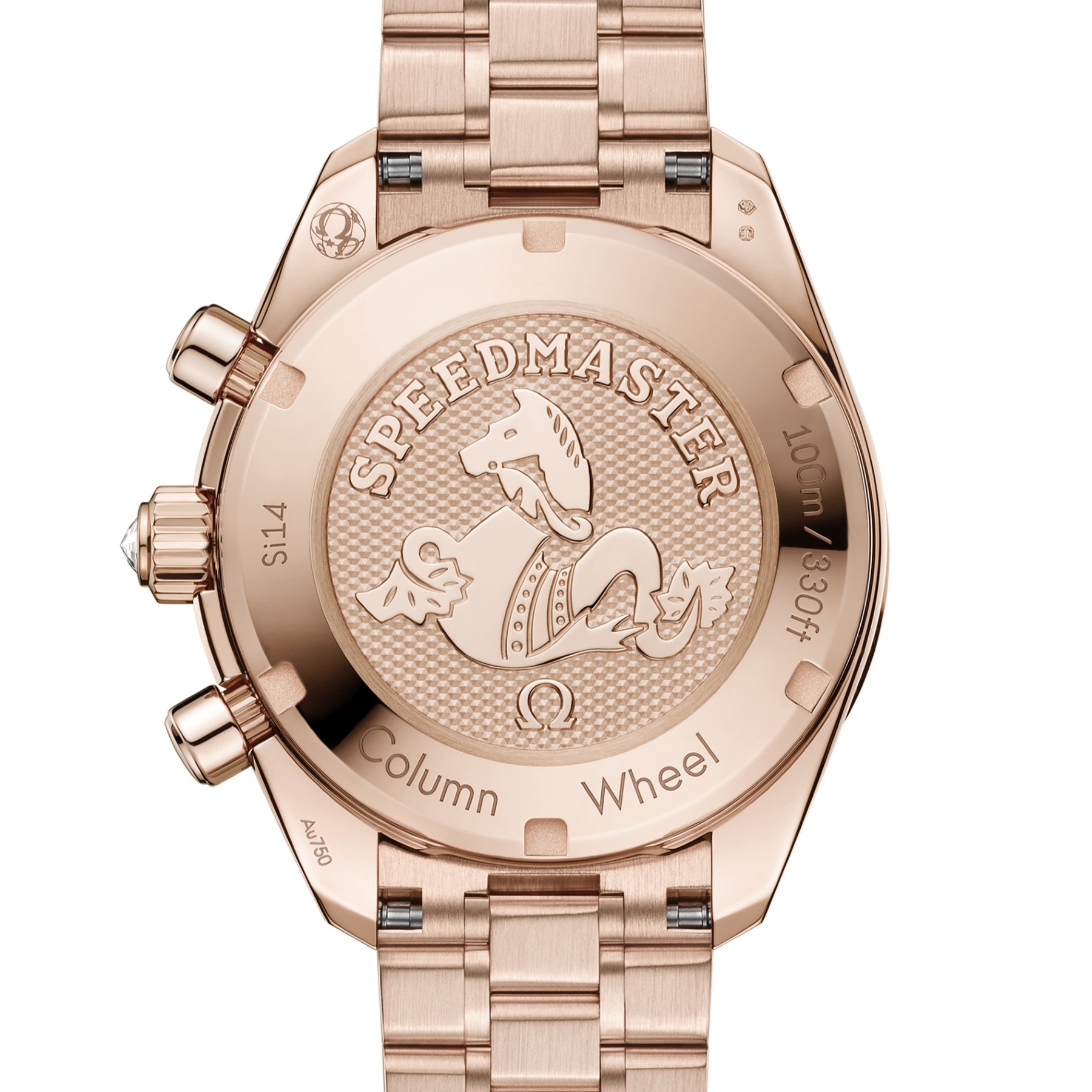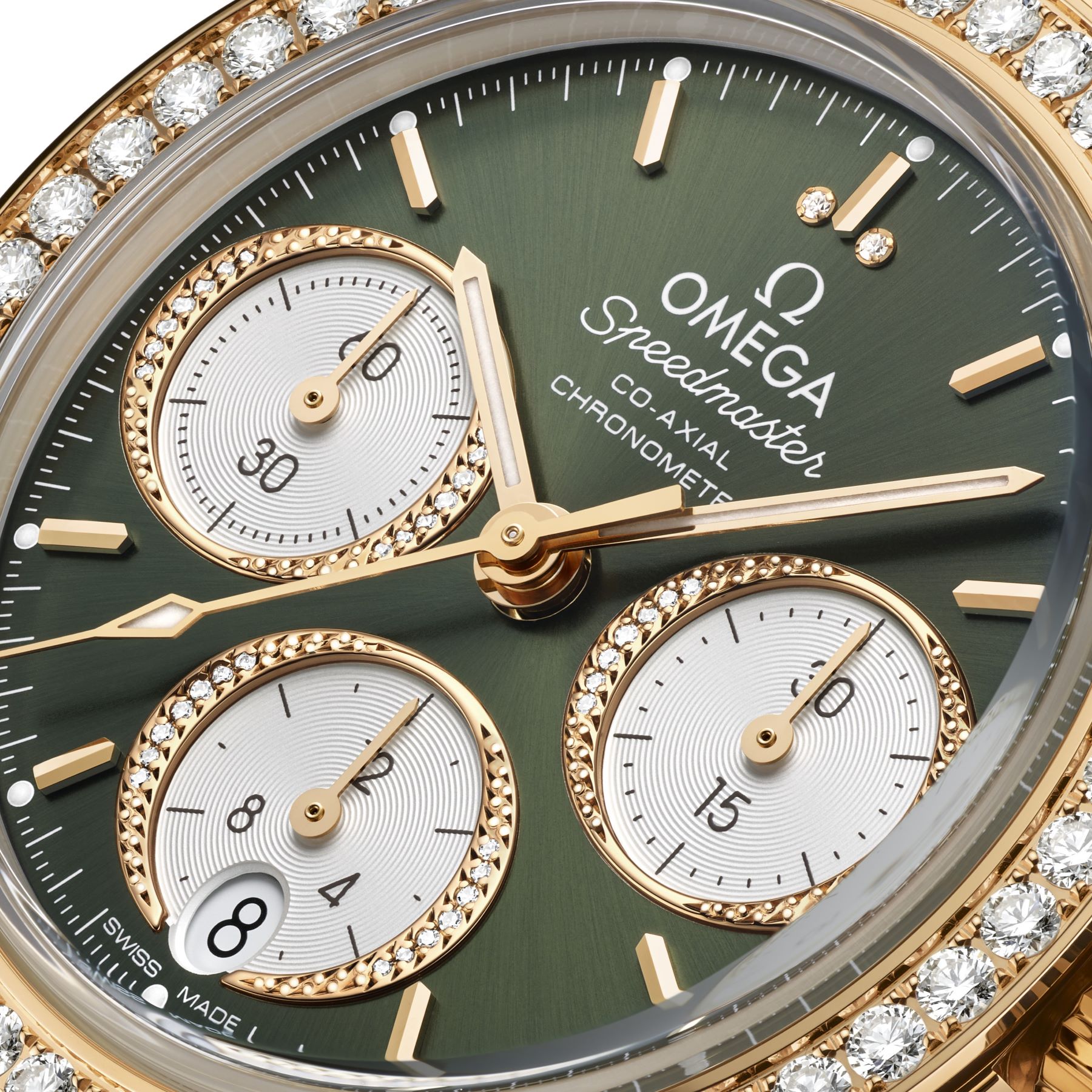 The Speedmaster 38mm made its debut in 2017. Among the most popular iterations of this smaller Speedmaster is the Cappuccino in 18K Sedna™ Gold, with horizontal brown oval subdials and vertical oval date window at 6 o’clock. This year, Omega expands the collection with 8 new sparkling versions set with diamonds and a choice of 2 dial colours. The luxurious setting of these new iterations includes a paved bezel (~1.5 carats), diamond-ringed subdials and a diamond-set crown.