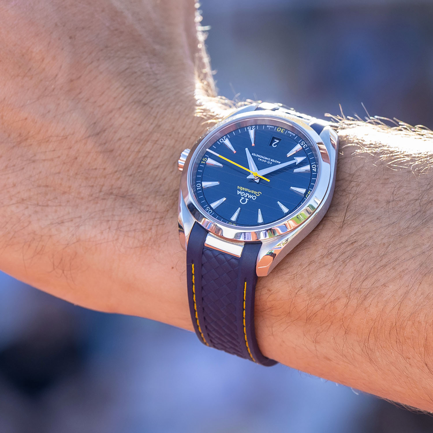 What makes this Armand Duplantis edition special is the dial. While the blue surface is given a traditional opaline finish with horizontal stripes, the unique tributes to Mondo include a Seamaster name and quarter-hour numbers in yellow, as well as a yellow varnished seconds hand with a pole vault-inspired shape, featuring Super-LumiNova on top to represent the grip of the pole. All other elements of the dial are otherwise classic Aqua Terra.